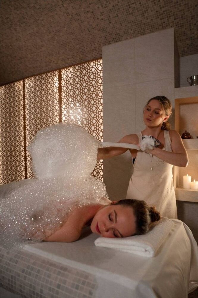 Погрузитесь в мир восточного блаженства: отдых в акватермальной зоне с хамамом, джакузи, сауной и баром подготовит тело к глубокому очищению. Деликатный пилинг рукавицей Кессе подарит коже невероятную гладкость, а мыльно-пенный массаж окутает вас облаком ароматной пены и чувством невесомости. Вы уйдёте с шёлковой кожей, лёгкостью во всём теле и ощущением, будто только что вернулись из долгожданных турецких каникул.