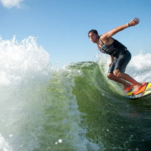 Вейксерфинг - это катание на доске по волнам, идущим от катера. Процесс движения прост: в момент старта райдер находится в воде и держится за фал. Катер придает ему необходимую скорость, после чего райдер отпускает веревку и продолжает скользить по волне.