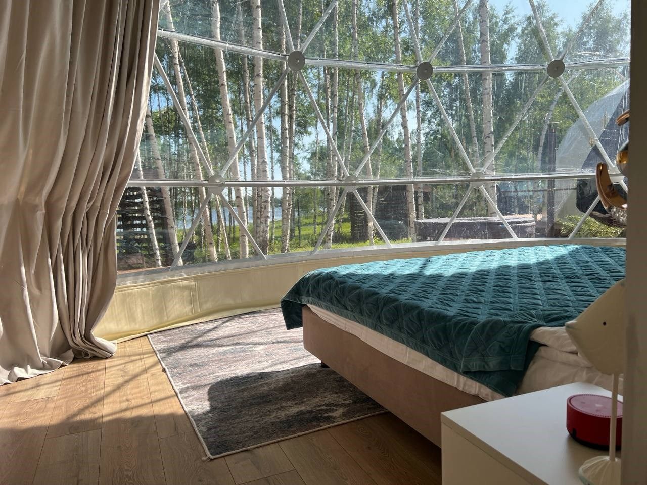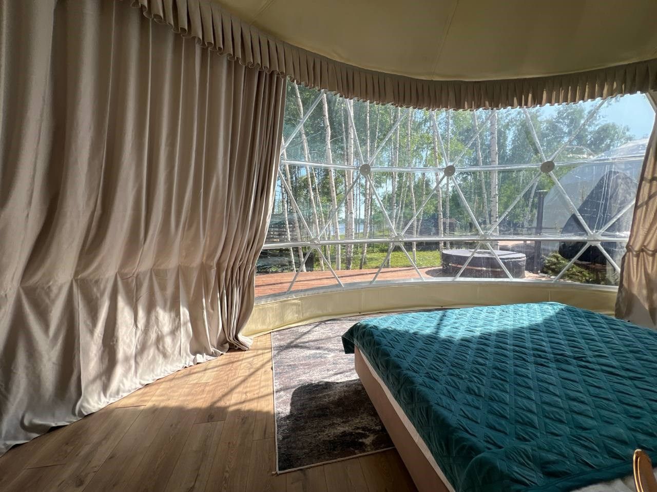 Купольный дом 8 метров диаметром, высота потолков 4,6 метра. Сфера дом оборудованный всем необходимым для отдыха и проживания. Кровать King Size у панорамного окна. Полноценная кухня с посудомоечной машиной и холодильников.