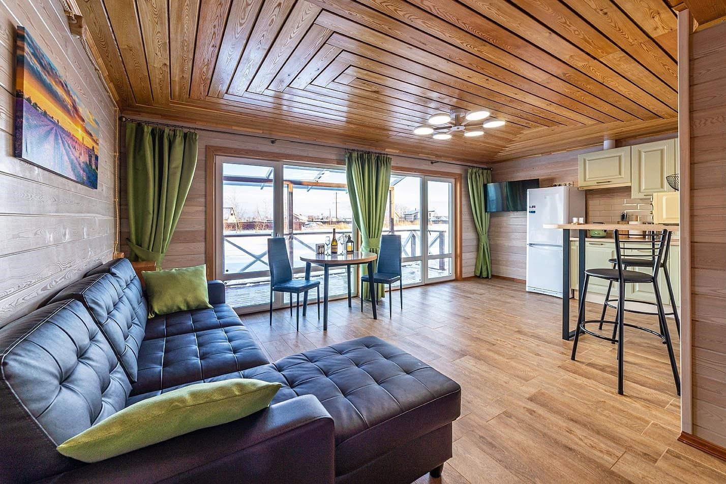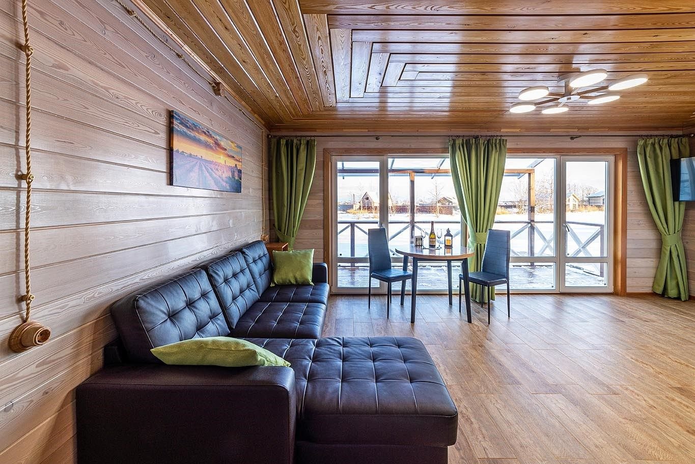 Просторная гостиная с панорамным окном на озеро