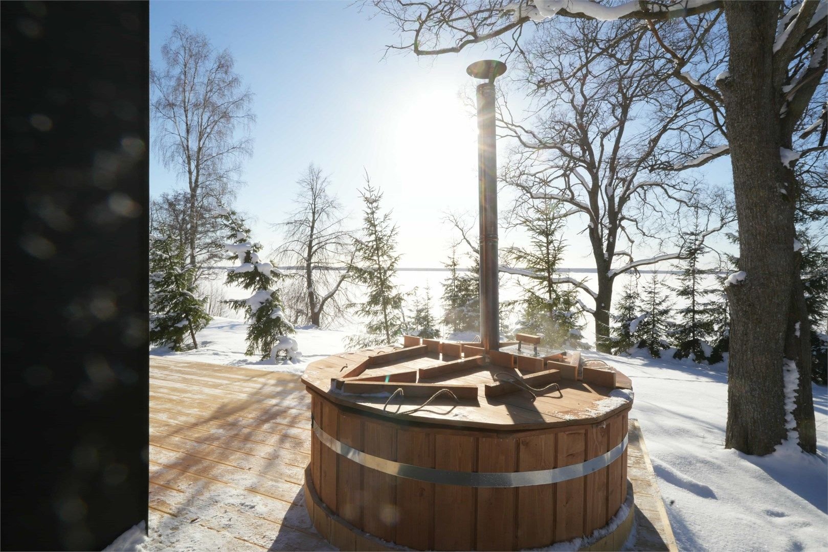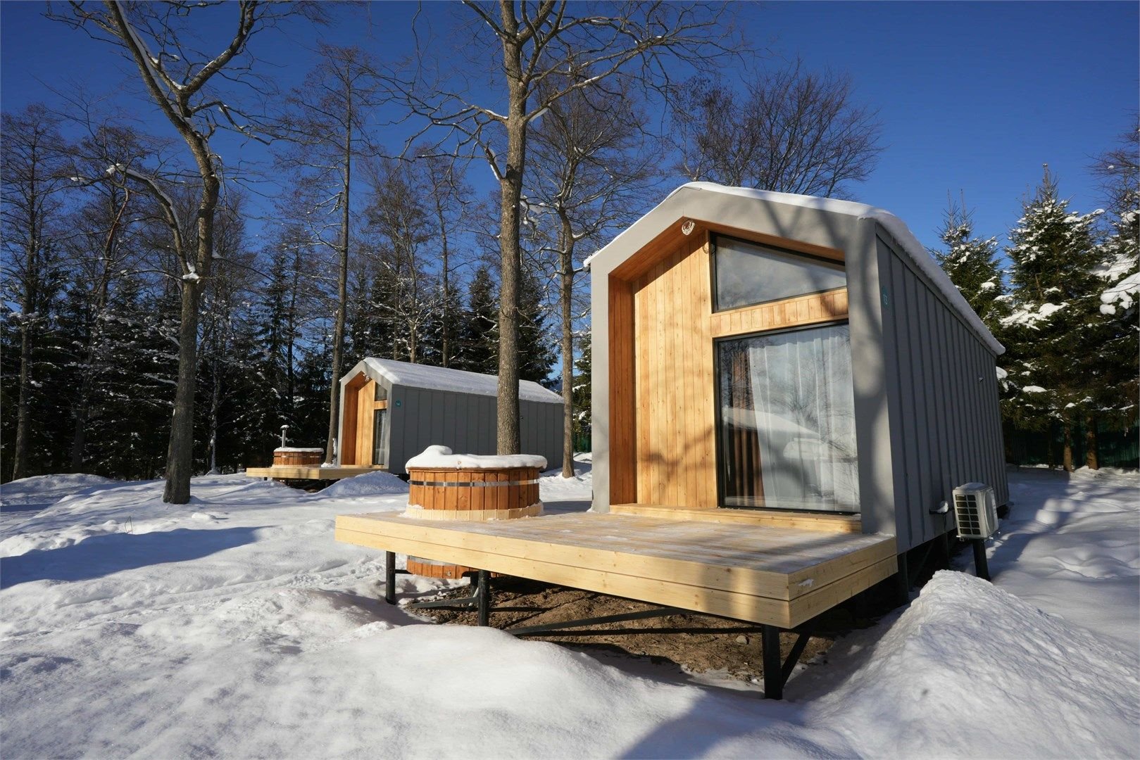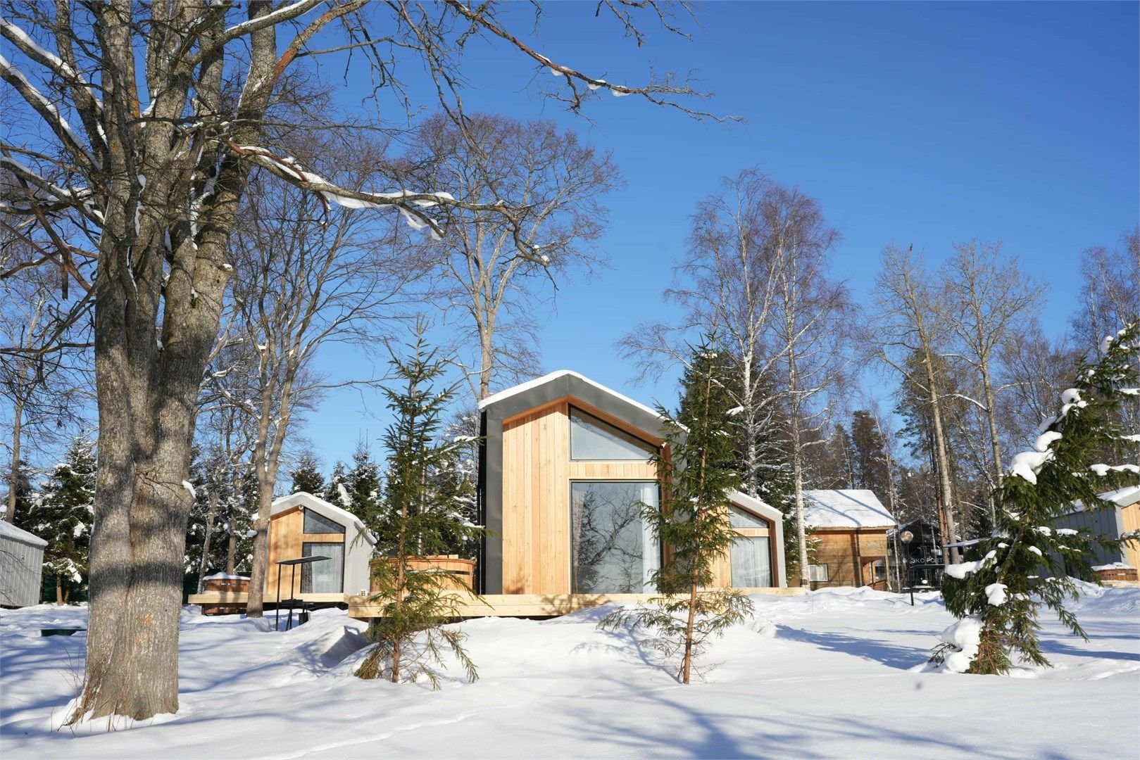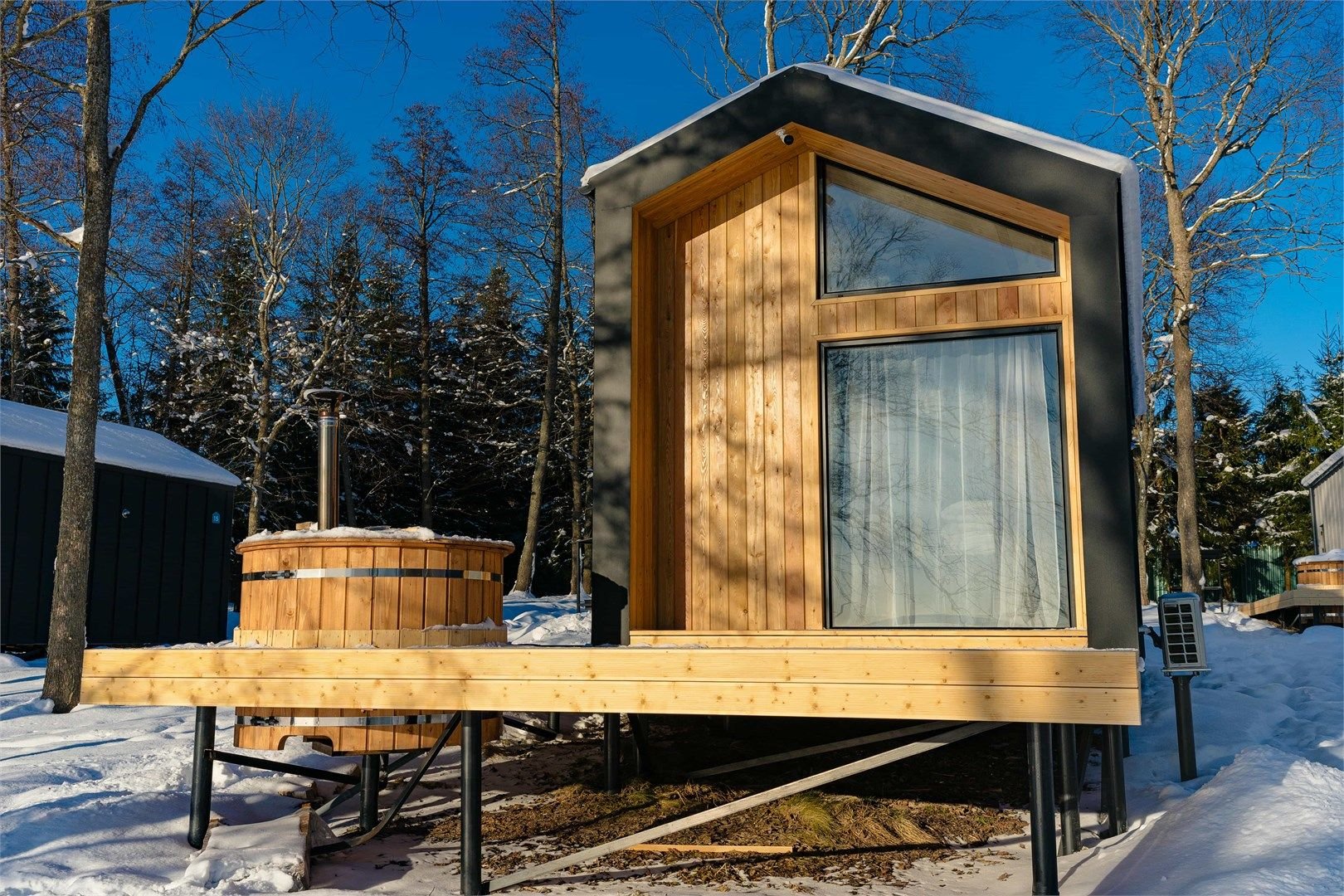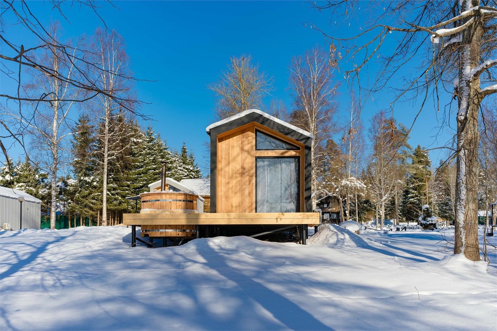 Для гостей подготовлены уютные барнхаусы с мини-кухней, двуспальной кроватью, раскладным диваном, современной ванной и собственной купелью на террасе.