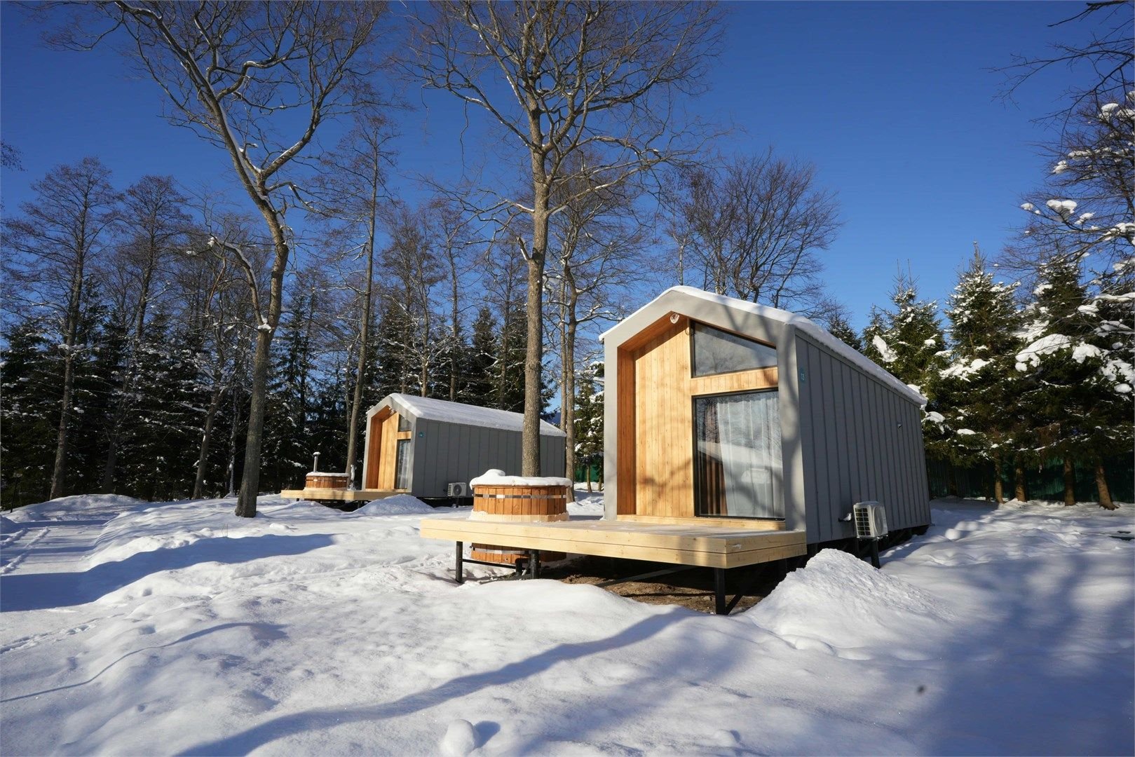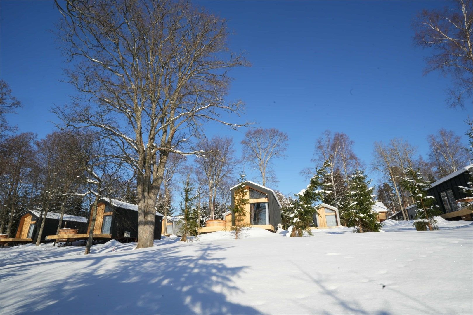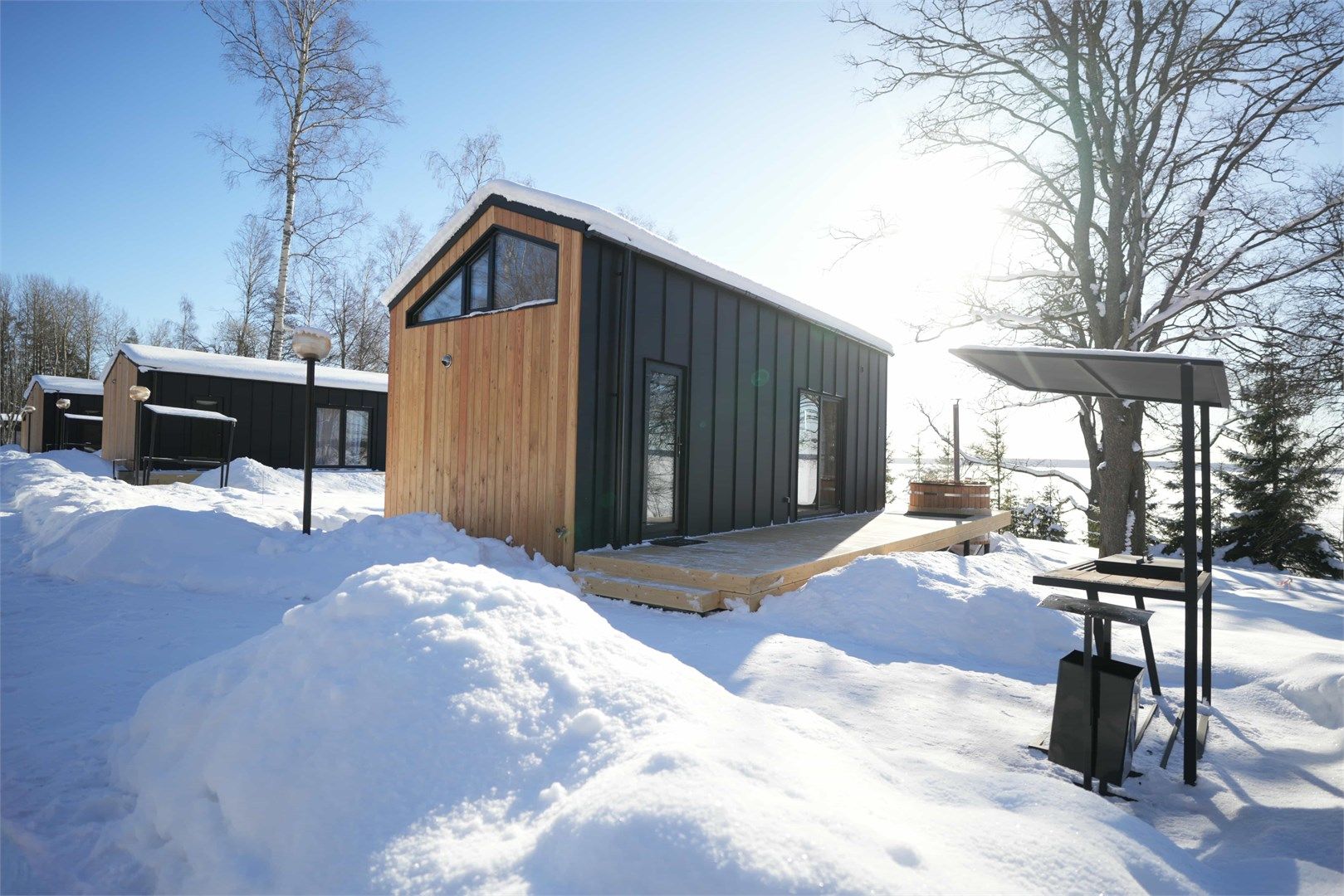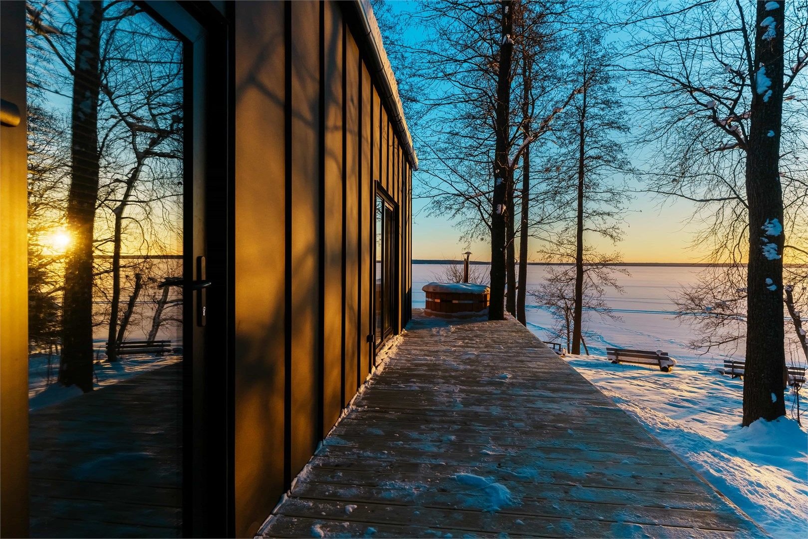 Для гостей подготовлены уютные барнхаусы с мини-кухней, двуспальной кроватью, раскладным диваном, современной ванной и собственной купелью на террасе.