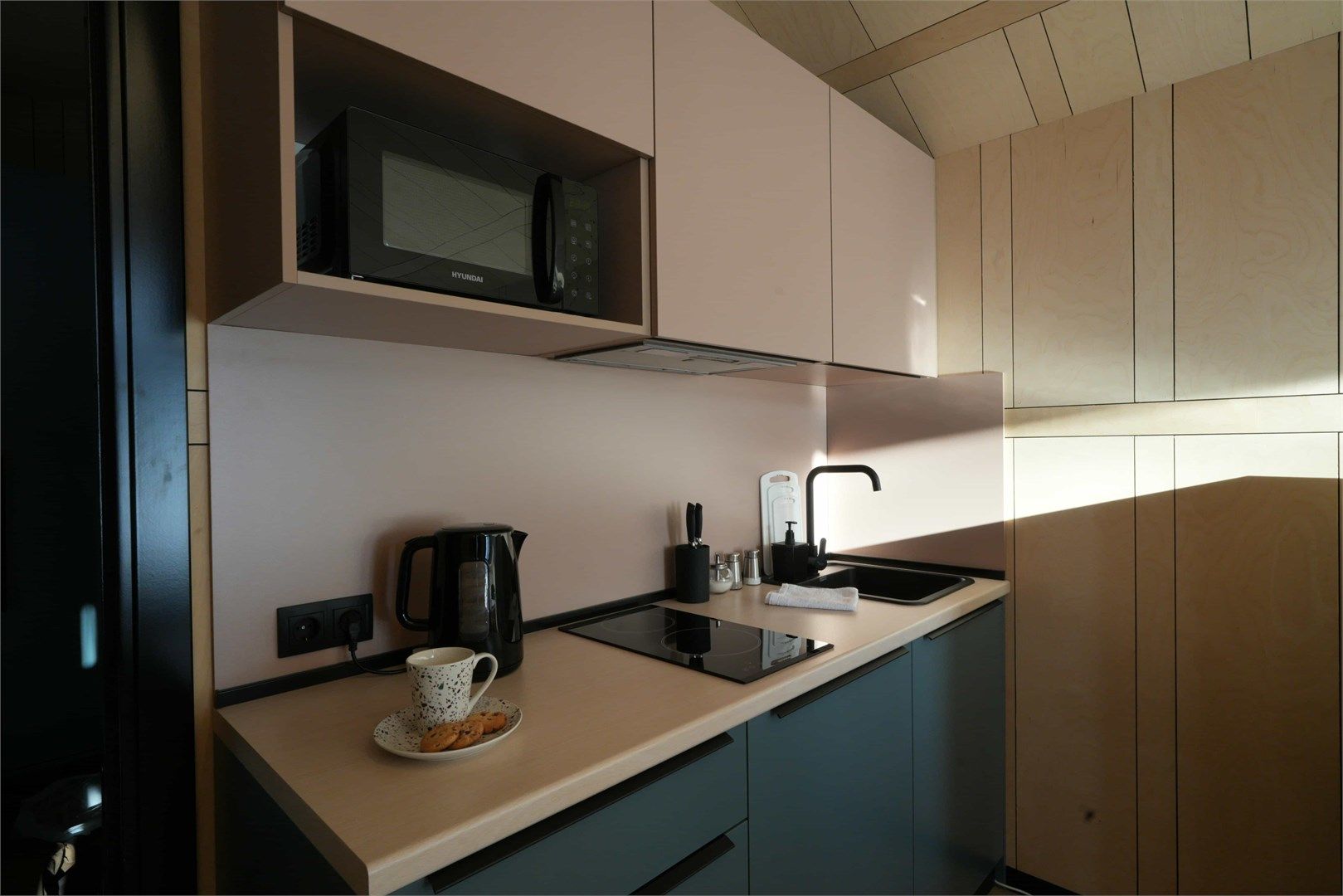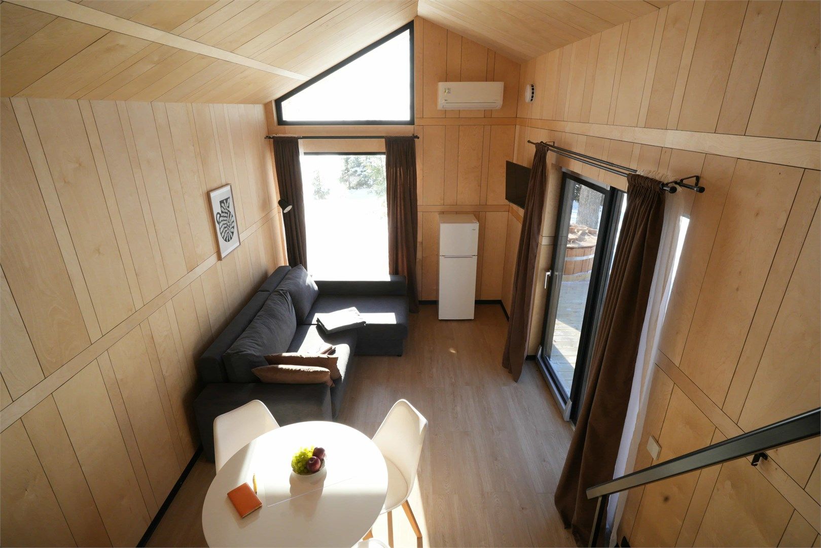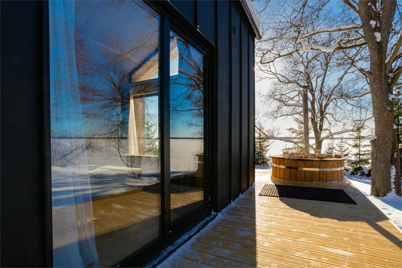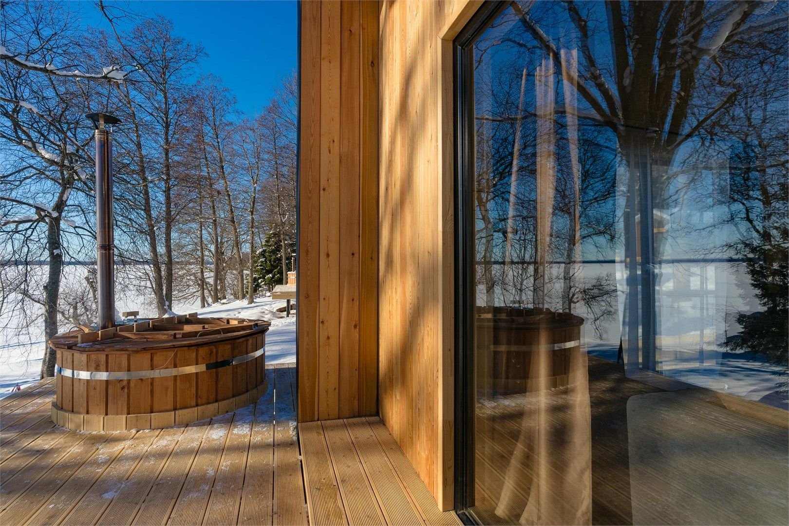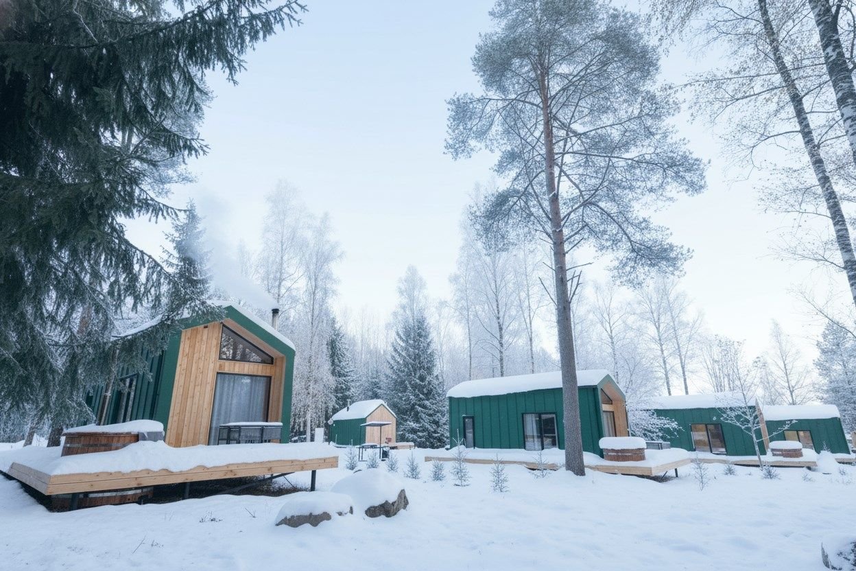 Для гостей подготовлены уютные барнхаусы с мини-кухней, двуспальной кроватью, раскладным диваном, современной ванной и собственной купелью на террасе.