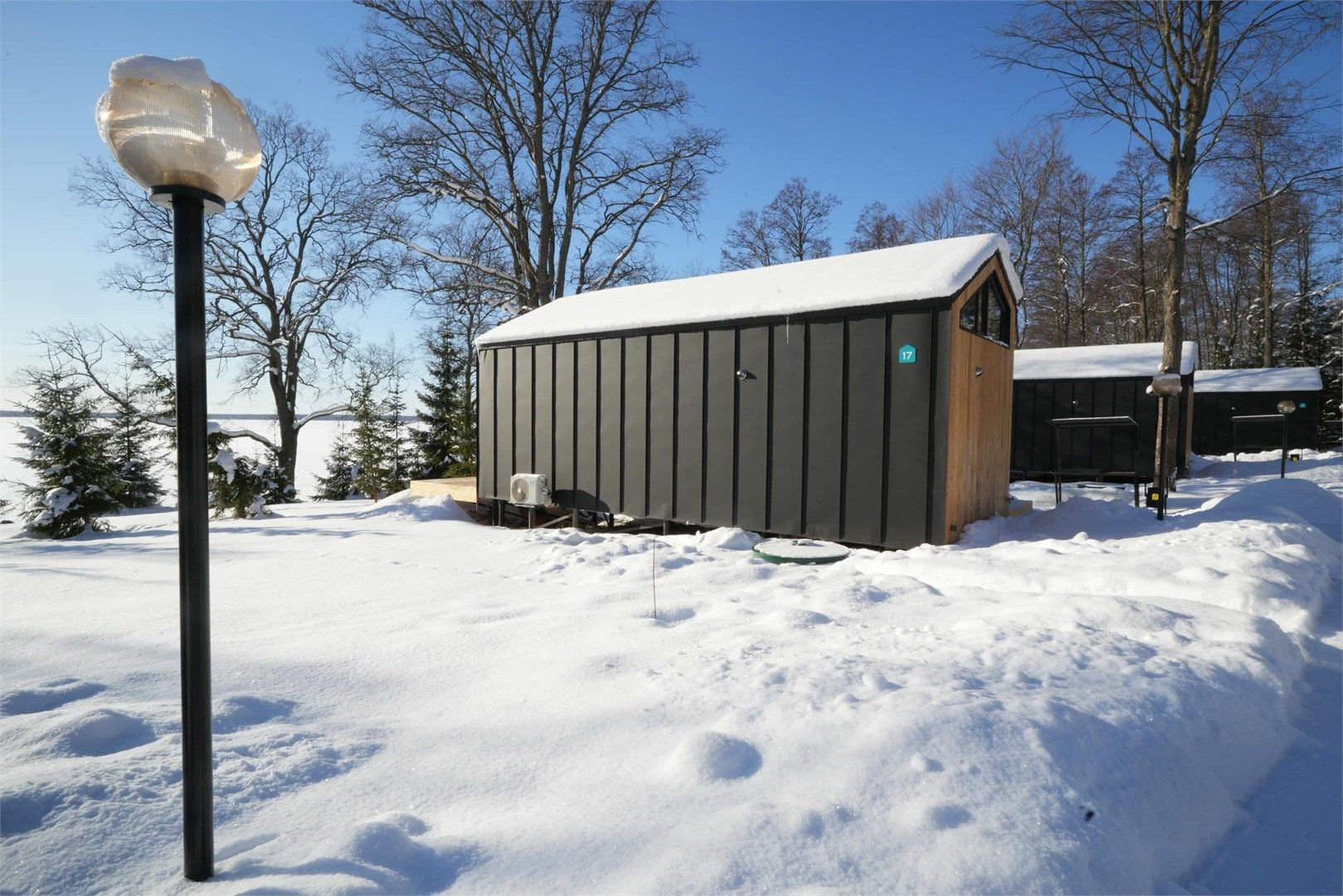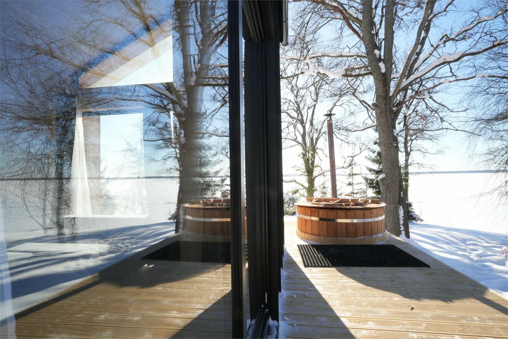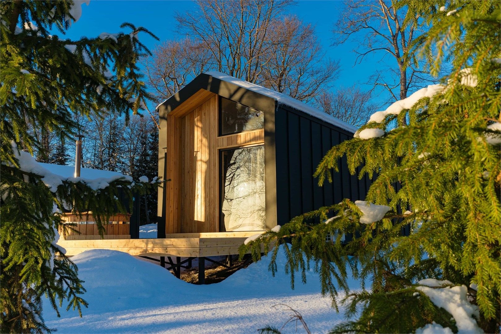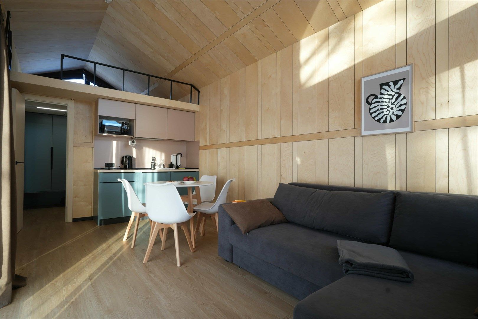 Для гостей подготовлены уютные барнхаусы с мини-кухней, двуспальной кроватью, раскладным диваном, современной ванной и собственной купелью на террасе.