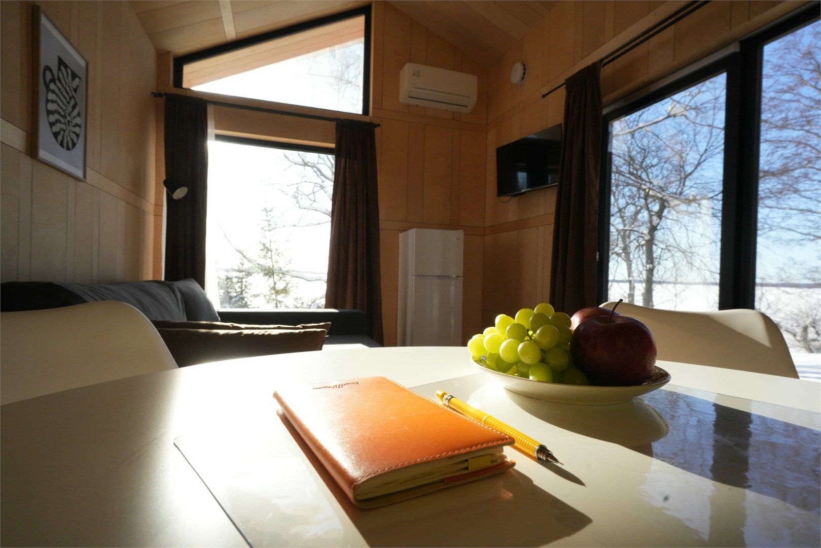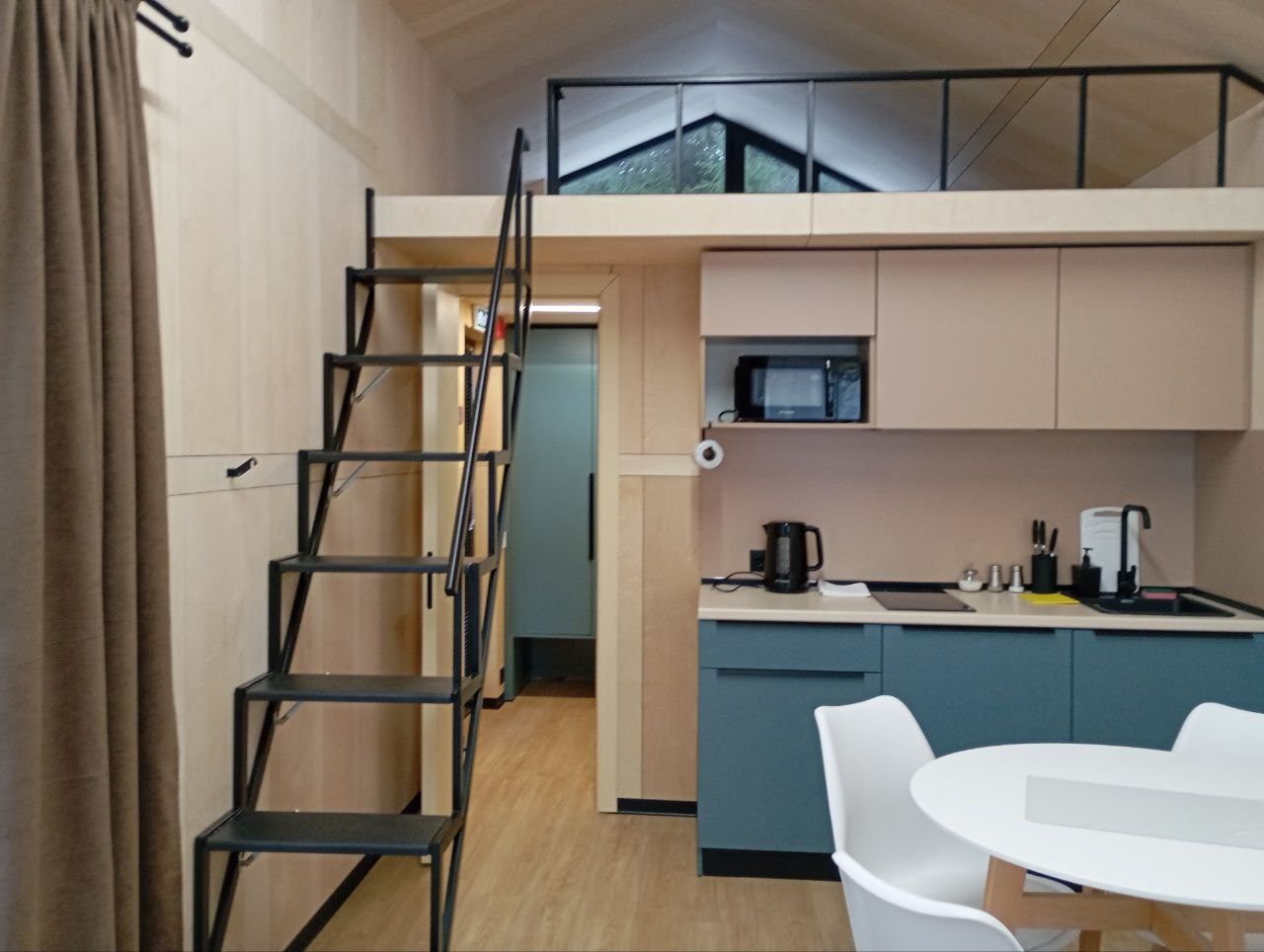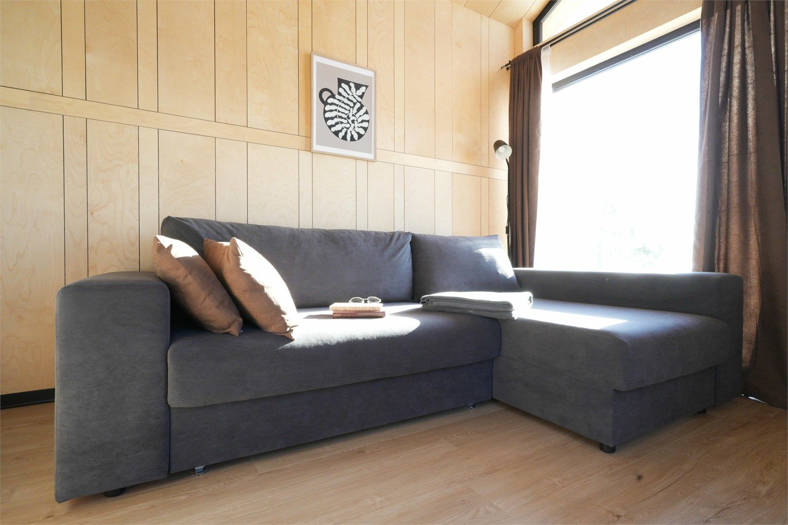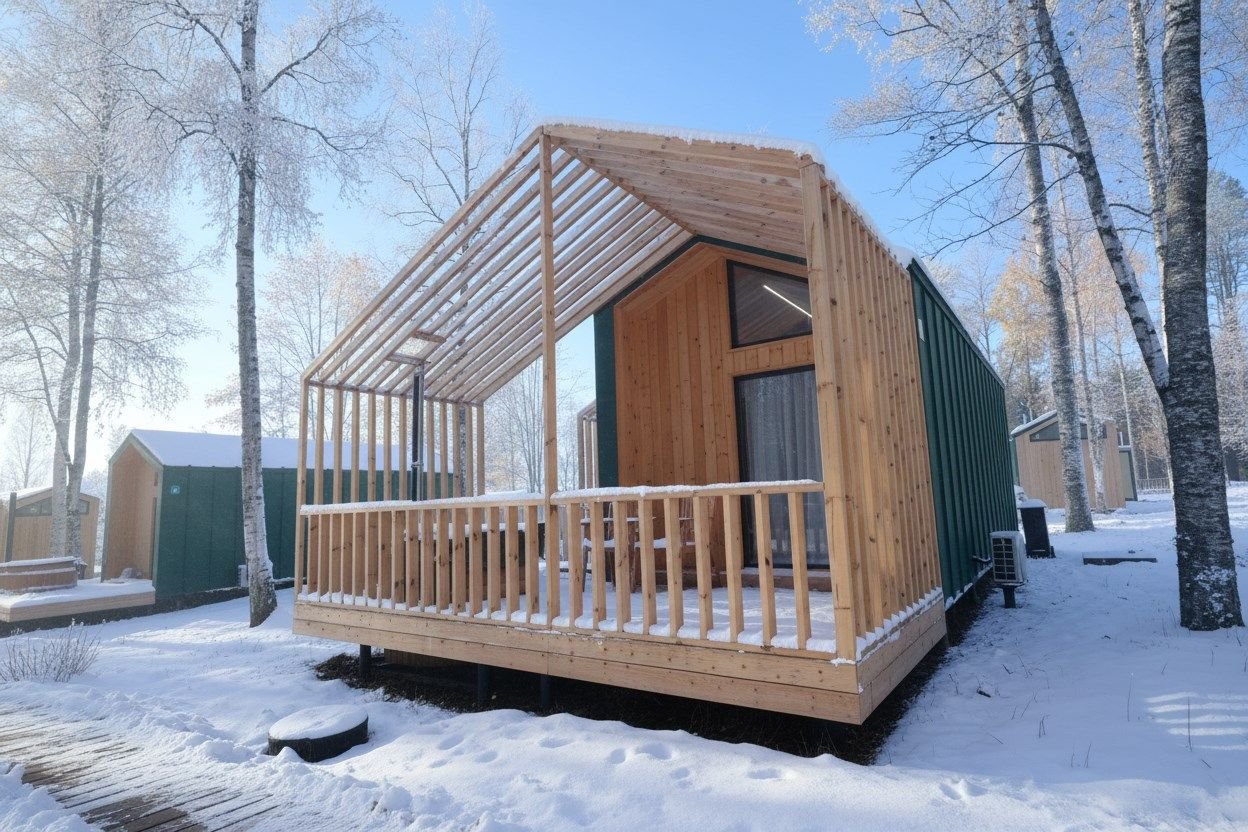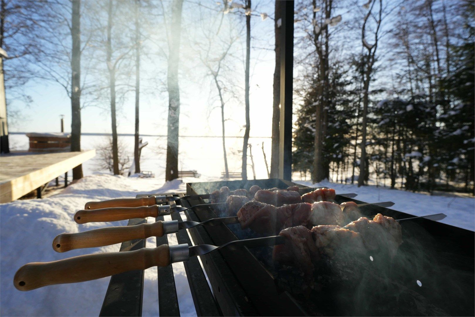 Для гостей подготовлены уютные барнхаусы с мини-кухней, двуспальной кроватью, раскладным диваном, современной ванной и собственной купелью на террасе.