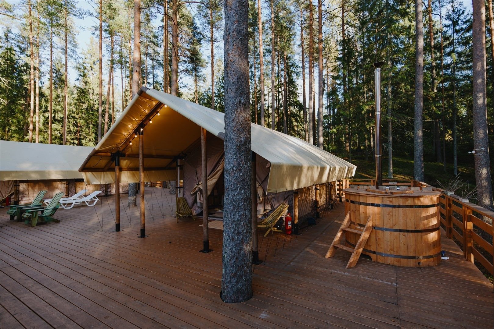 «Лесной» — сафари-лодж для двоих в глэмп-отеле «Террасы» ( 1 топка купели входит в пакет проживания от 2-х ночей), мангальная зона и вид на сосновый лес