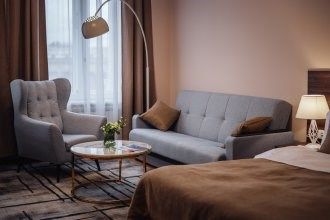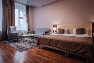 Самый роскошный номер Люкс с собственным балконом и фронтальным видом на Казанский собор делает его главным украшением отеля. Площадь номера - 50 кв. м., расположен на четвертом этаже. В номере отлично сочетаются классический стиль интерьера и современный комфорт. Здесь есть все необходимое для комфортного проживания - спальная зона с кроватью king size, гостиная зона с уютным диваном и креслам...