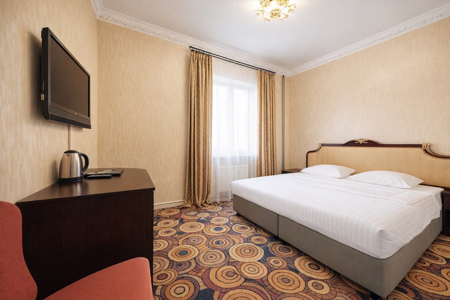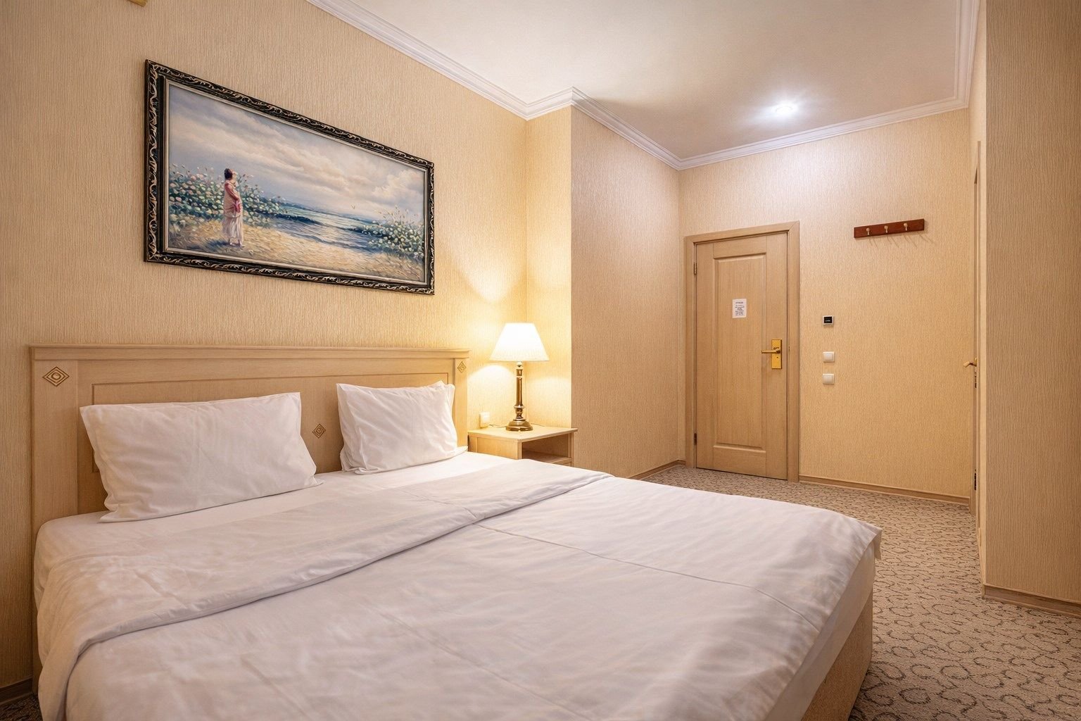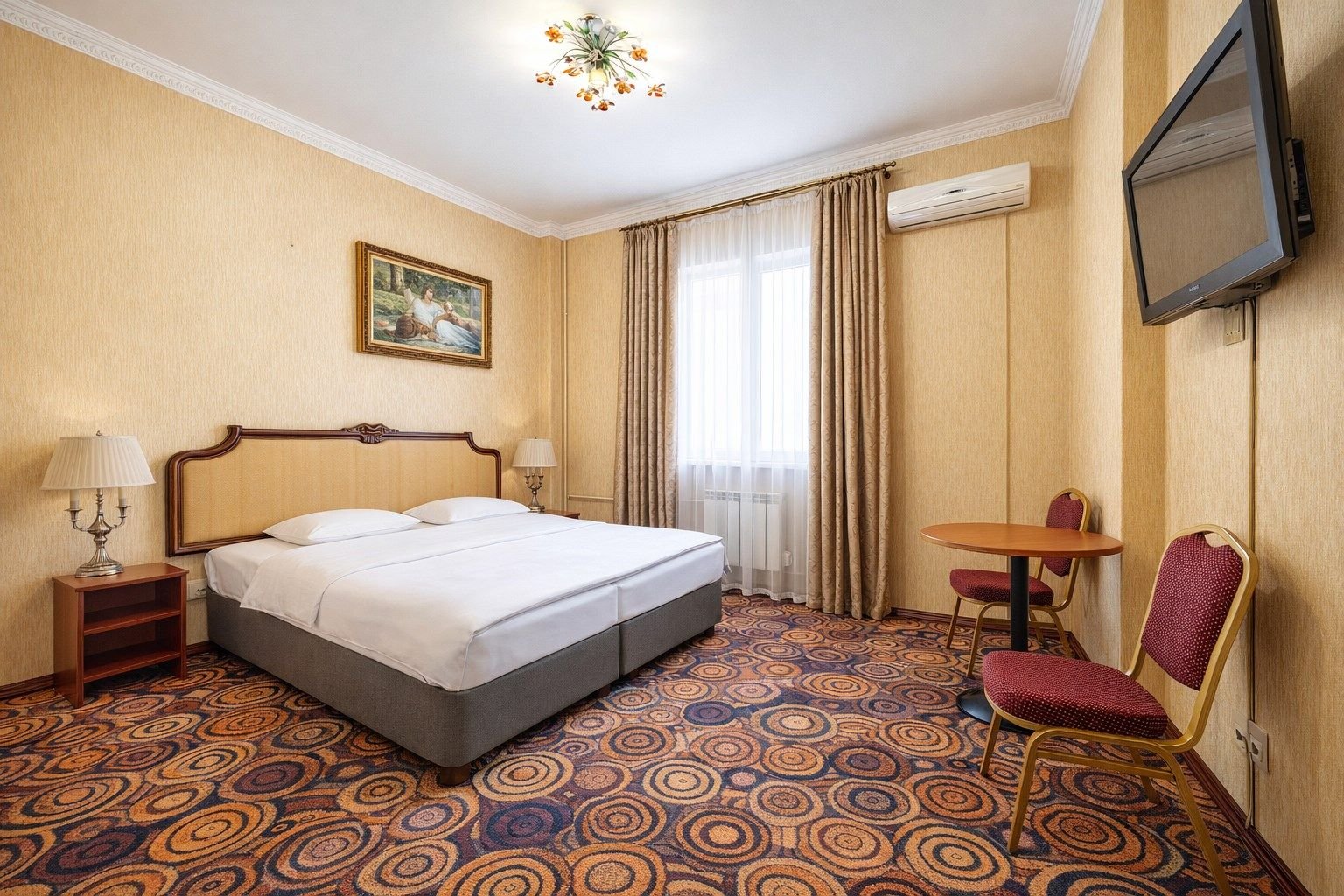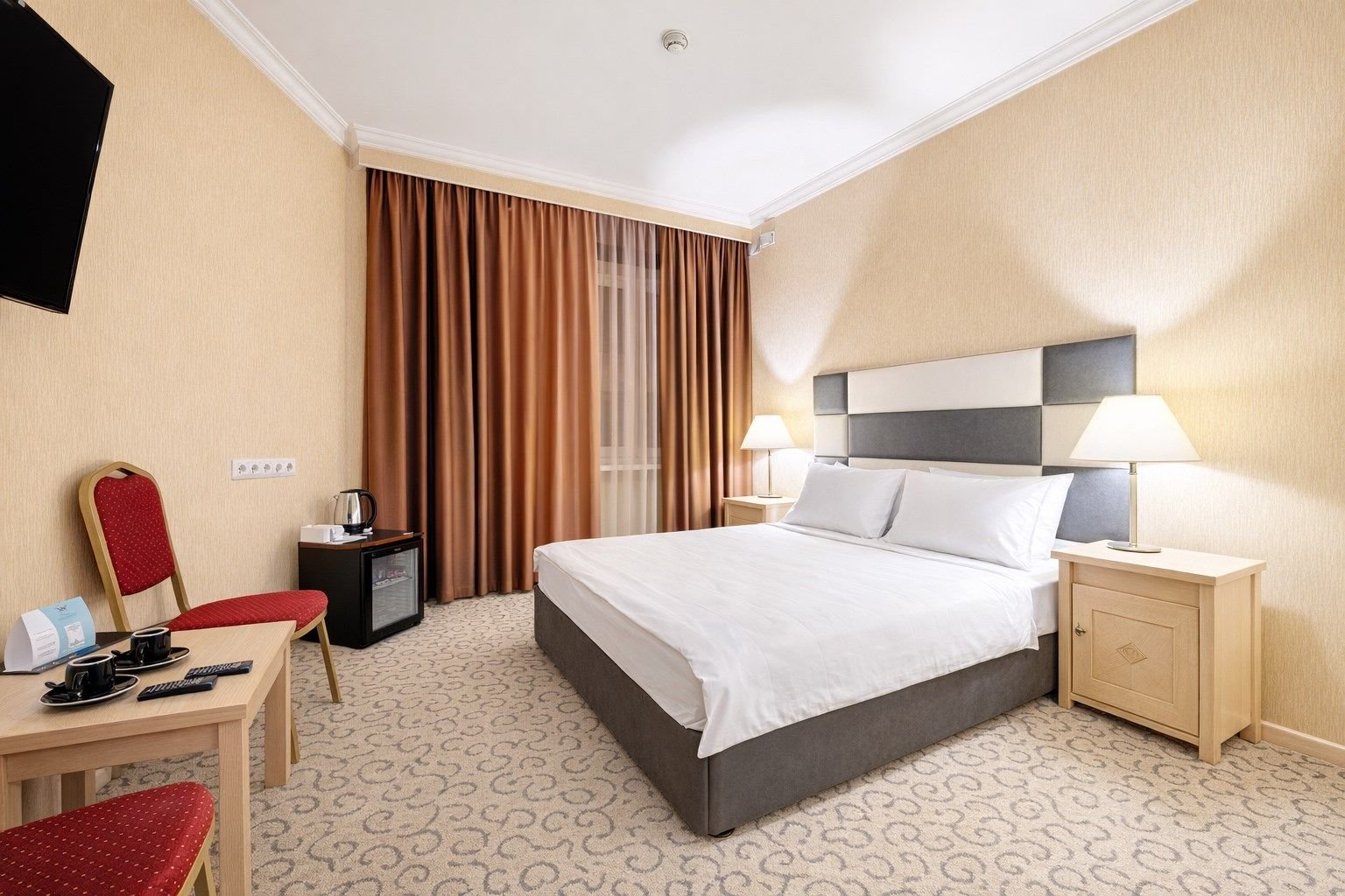 Двухместный номер категории «Стандарт» с одной двуспальной (160см*200см либо 180см*200см) прекрасный вариант для деловой поездки или отдыха пары. Небольшой, но очень комфортный номер отличается стильным интерьером в теплых тонах, которые лишь добавляют уюта, расслабляют и настраивают на отдых. Плазменная панель и доступ к интерактивному спутниковому телевидению разнообразят досуг.
