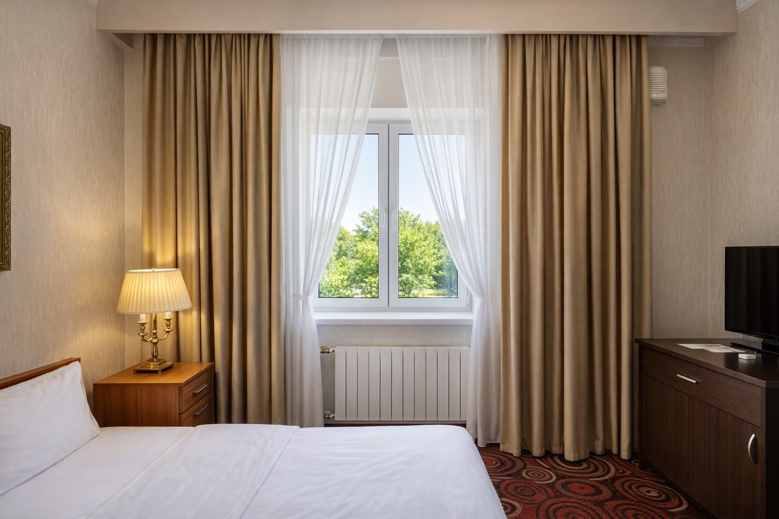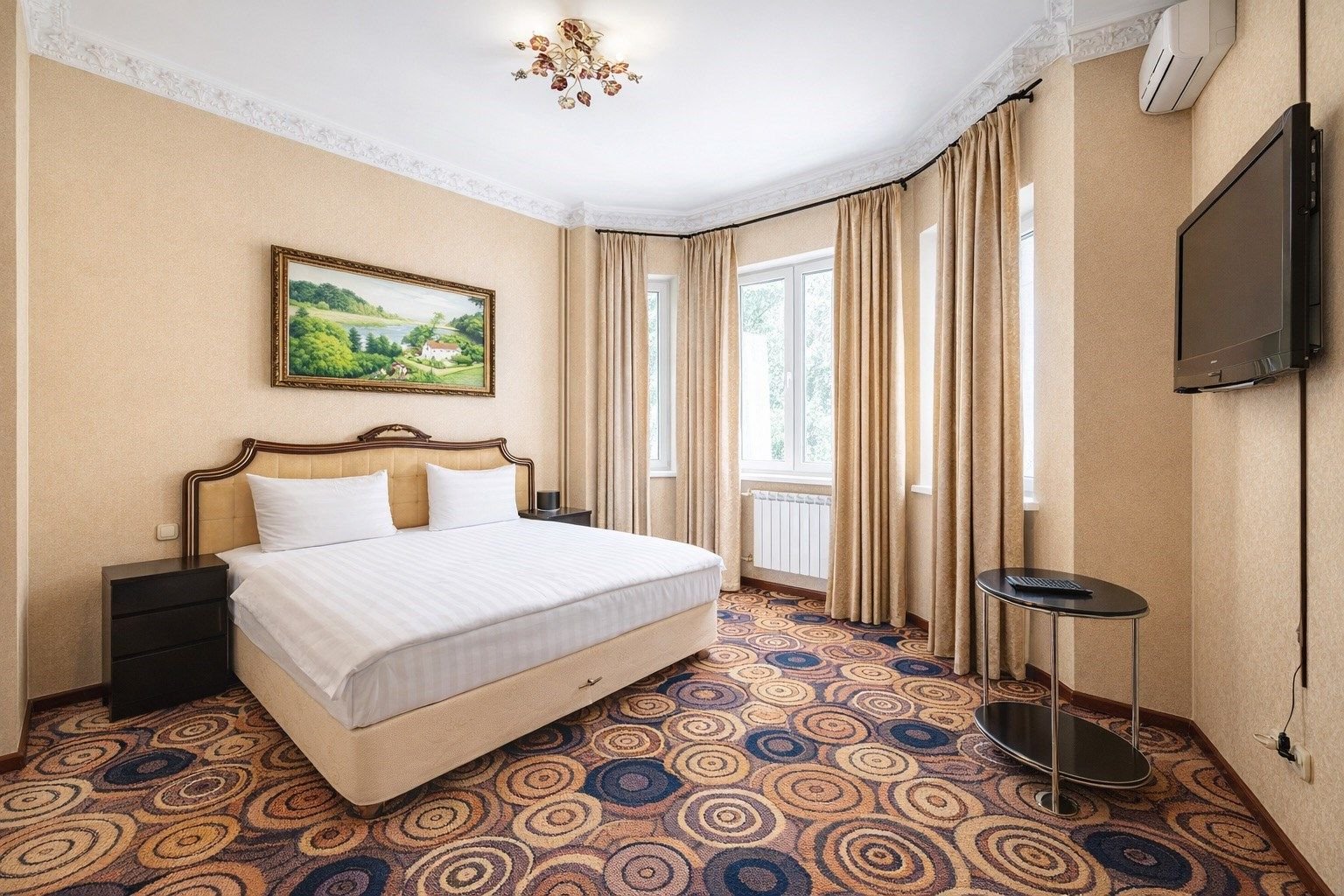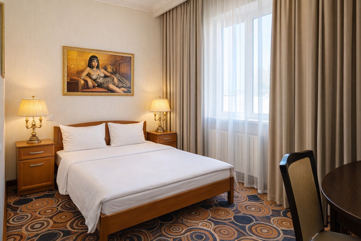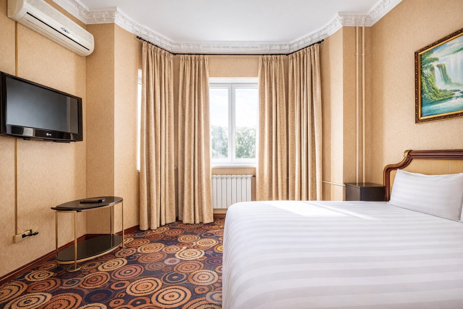 Двухместный номер категории «Стандарт» с одной двуспальной (160см*200см либо 180см*200см) прекрасный вариант для деловой поездки или отдыха пары. Небольшой, но очень комфортный номер отличается стильным интерьером в теплых тонах, которые лишь добавляют уюта, расслабляют и настраивают на отдых. Плазменная панель и доступ к интерактивному спутниковому телевидению разнообразят досуг.