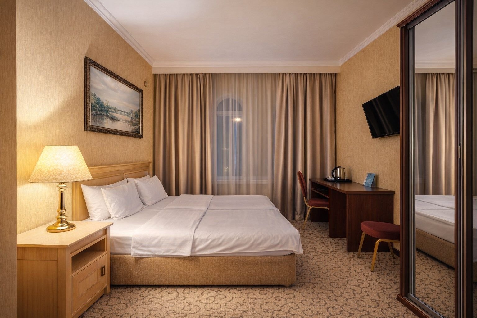 Путешествуете вдвоем? Один из лучших вариантов размещения — комфортный двухместный номер категории «улучшенный». В компактном номере нашлось место не только для комфортной двуспальной кровати с ортопедическим матрасом, но и для полноценной рабочей зоны с удобным столом и высокоскоростным беспроводным интернетом.