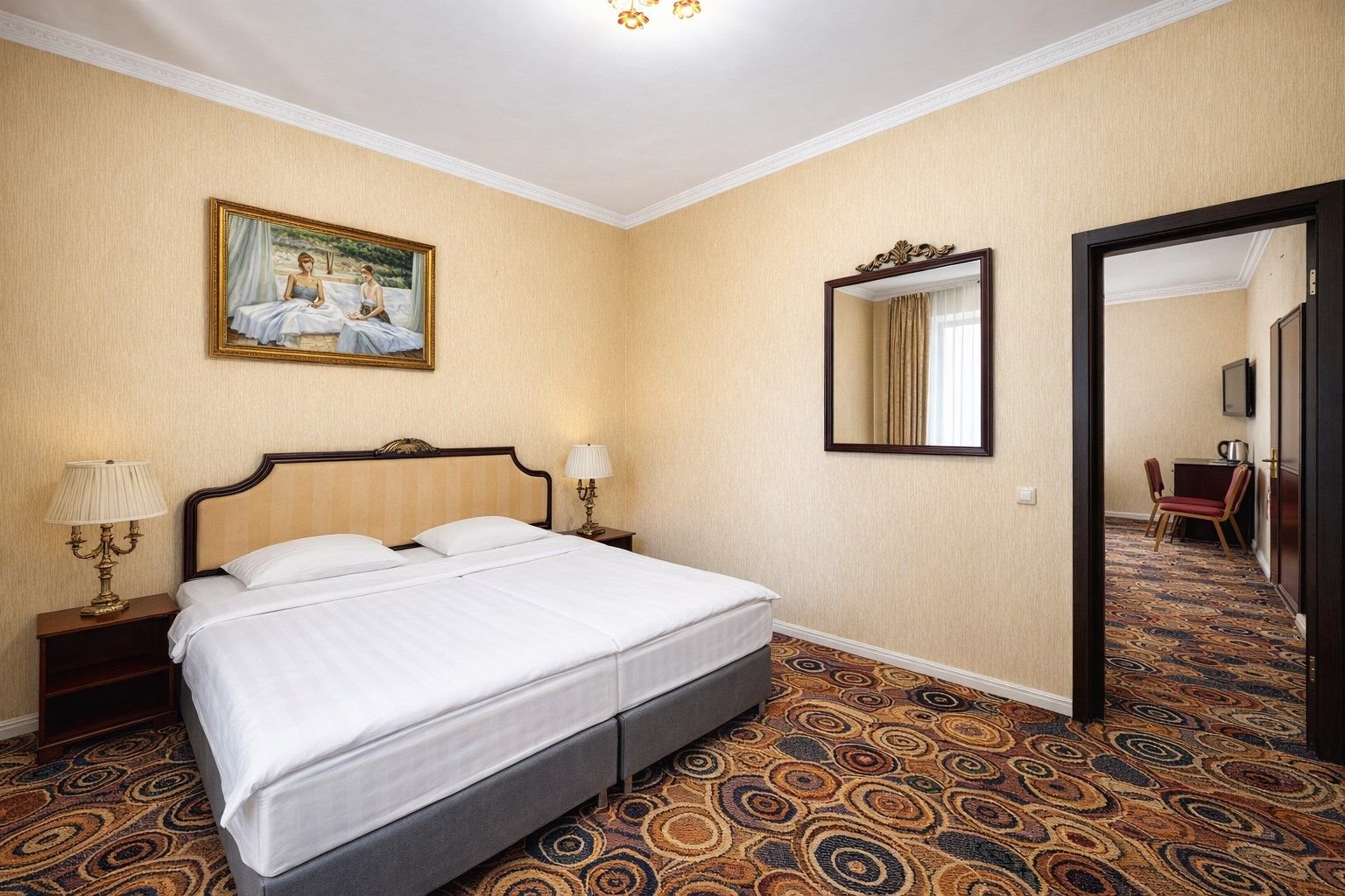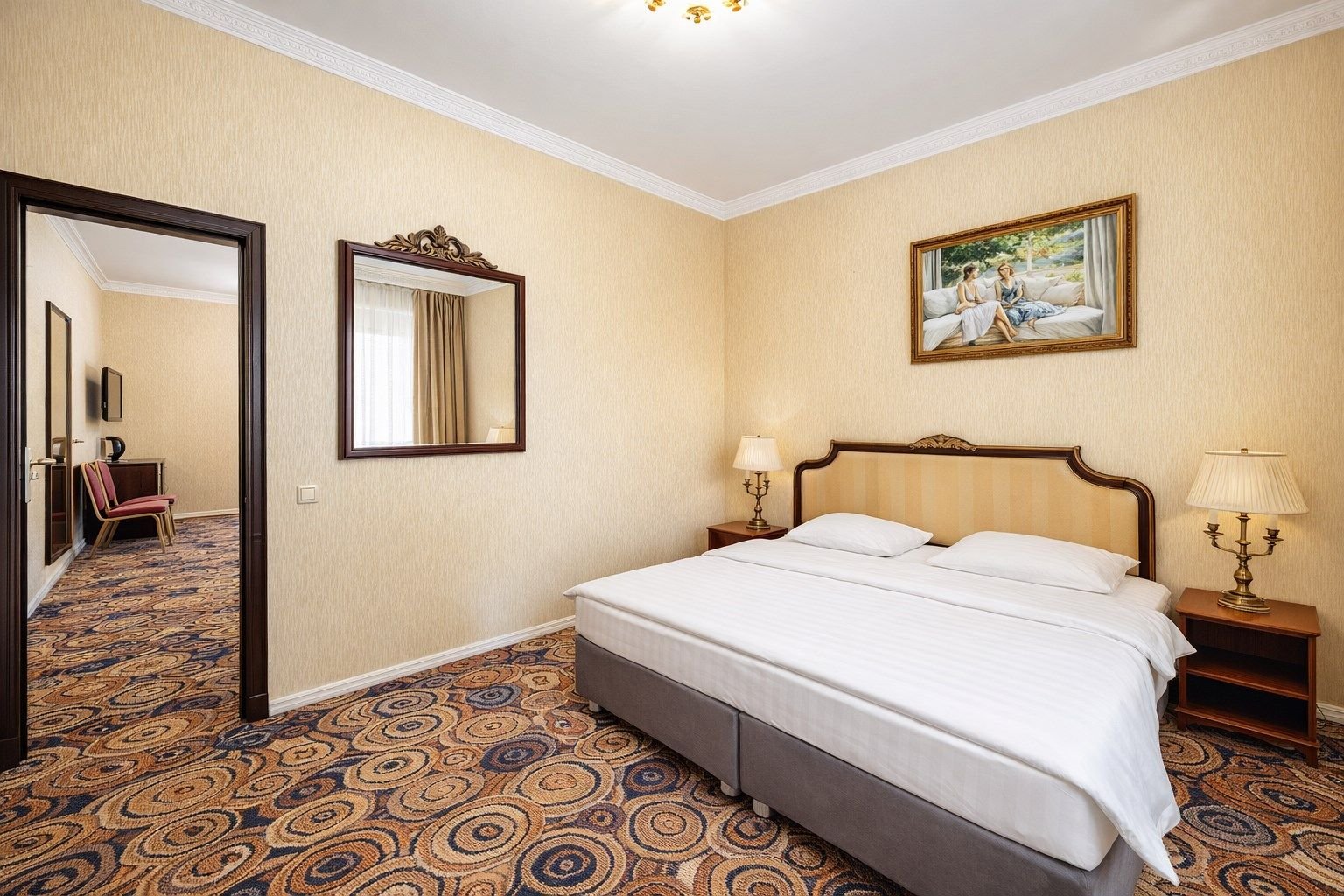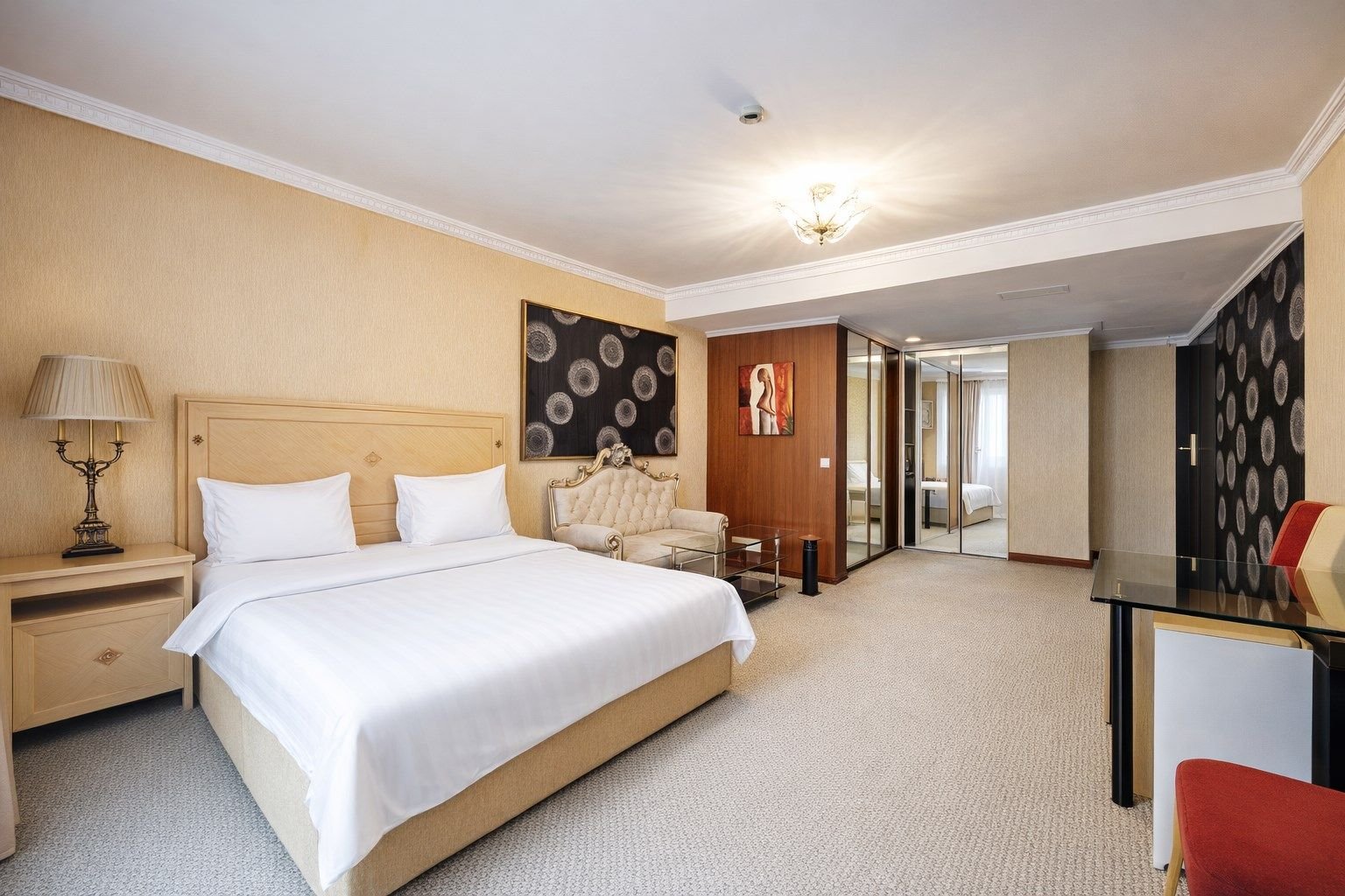Интерьер номера тщательно продуман — теплые оттенки, в которых он выдержан, расслабляют, а изысканная мебель из ценных пород дерева и натуральной кожи придает номеру солидность. Широкая двухместная кровать с ортопедическим матрацем гарантирует сладкий со...