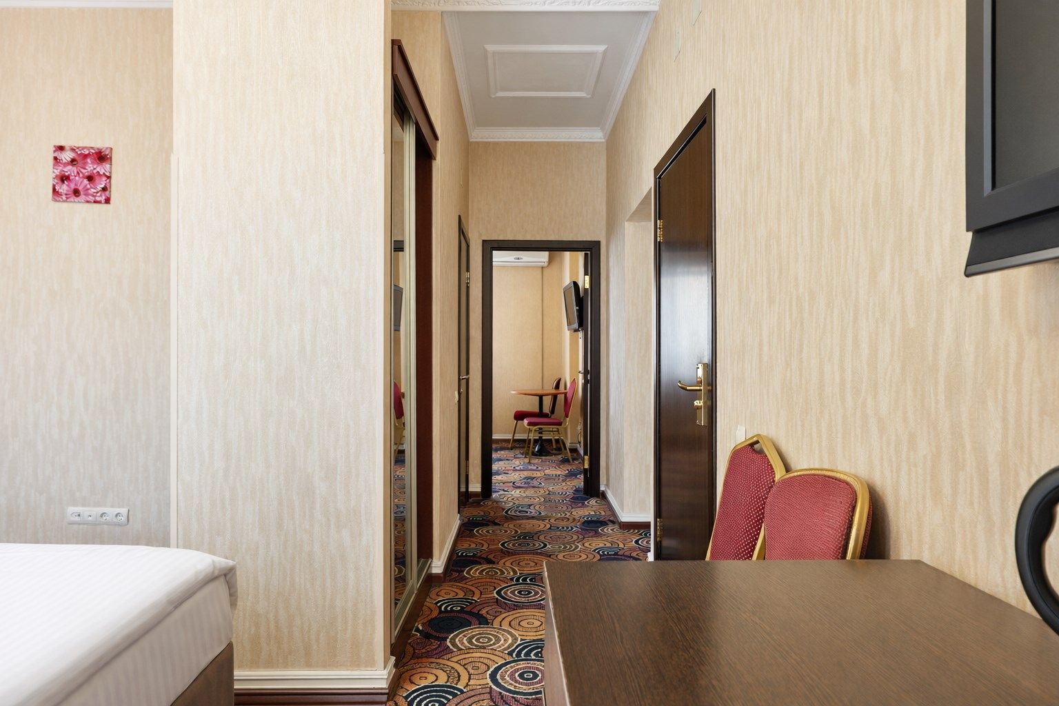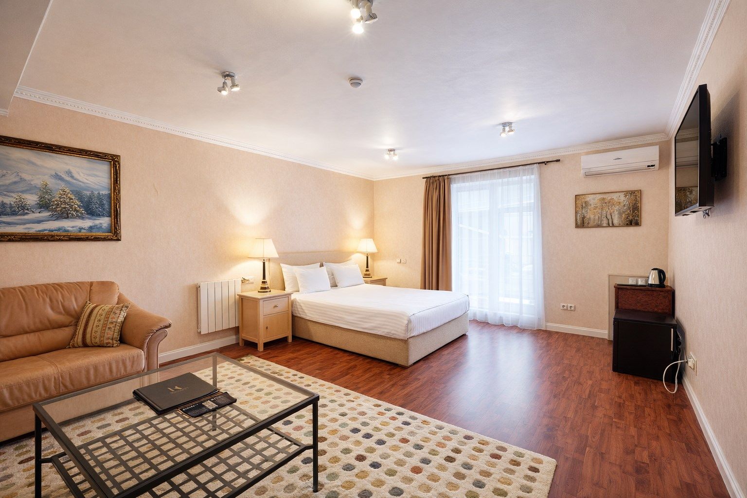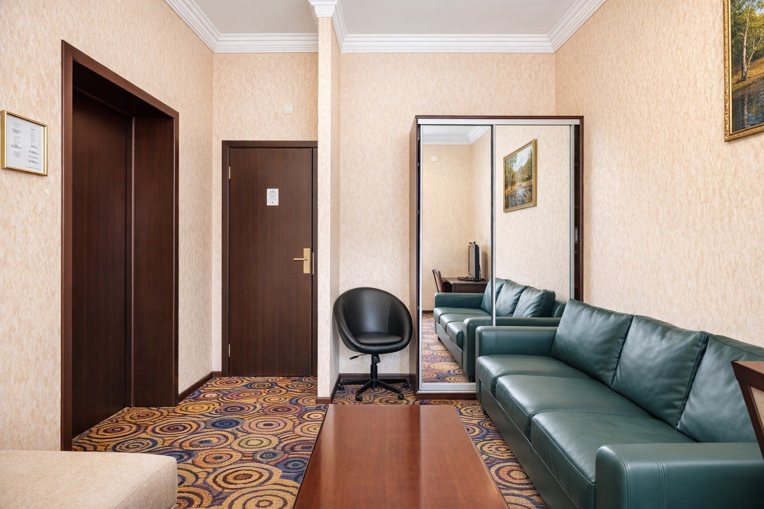 Интерьер номера тщательно продуман — теплые оттенки, в которых он выдержан, расслабляют, а изысканная мебель из ценных пород дерева и натуральной кожи придает номеру солидность. Широкая двухместная кровать с ортопедическим матрацем гарантирует сладкий со...