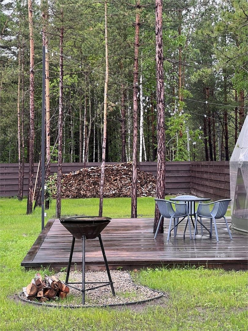 Каждый домик оборудован угольным грилем и уличной мебелью на террасе.