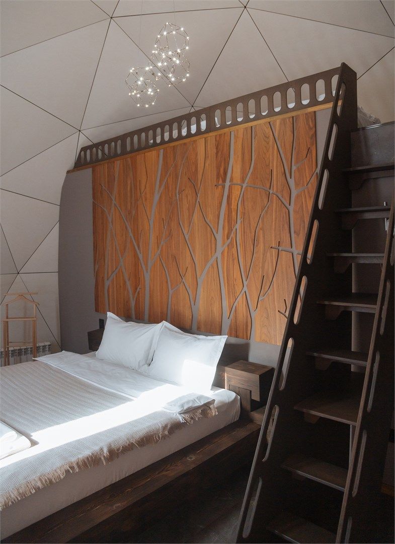 Роскошный дом-сфера площадью 38м2 с дизайнерской отделкой, панорамными окнами и живописным видом на лес. Двуспальная кровать king size на первом этаже, 2 спальных места на мезонине, санузел с душевой кабиной и собственная терраса с мангальной зоной. Рассчитан на проживание до четырех гостей....