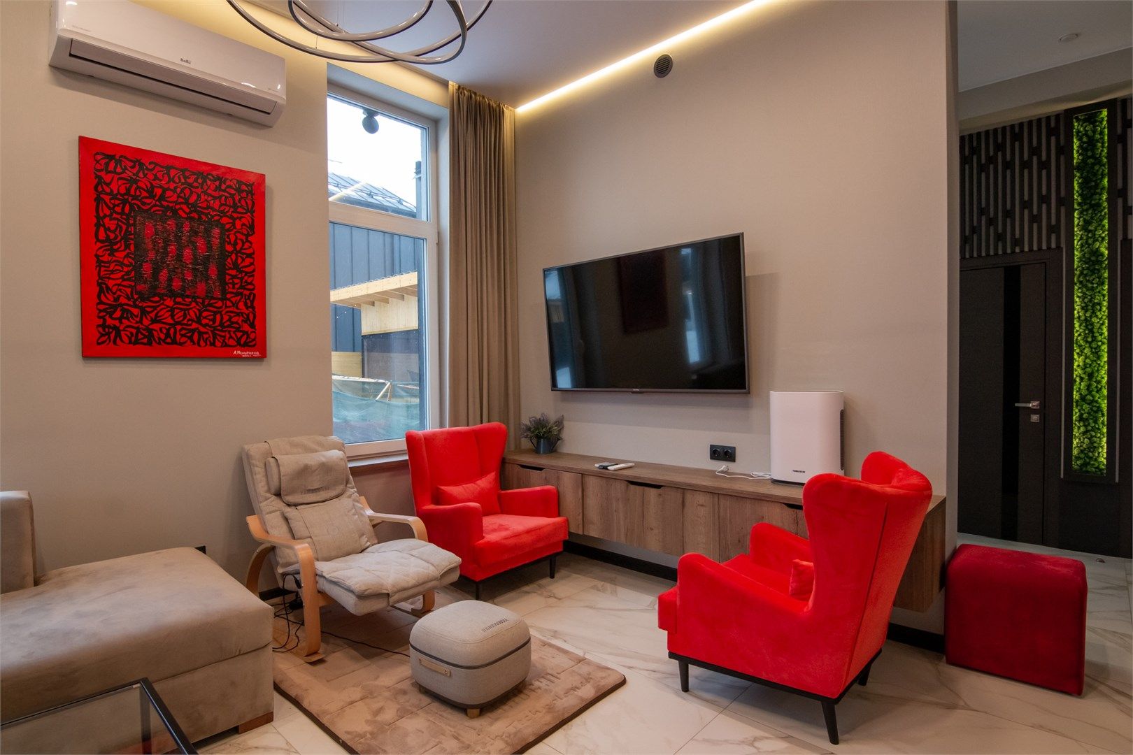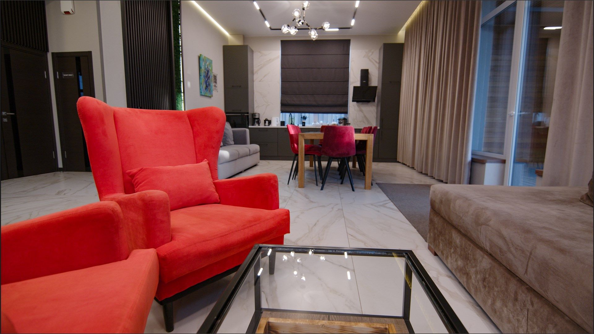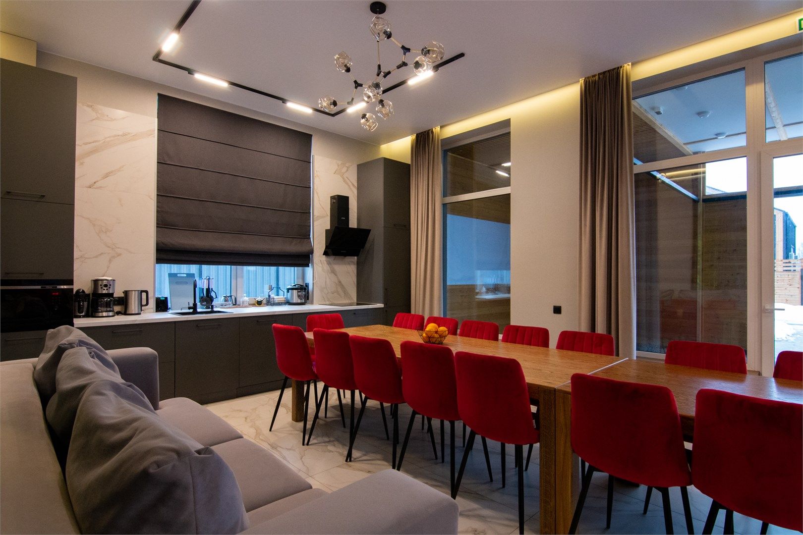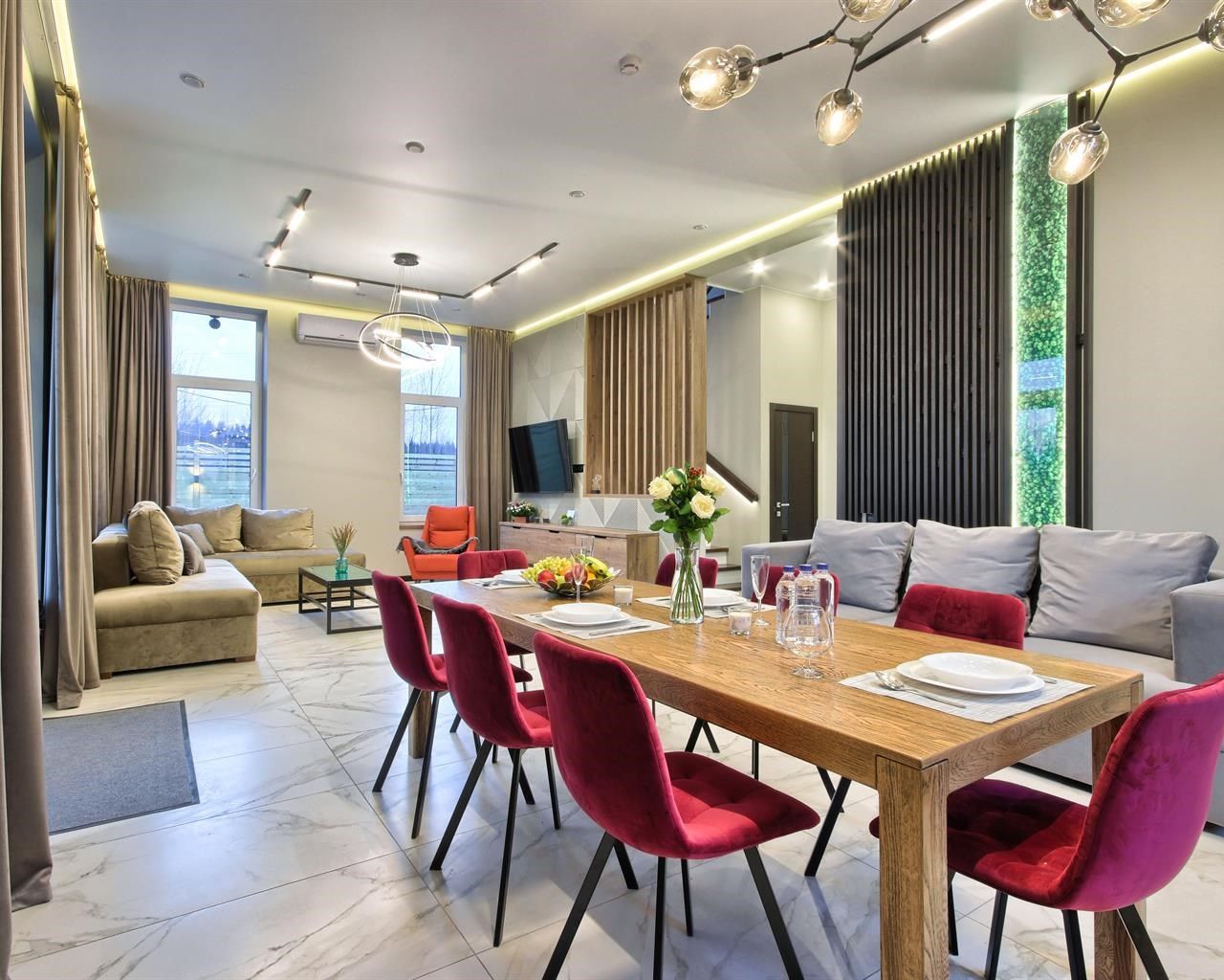 Площадь резиденции 280 кв.м.; ✓ 5 уютных спален с гардеробными, 1 просторная мастер-спальня с собственным санузлом, 3 санузла, комната для хранения багажа; ✓Собственная сауна, кальянная зона, домашний кинотеатр, бар и зона для завтраков на улице; ✓Зона для BBQ, мягкая костровая зона, купель на 8 человек.