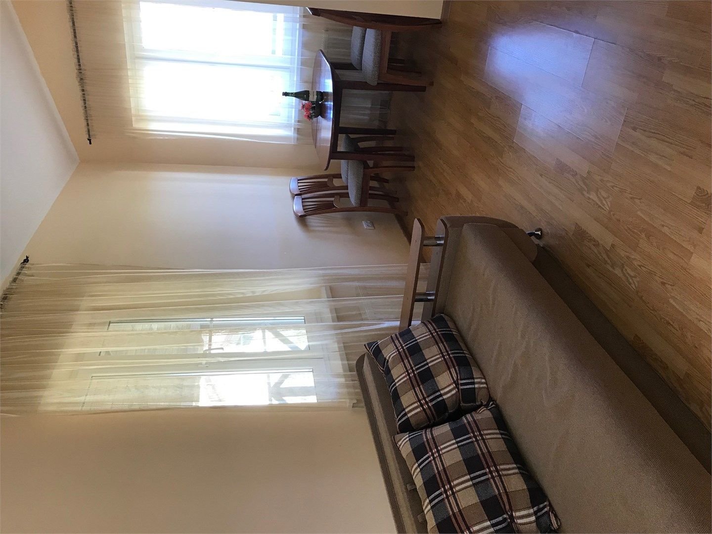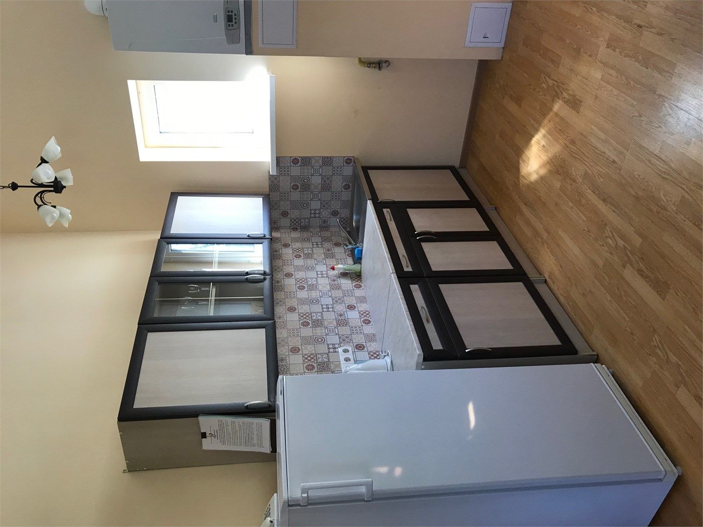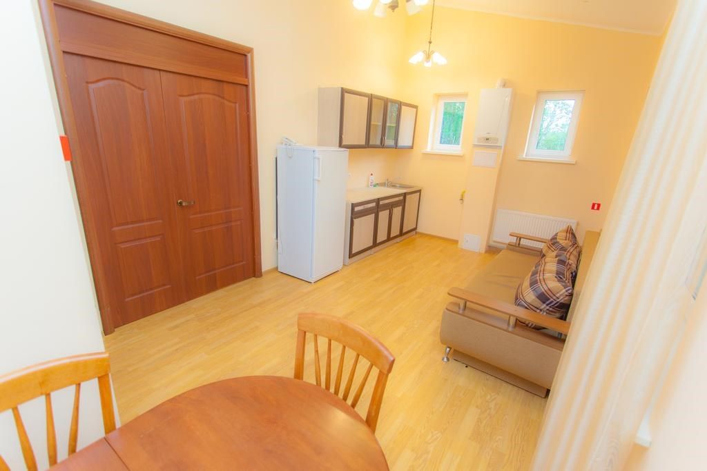 Гостиная: Кухонный гарнитур без плиты, обеденный стол, холодильник, чайник, микроволновая печь, диван, минимальный ...