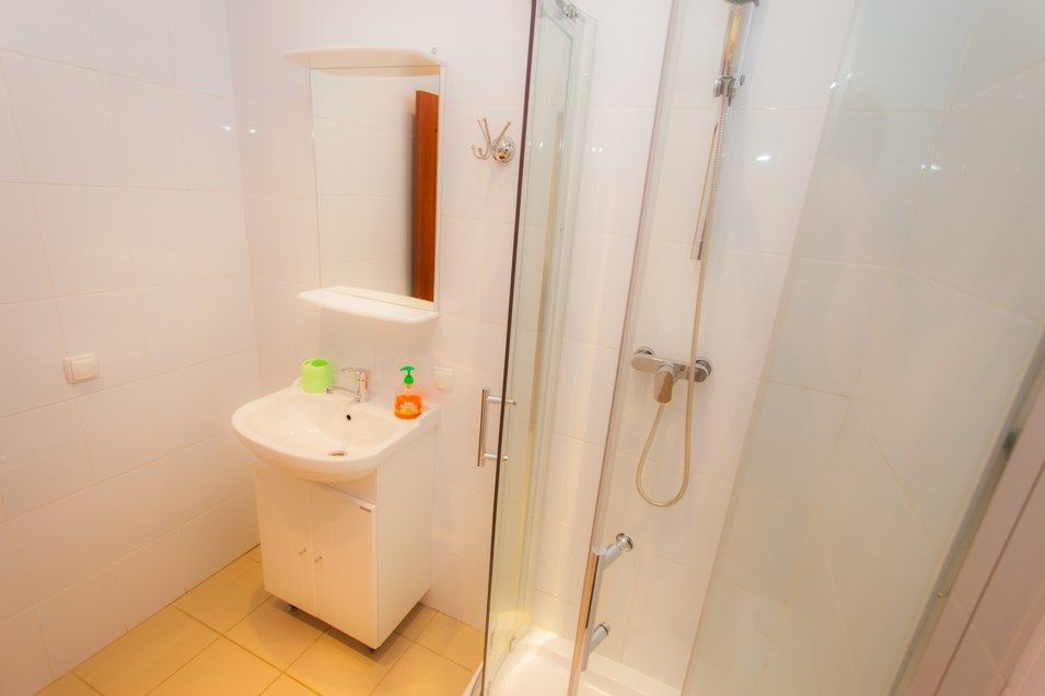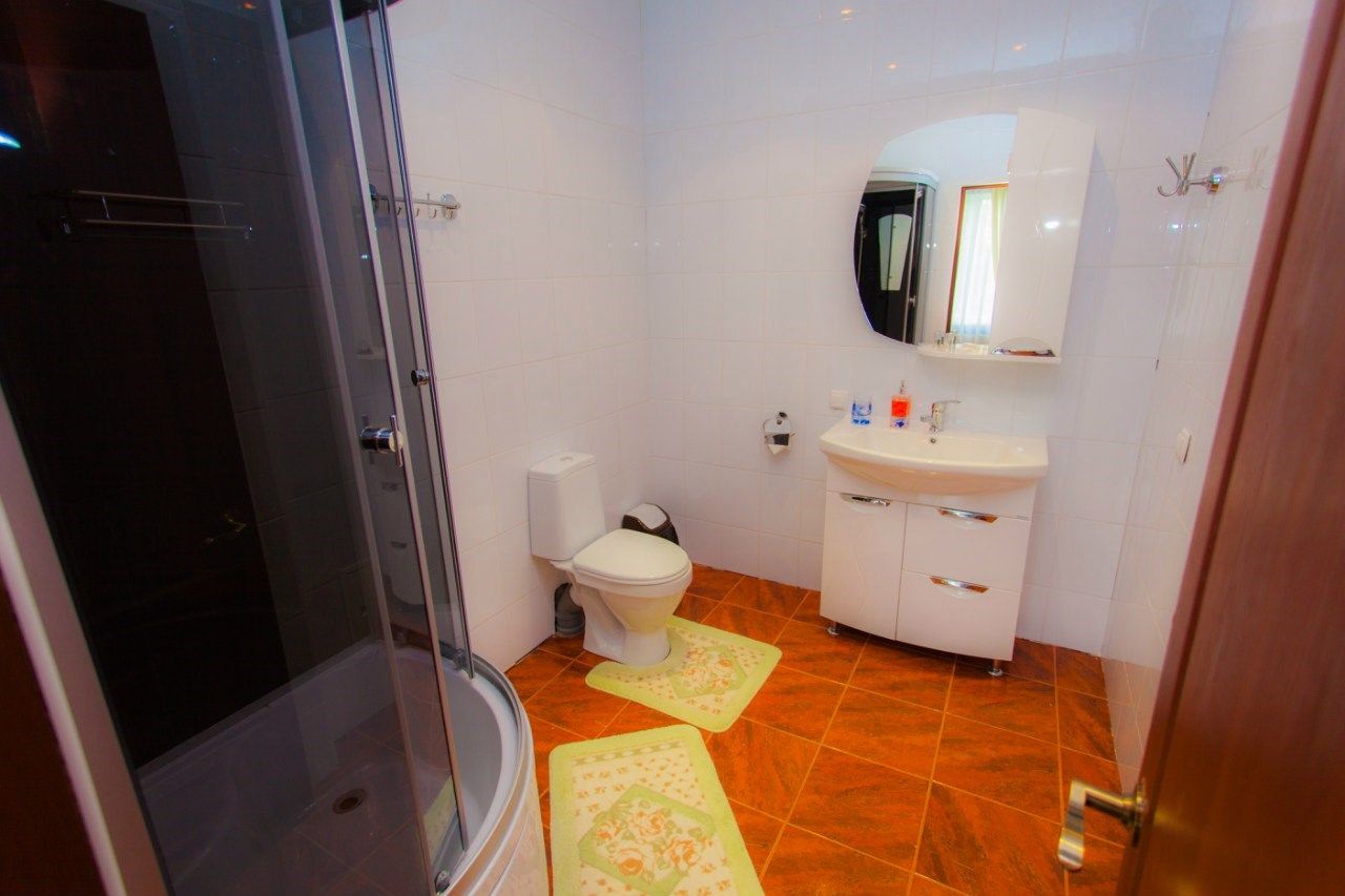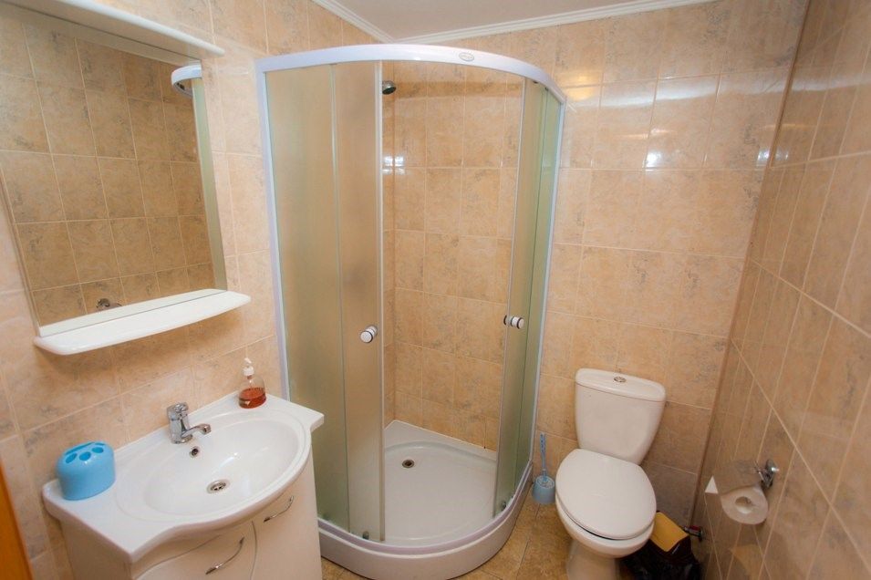 Ванная комната: Душевая кабина, раковина с тумбой, зеркало, шкафчик, крючки для полотенец, туалет.