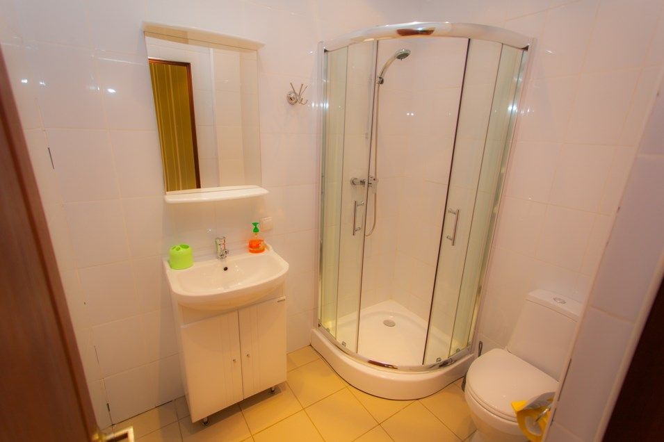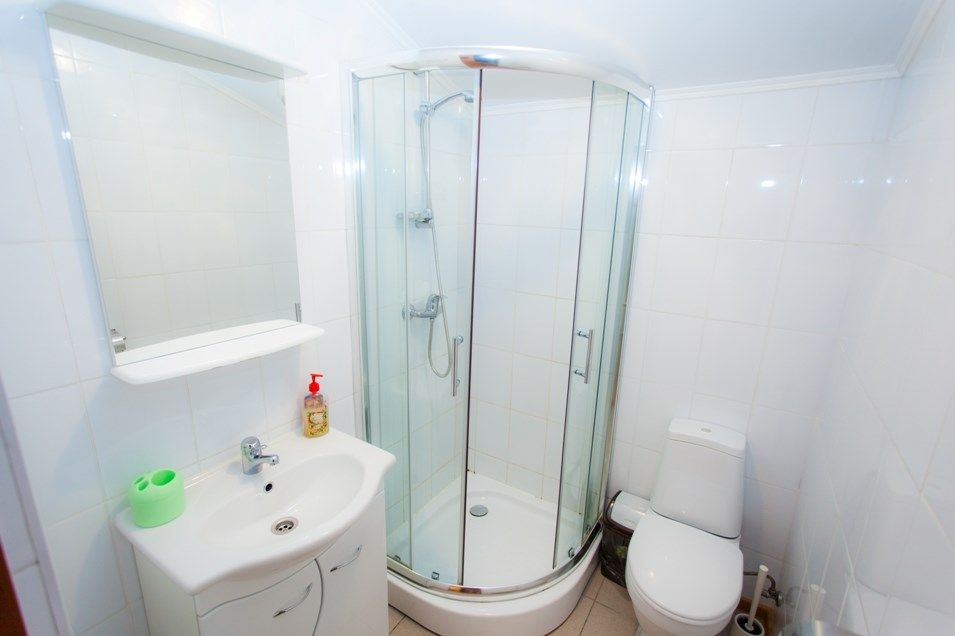 В ванной комнате представлены душевые кабины и туалетные принадлежности. Комната: Кровать, прикроватная тумба, шкаф.