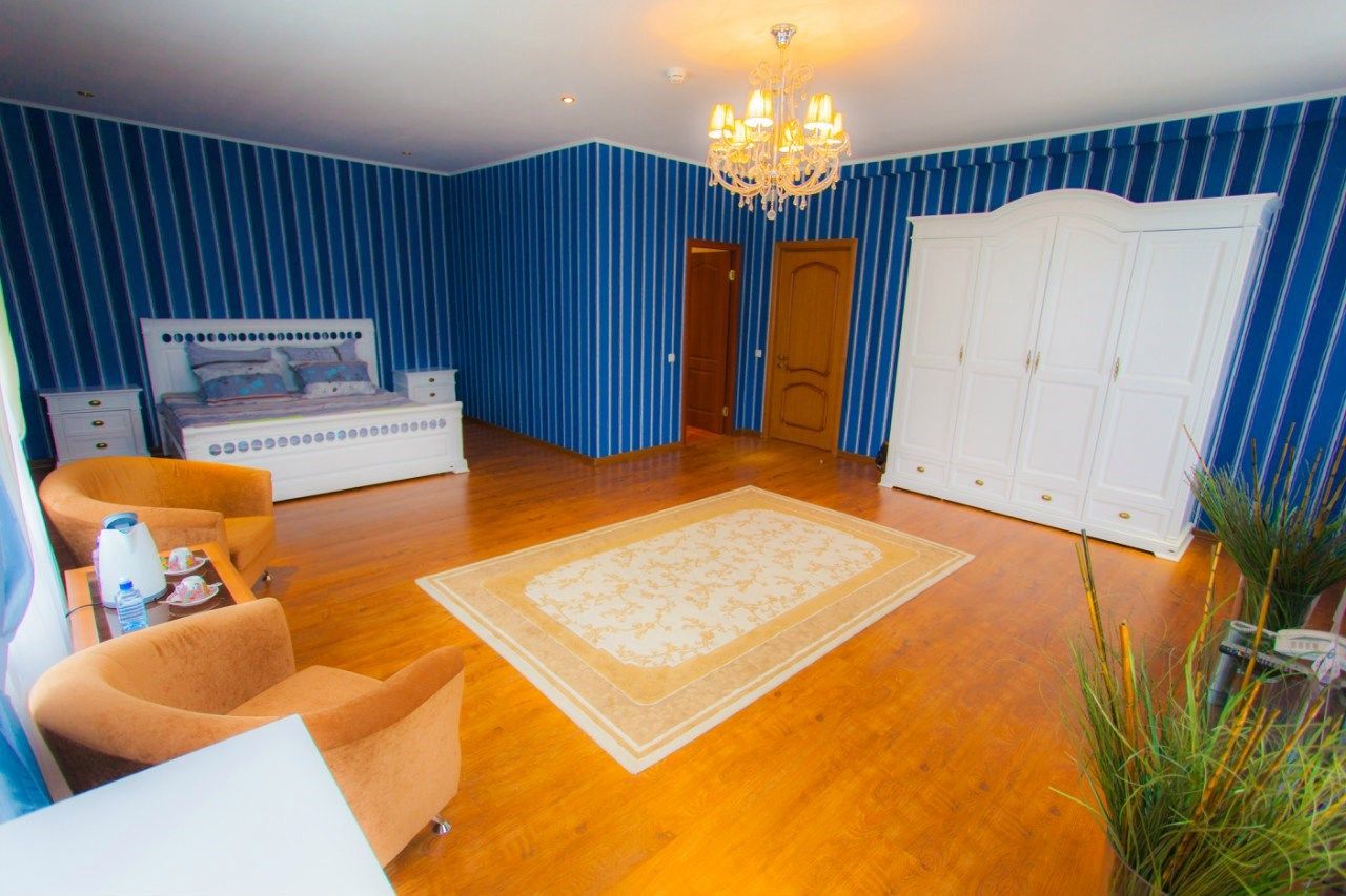 Комната: Большая кровать, прикроватная тумба, шкаф, мягкая мебель, журнальный столик.