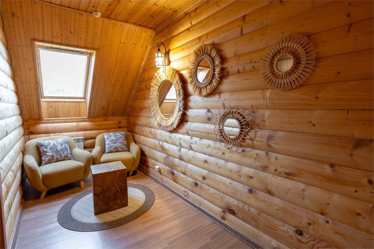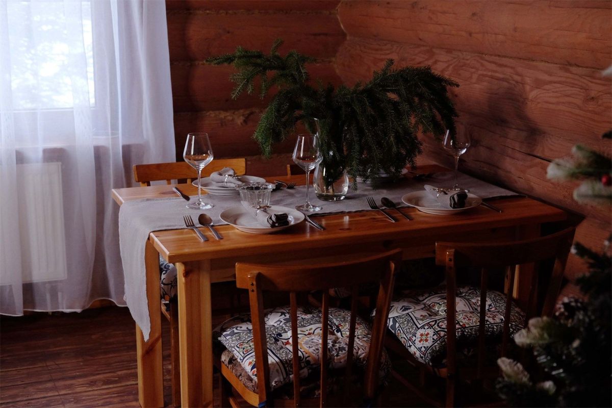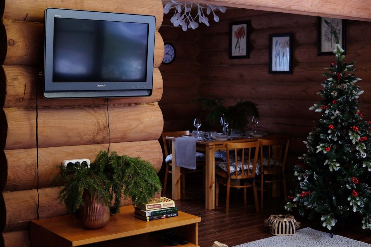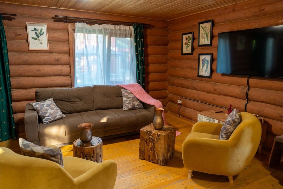 Кухня-гостиная расположена на первом этаже. Оснащена диваном, креслами и ЖК телевизором, обеденным столом. Полностью укомплектована всей необходимой техникой и посудой.