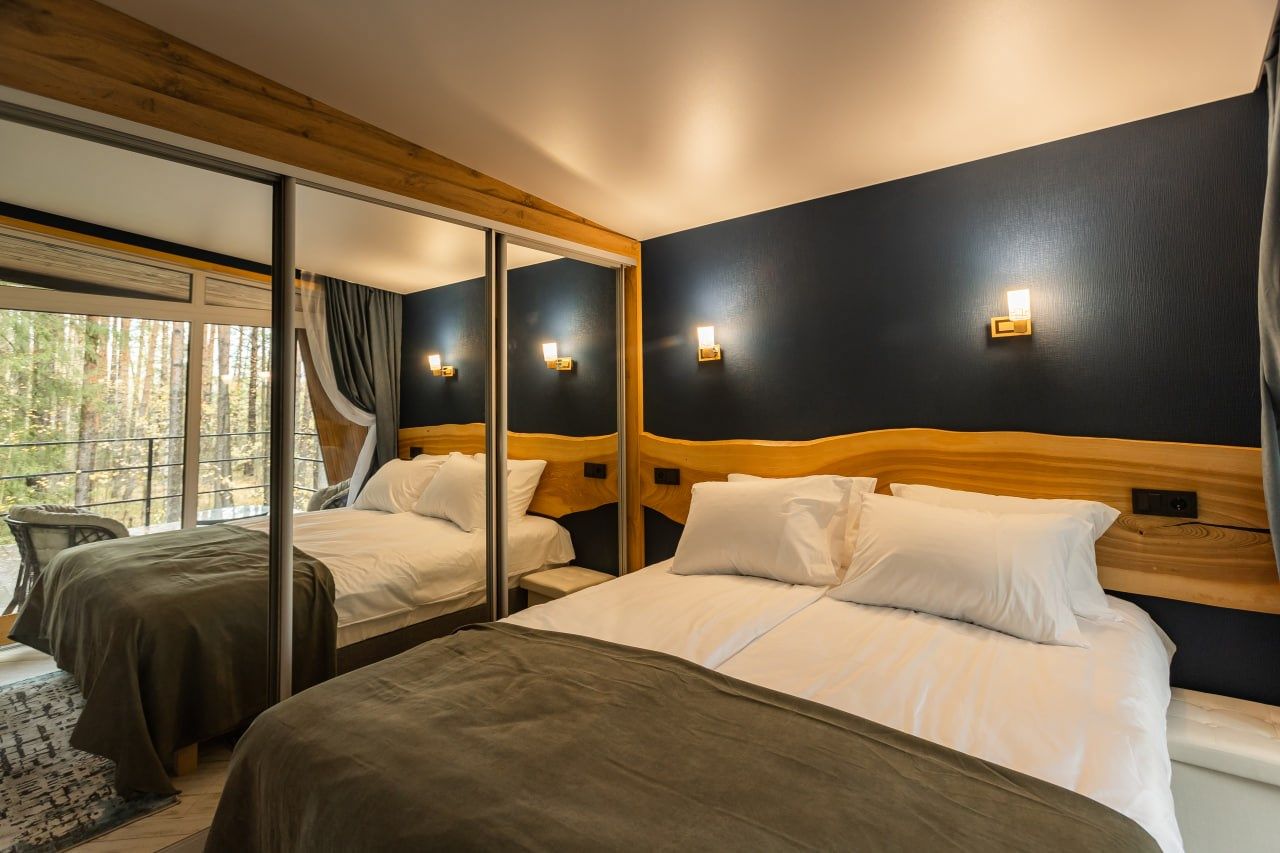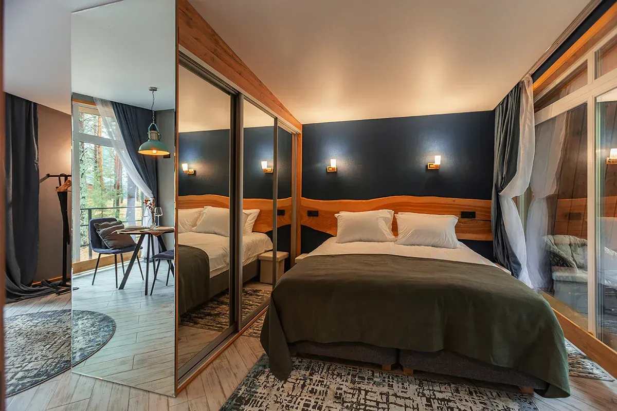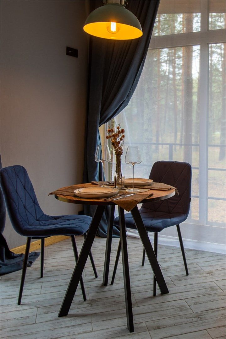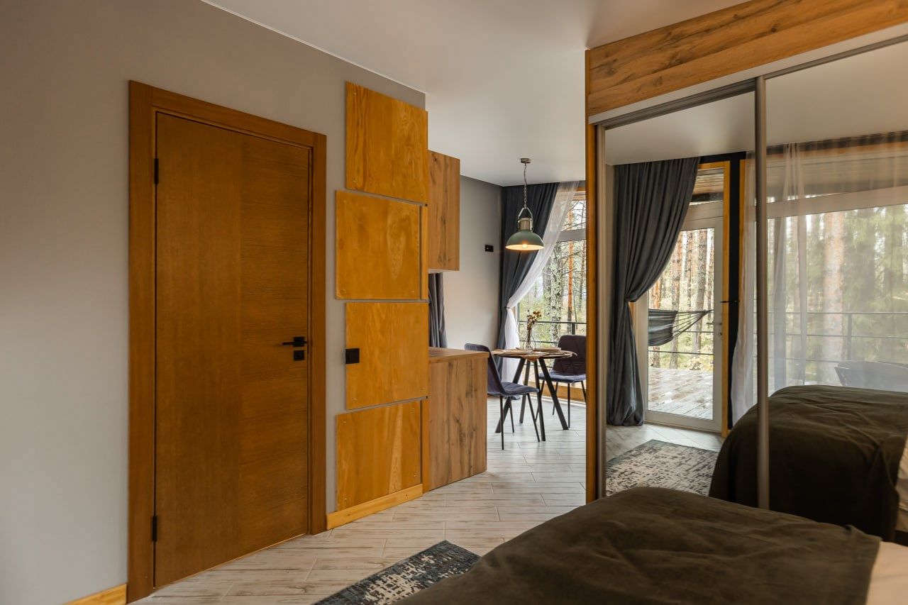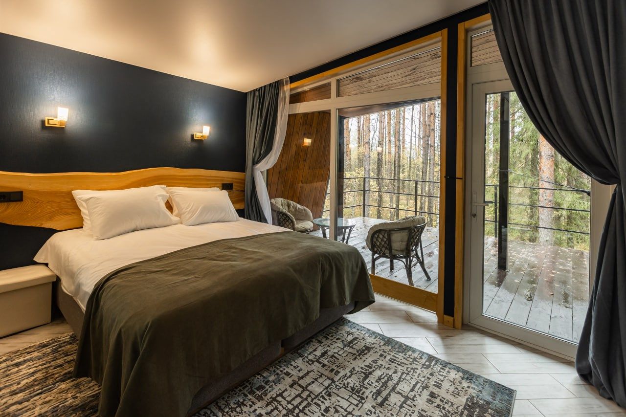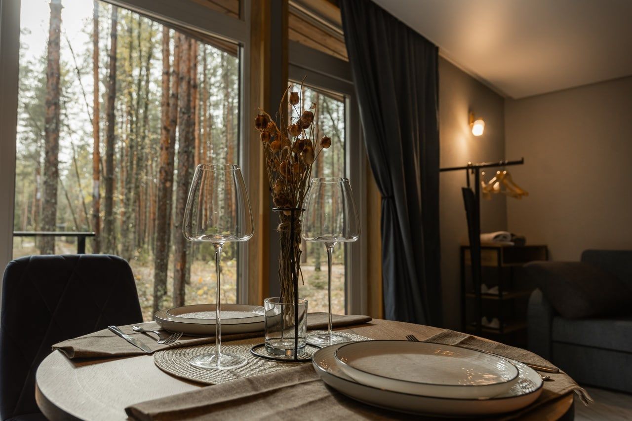 Домик-шале в сосновом лесу в стиле лофт с большой террасой и панорамными окнами на двоих с дополнительным местом, создан для уединения и отдыха на природе. Домик укомплектован всем необходимым, питание входит в тариф и осуществляется в ресторане "Вино и Сосны"....