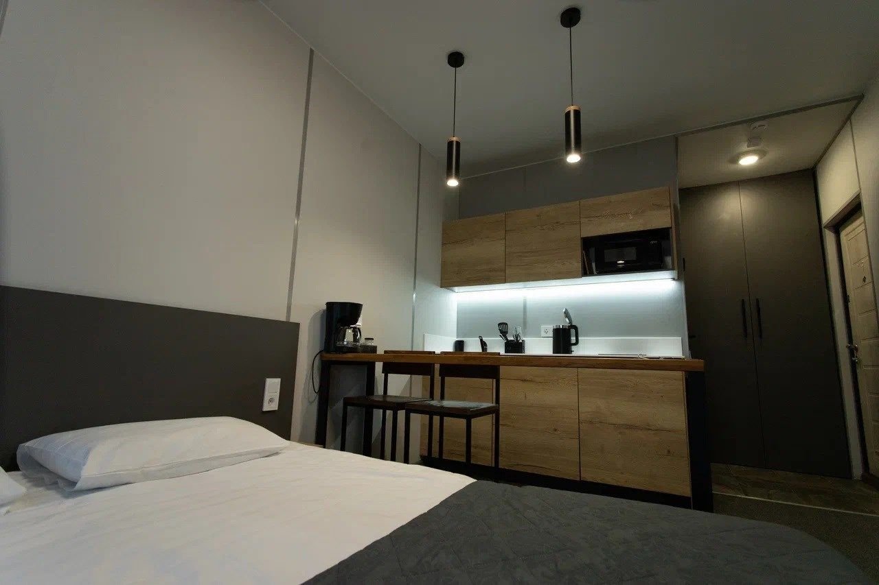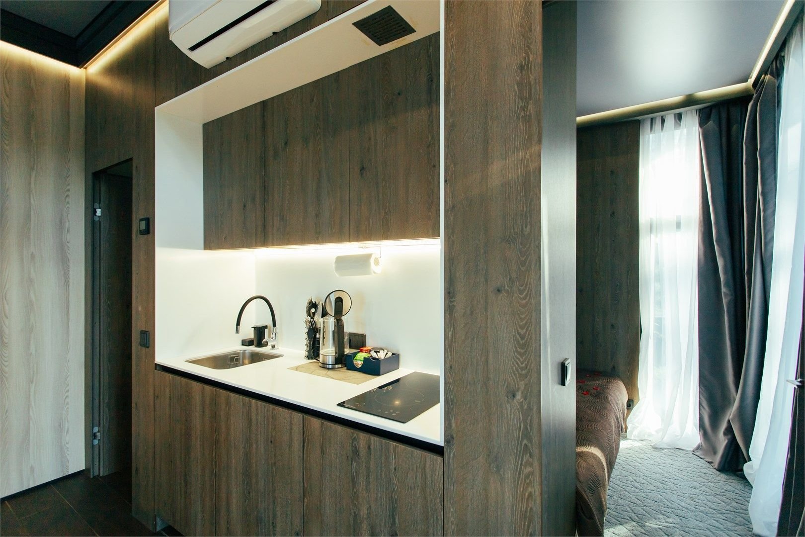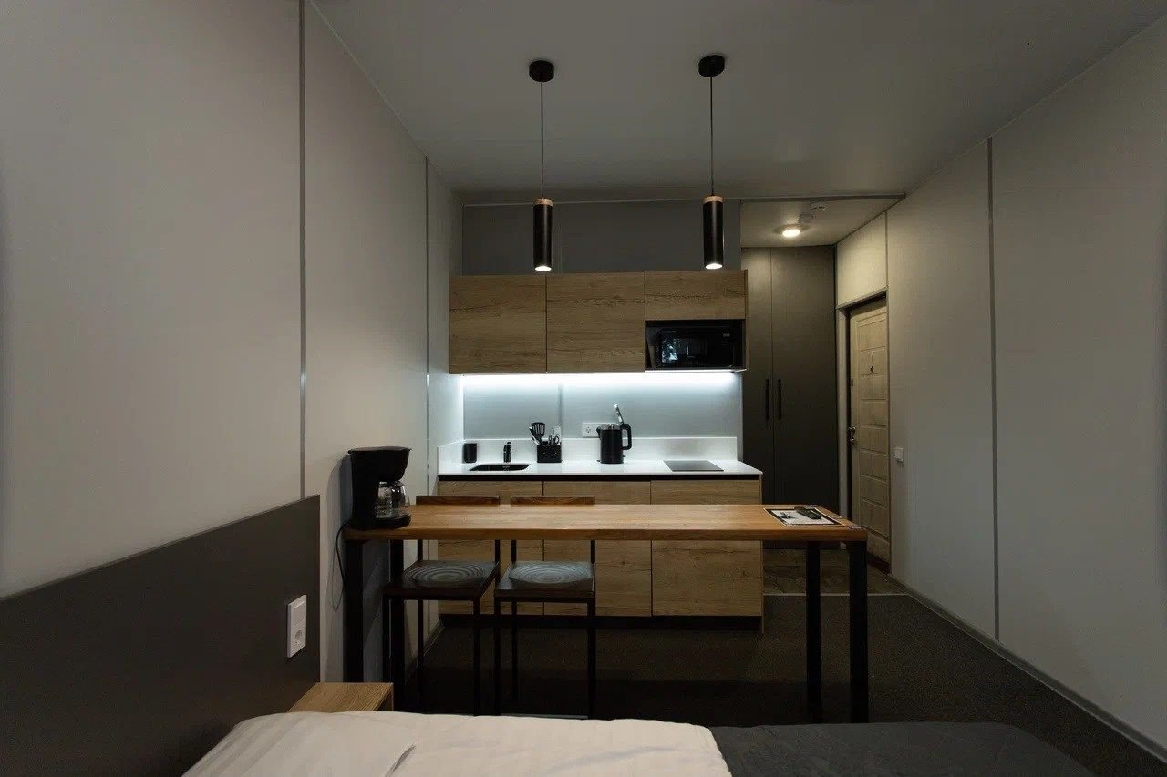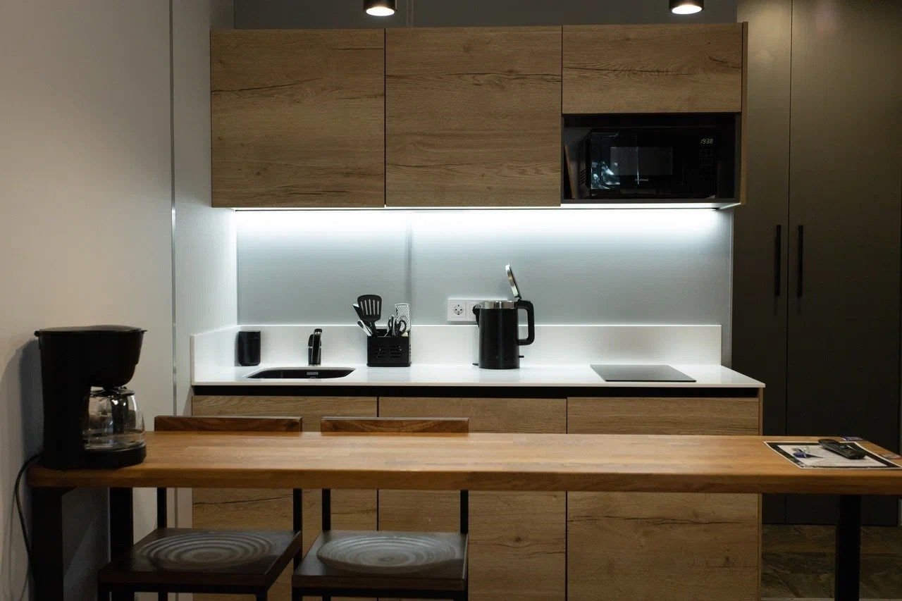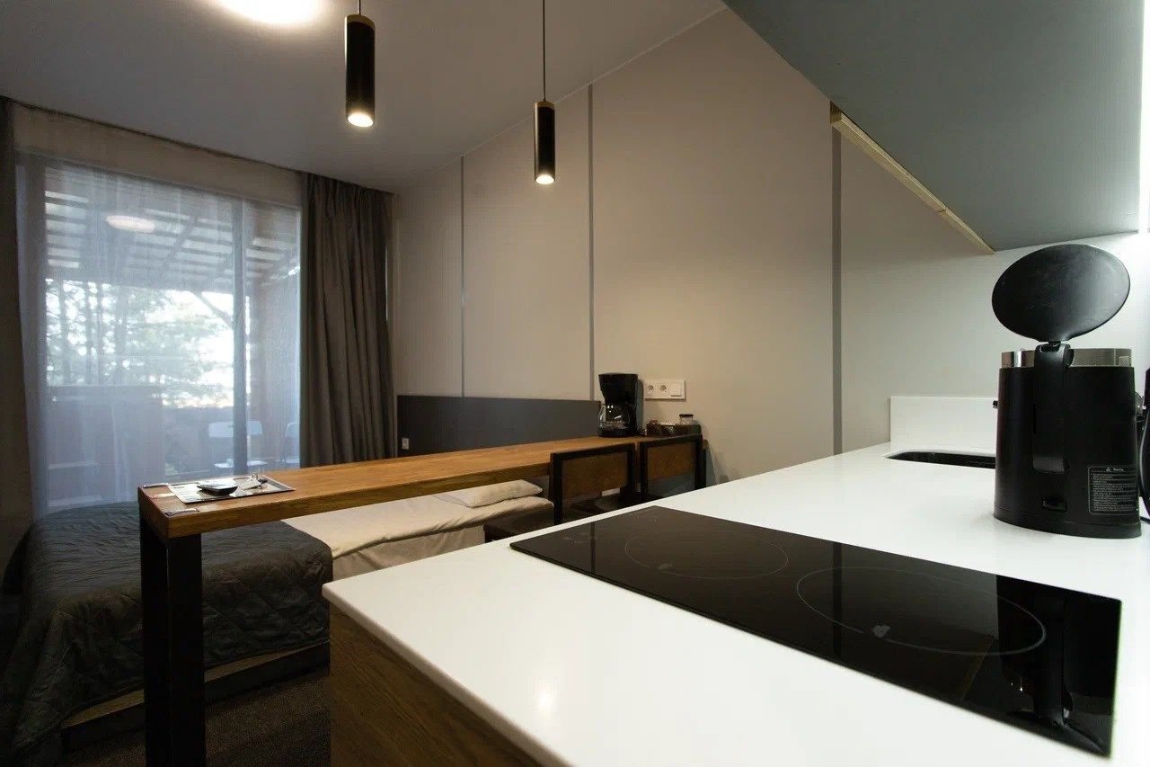 - Полностью оборудованная кухонная зона: барный стол и стулья, мини-холодильн...