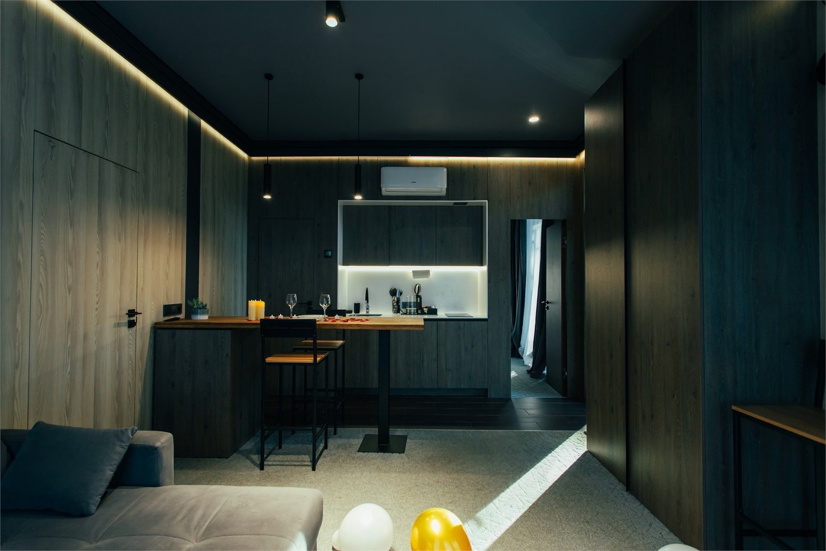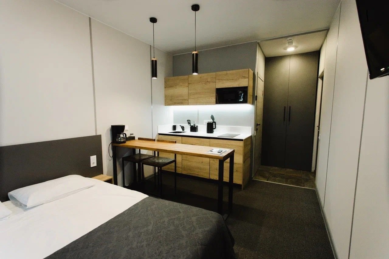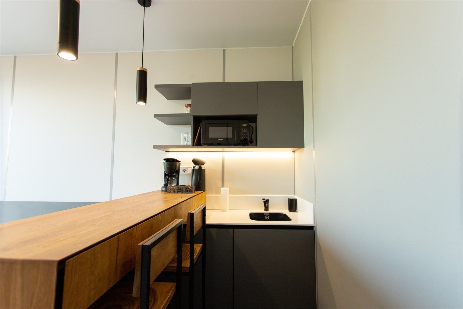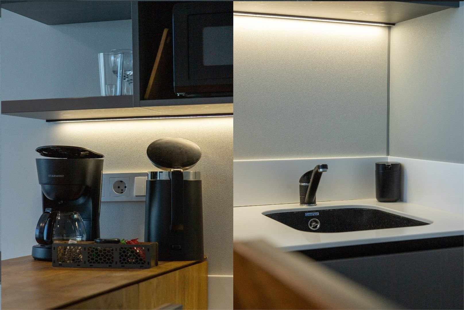 - Полностью оборудованная кухонная зона: барный стол и стулья, мини-холодильн...