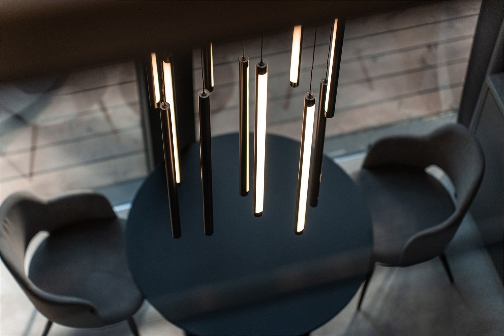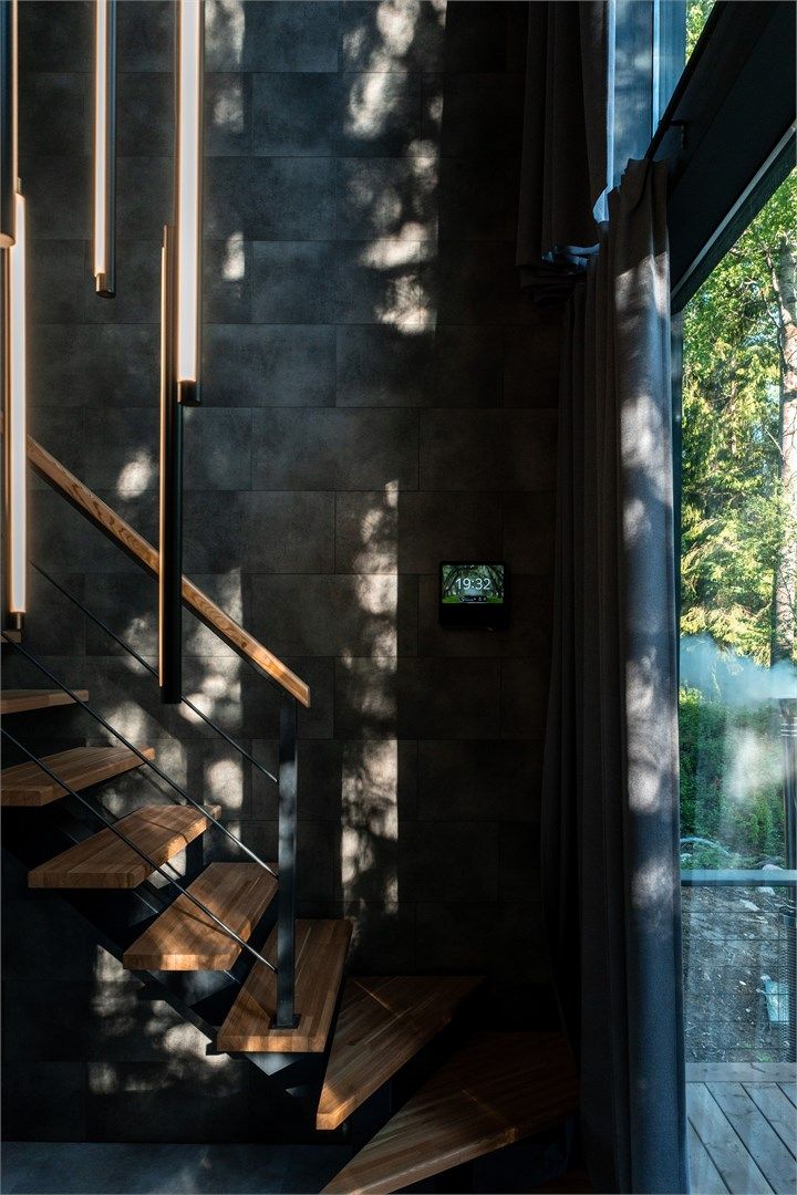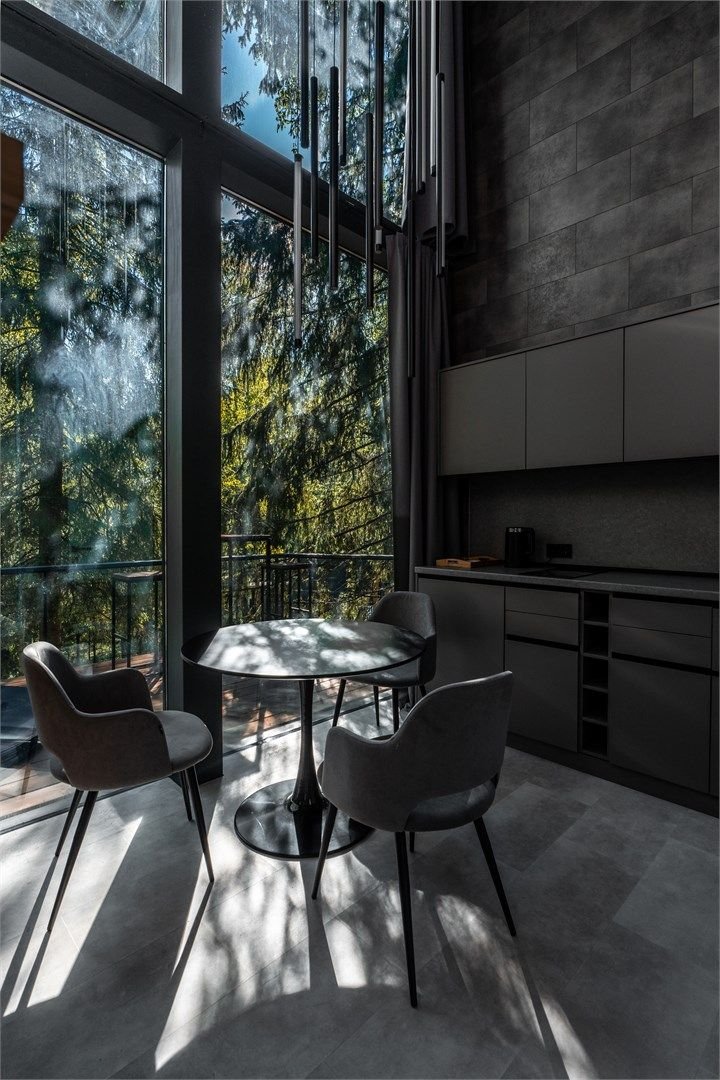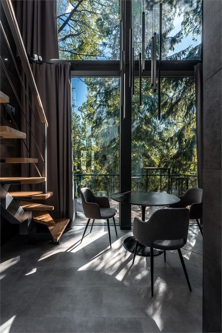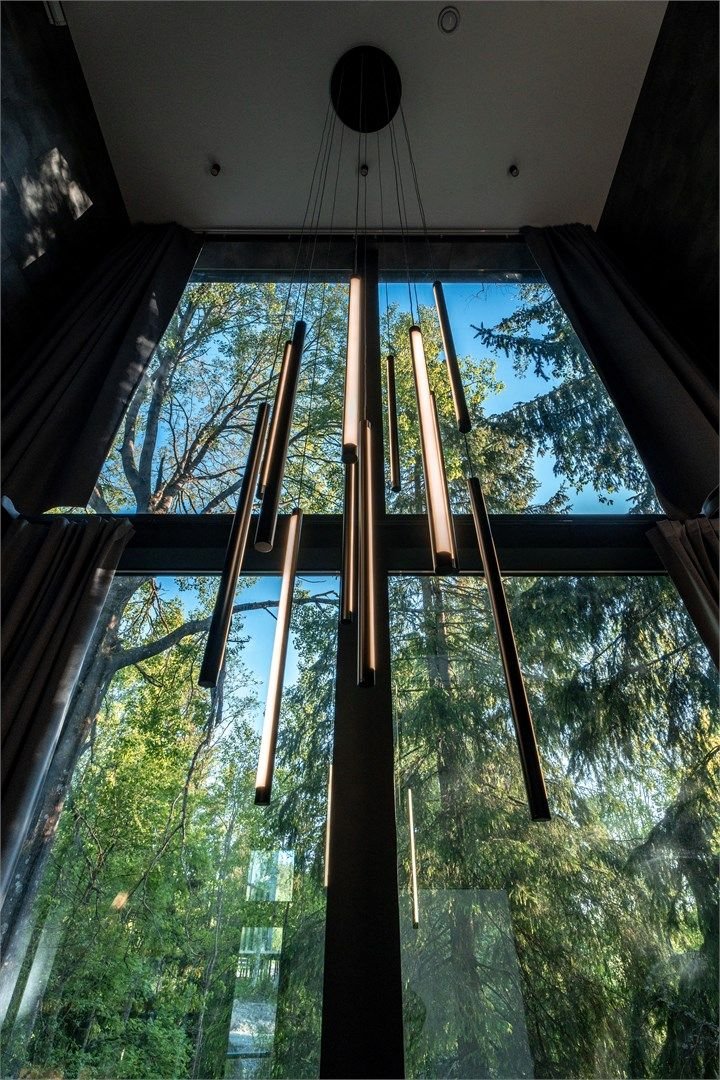 Из панорамных окон открываются живописные виды на хвойный лес и озеро.