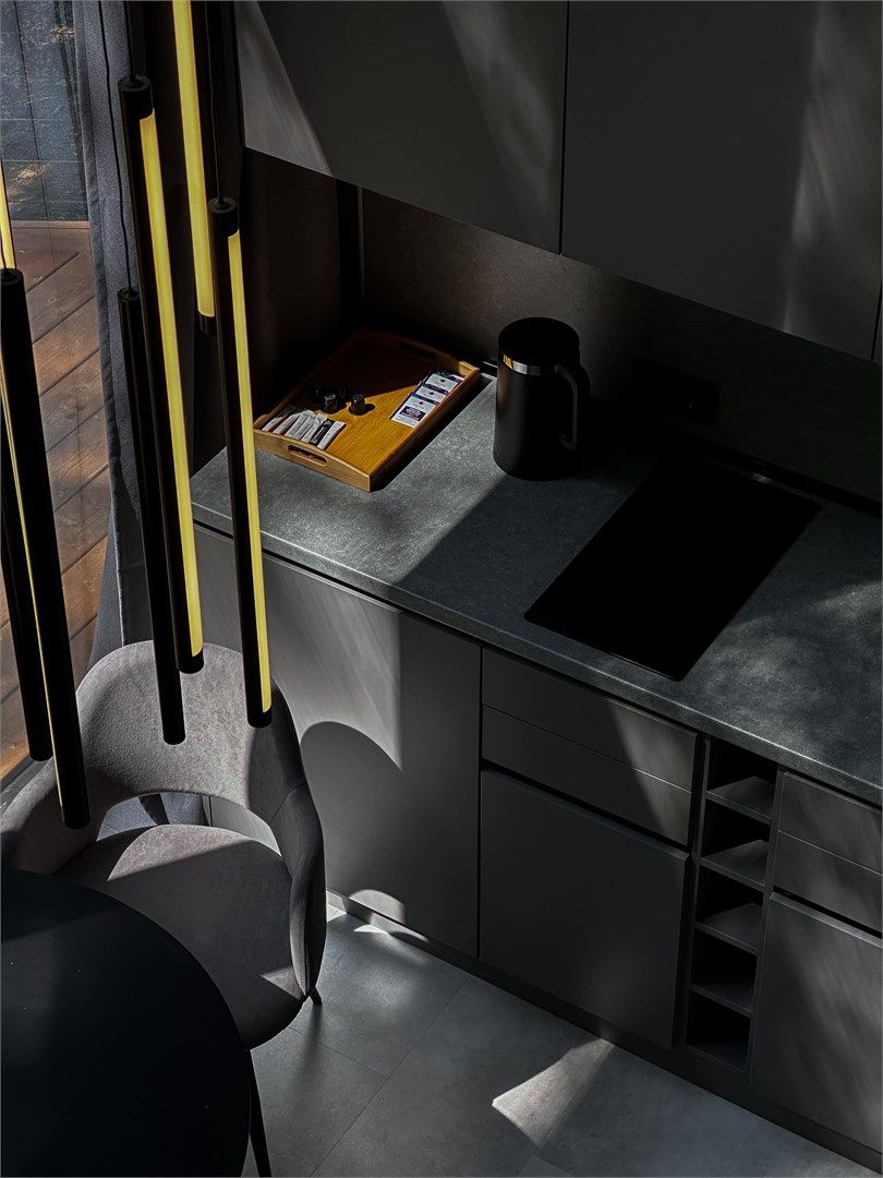 В виллах есть все необходимое для приготовления пищи, включая плиту, посудомоечную машину, холодильник, микроволновую печь и кофемашину. Также предусмотрены кондиционер и подогрев пола.