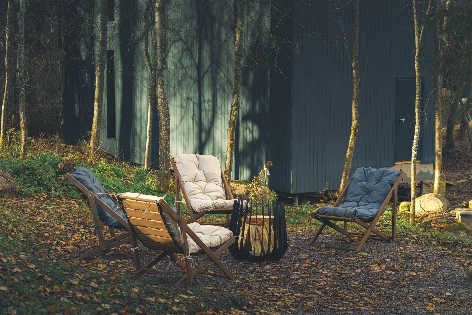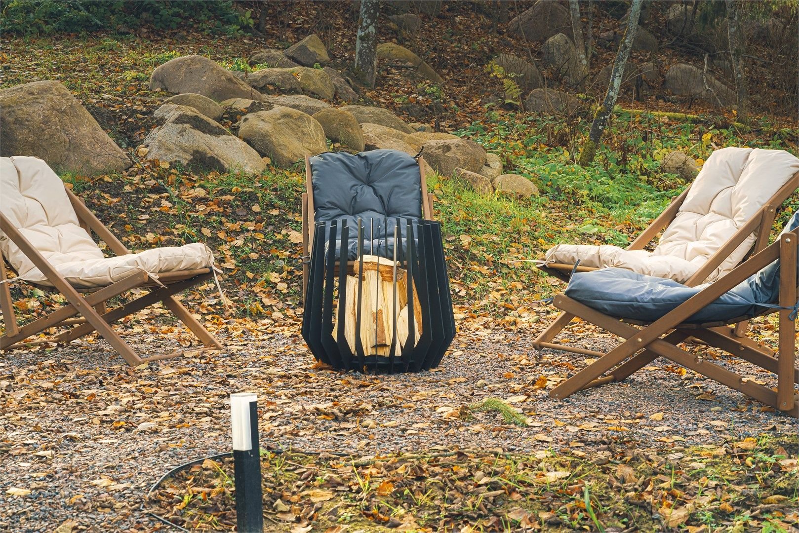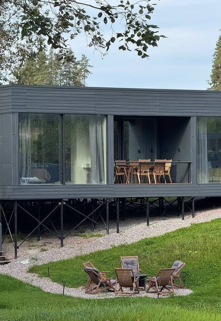 Одноэтажная вилла Делюкс 2+2 без купели с панорамными окнами, террасой, мангалом и собственной костровой зоной. Обратите внимание, что услуга "Разогрев купели" не предоставляется в данной категории.