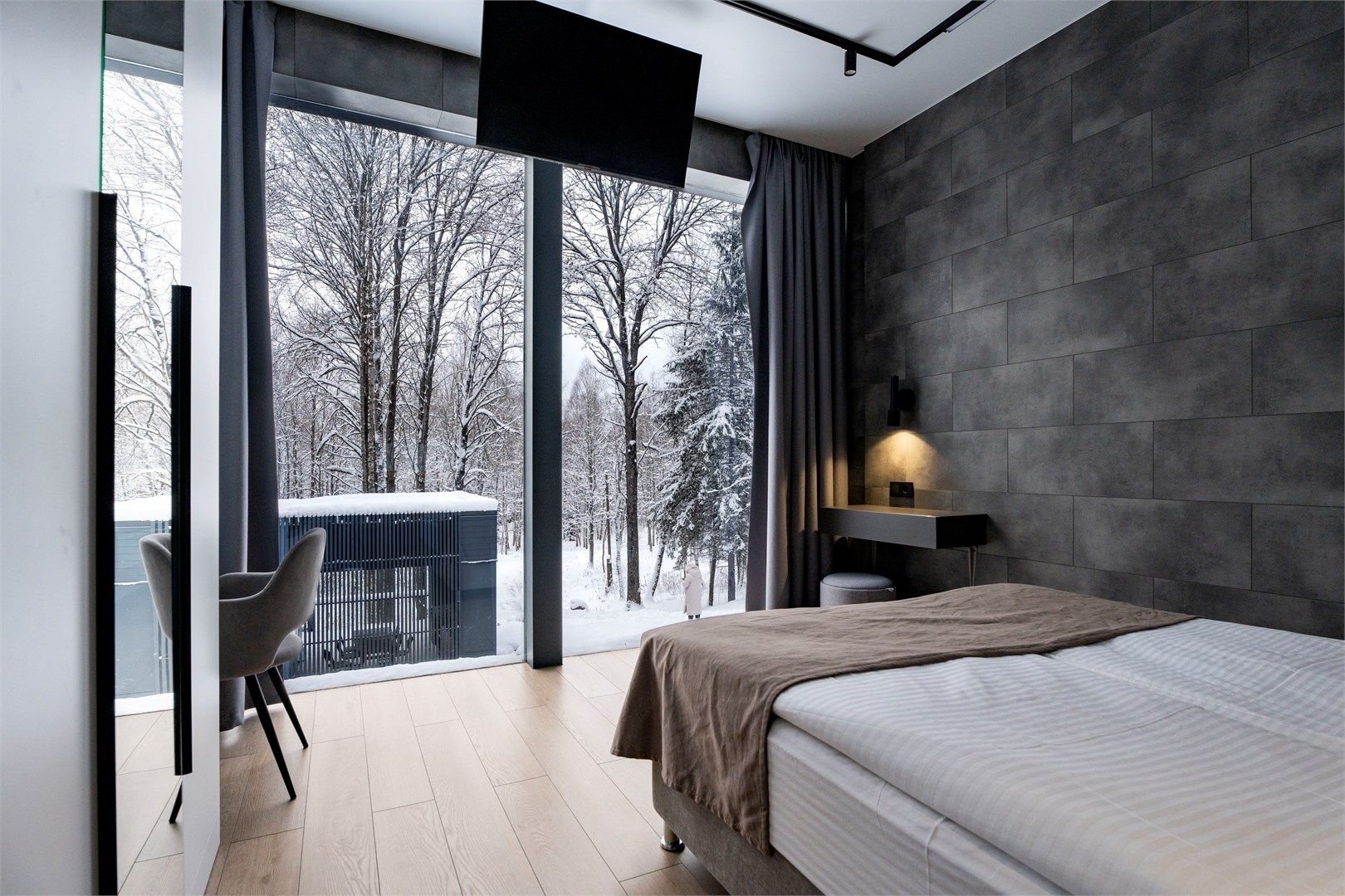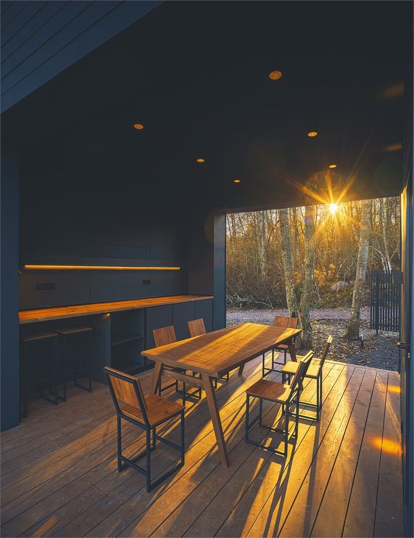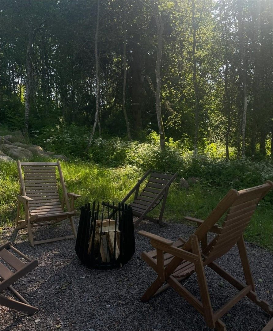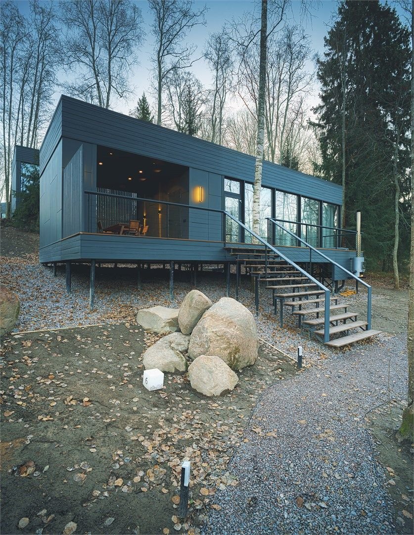Одноэтажная вилла Делюкс 2+2 без купели с панорамными окнами, террасой, мангалом и собственной костровой зоной. Обратите внимание, что услуга "Разогрев купели" не предоставляется в данной категории.