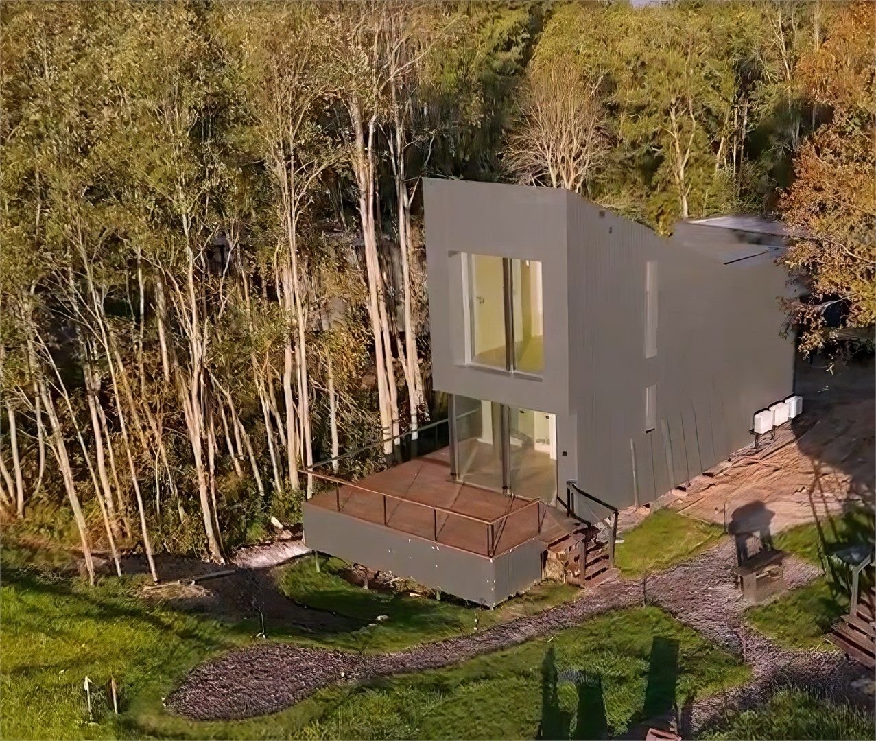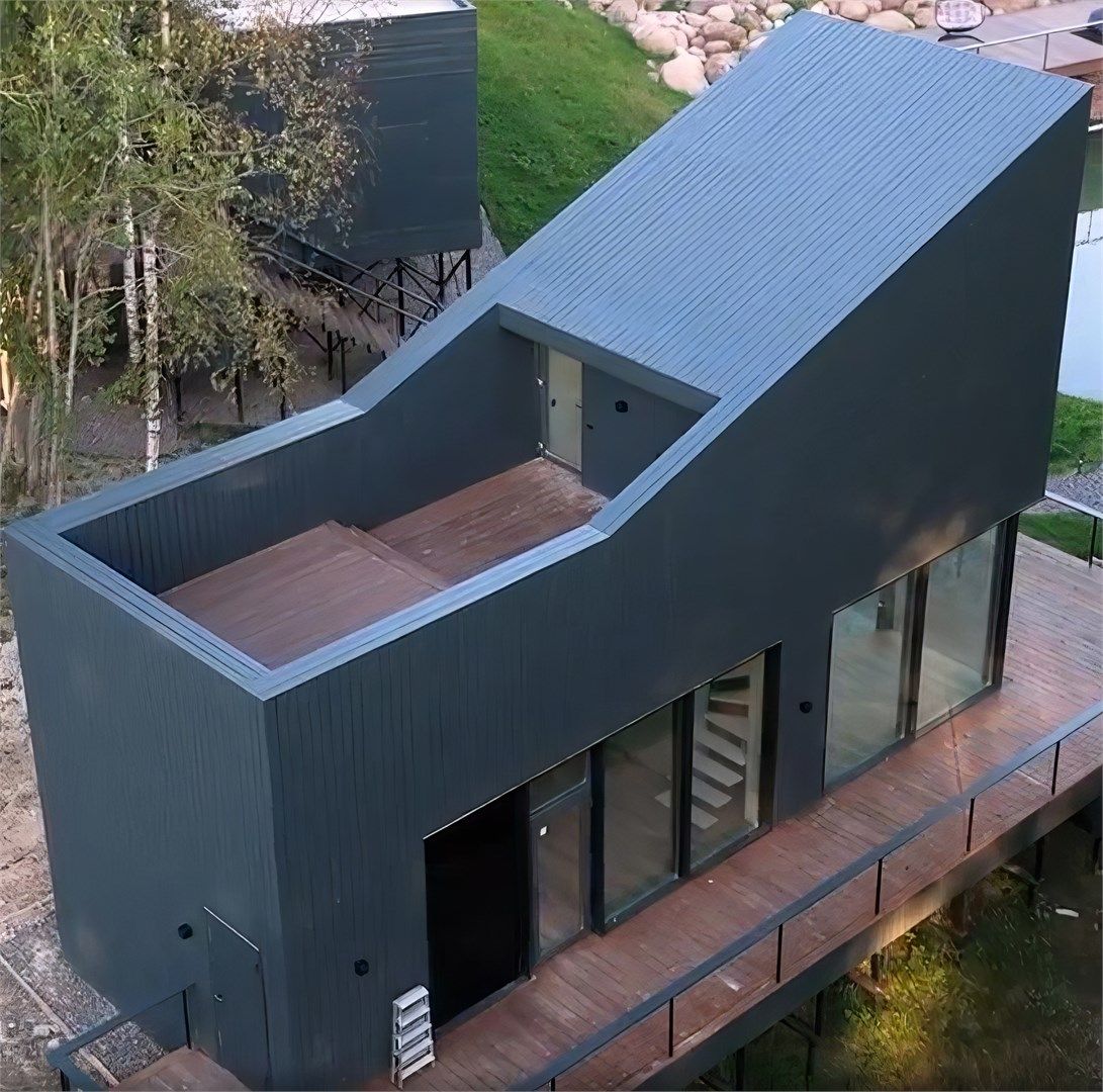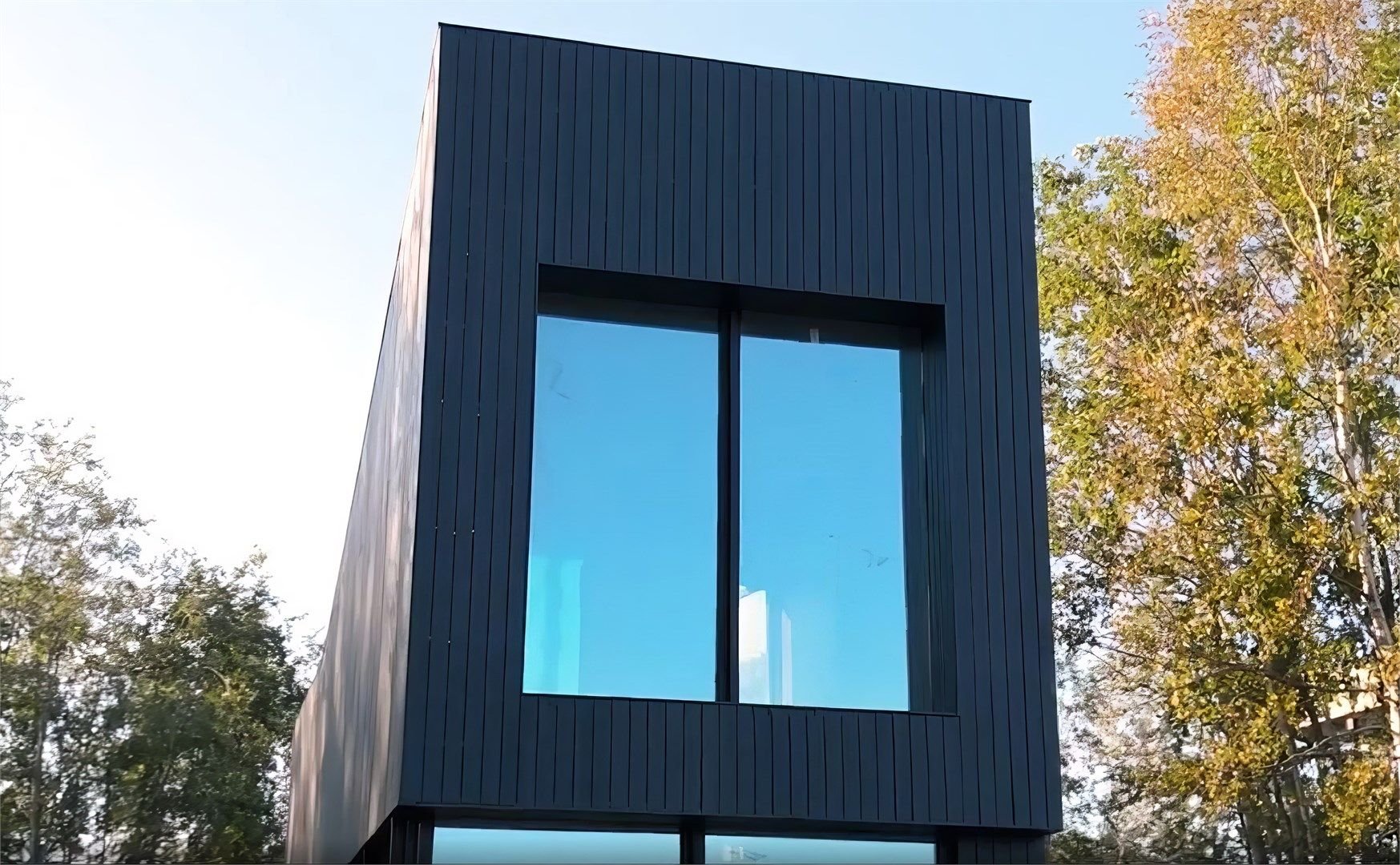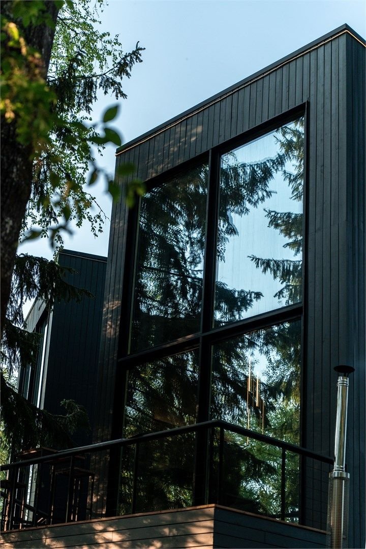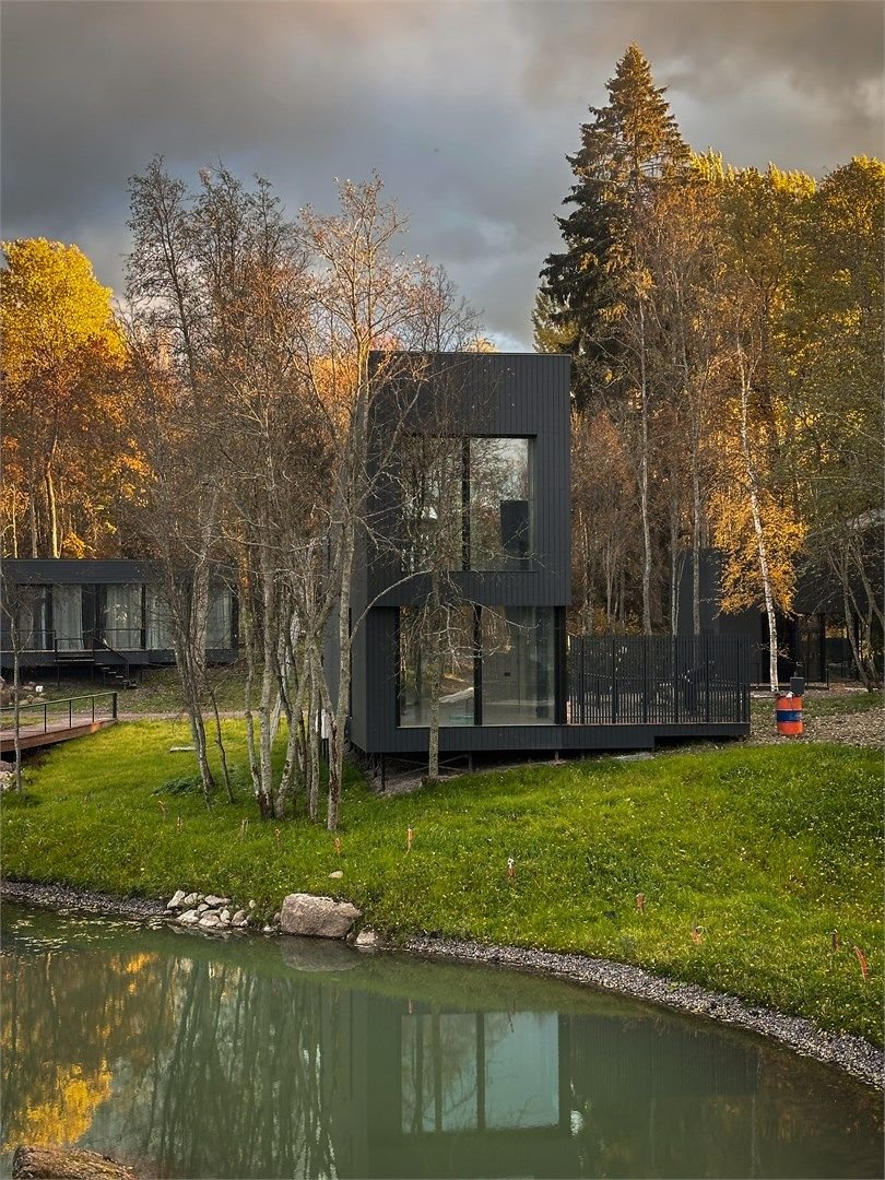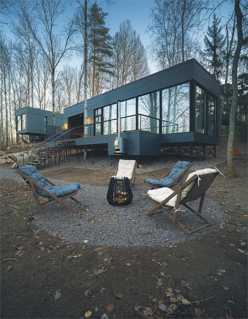 Двухэтажная вилла Стандарт 2+0 с панорамными окнами, собственной всепогодной купелью, мангалом и общей костровой зоной.