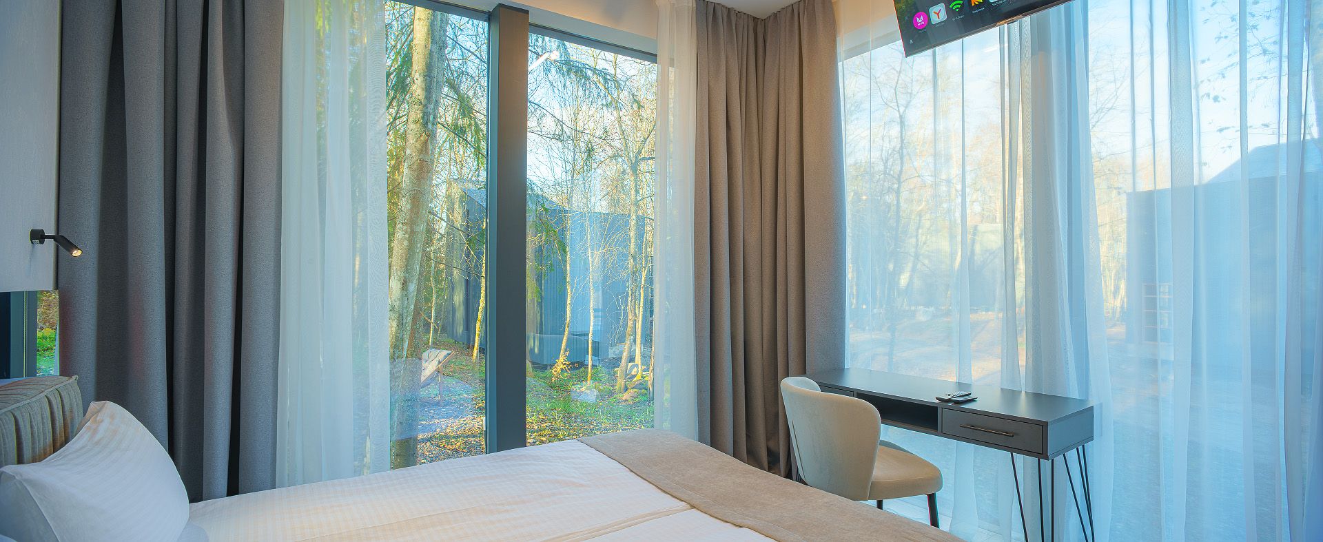 • Панорамные окна 2,7 м. с видом на лес или на озеро;