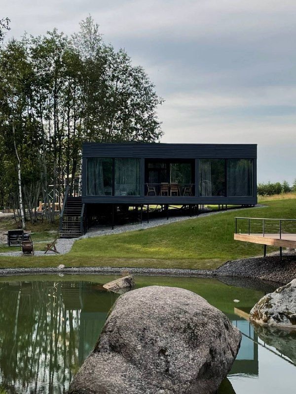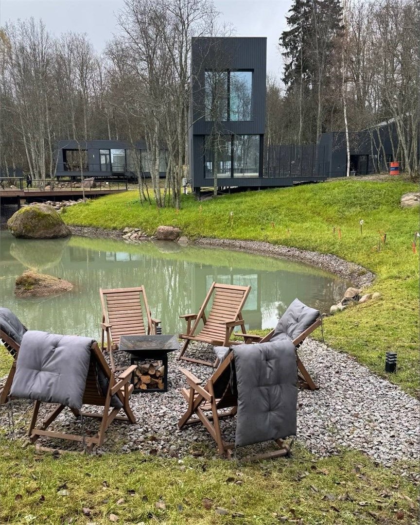 Помимо уютных домов на территории расположен дизайнерский пруд и видовые качели.
