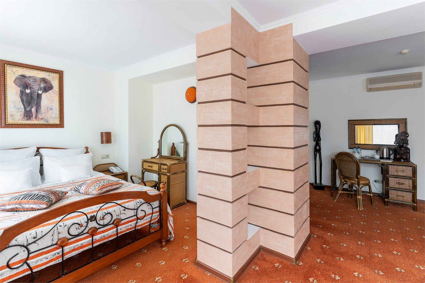 Площадь 35 кв.м. Бесплатный Wifi Двуспальная или две полуторные кровати, двуспальный диван Журнальный или письменный столик Телевизор Мини-холодильник Кондиционер Сейф Душевая кабина Все удобства для гигиены Размещение до 4 гостей....