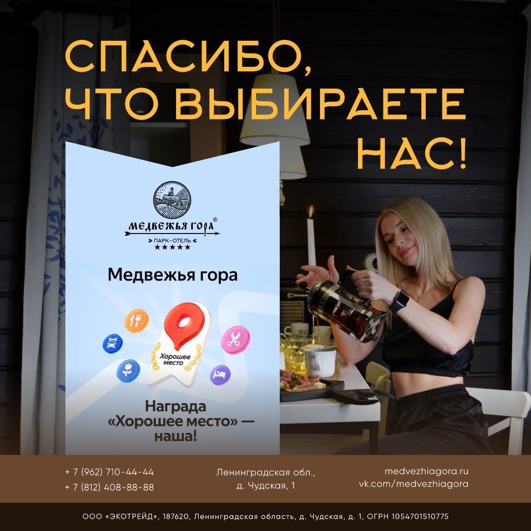 Парк-отель «Медвежья гора» находится в деревне Чудская Ленинградской области. Это отличное место для отдыха на природе. В отеле есть 23 уютных дома, из которых открывается вид на озеро Еглино. Дома  гармонично сочетаются с окружающей природой, создавая спокойную и приятную атмосферу. - Прогулки на квадроциклах, снегоходах и санях по лесу, чтобы посмотреть на растения и животных. - Спортивные площадки с тренажерами для занятий спортом. - Игровая зона с аэрохоккеем и настольным футболом, где весело проведут время и дети, и взрослые. - Русские бани, где можно расслабиться и укрепить здоровье. - Ферма, где можно познакомиться с животными и купить свежие продукты. - Ресторан с блюдами русской кухни, приготовленными из местных продуктов.  На берегу озера есть пляж с беседками и шезлонгами. Летом здесь можно кататься на гидроциклах, SUP-досках, катамаранах и лодках, а также на водных ватрушках. Зимой озеро используют для катания на лыжах и ватрушках. Любителям рыбалки озеро Еглино представляет большой выбор включающий сома, щуку, осетра и белого амура, гарантирует незабываемые впечатления. Для охотников предусмотрены организованные выезды на территорию охотничьих угодий площадью 170 тысяч гектаров, что обеспечивает широкий выбор дичи и высокий уровень безопасности. Парк-отель «Медвежья гора» является оптимальным выбором для тех, кто ищет идеальное место для отдыха на природе. «Медвежья гора» — это место, где можно отдохнуть на природе, расслабиться и хорошо провести время.