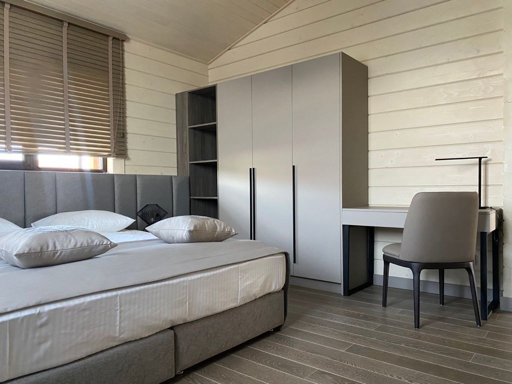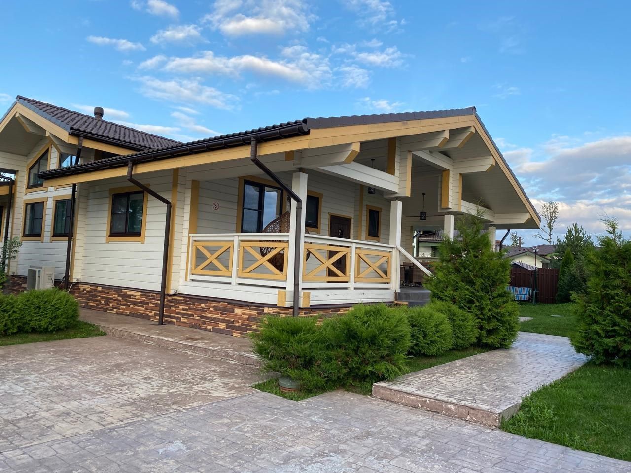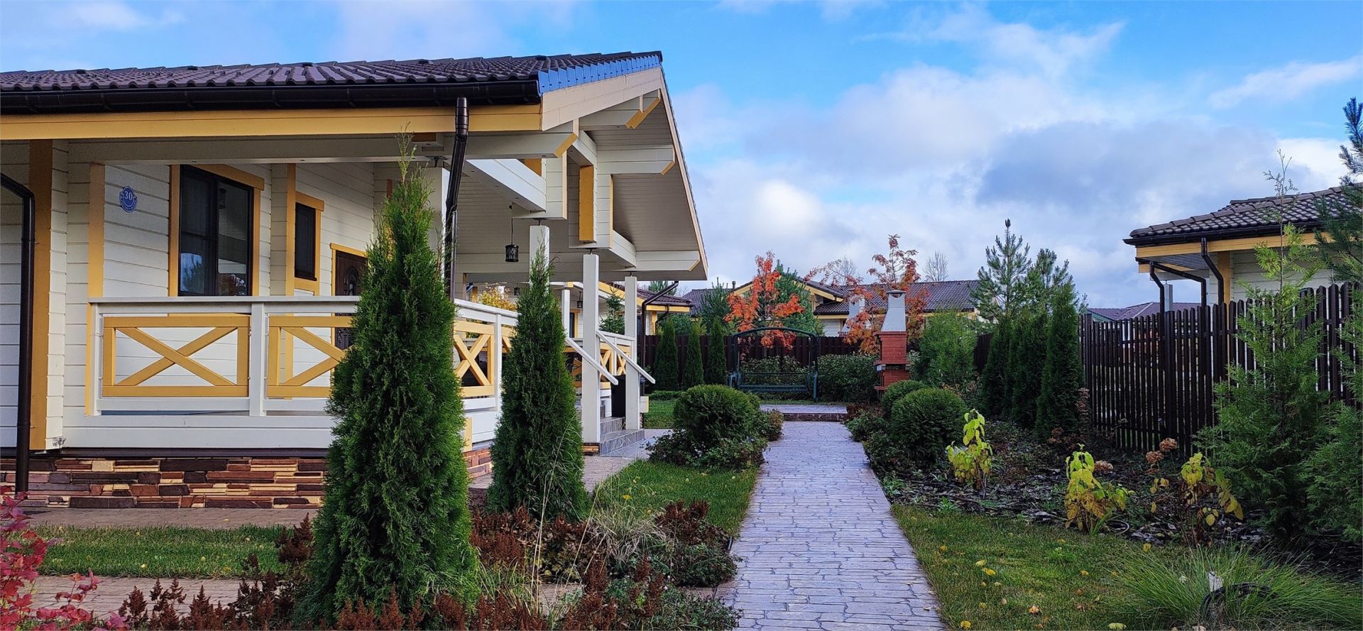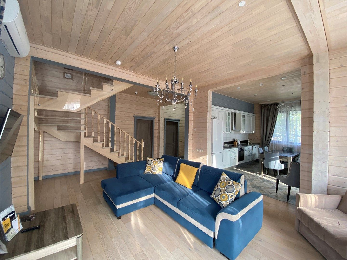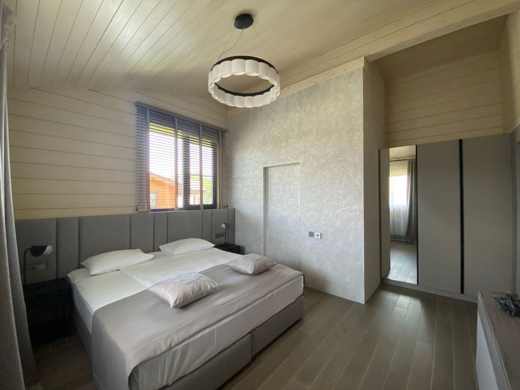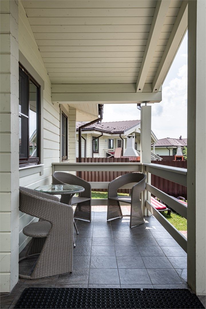 Коттедж площадью 160 кв.м с кондиционером: 3 спальни (одна из которых мастер-спальня с собственной ванной комнатой), кухня-столовая, гостиная с электрическим камином, прихожая со шкафами, два санузла, большая терраса с садовой мебелью.
