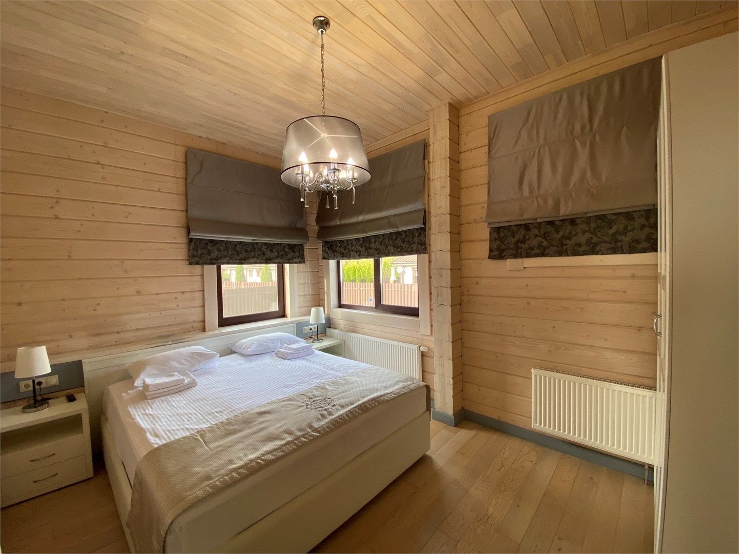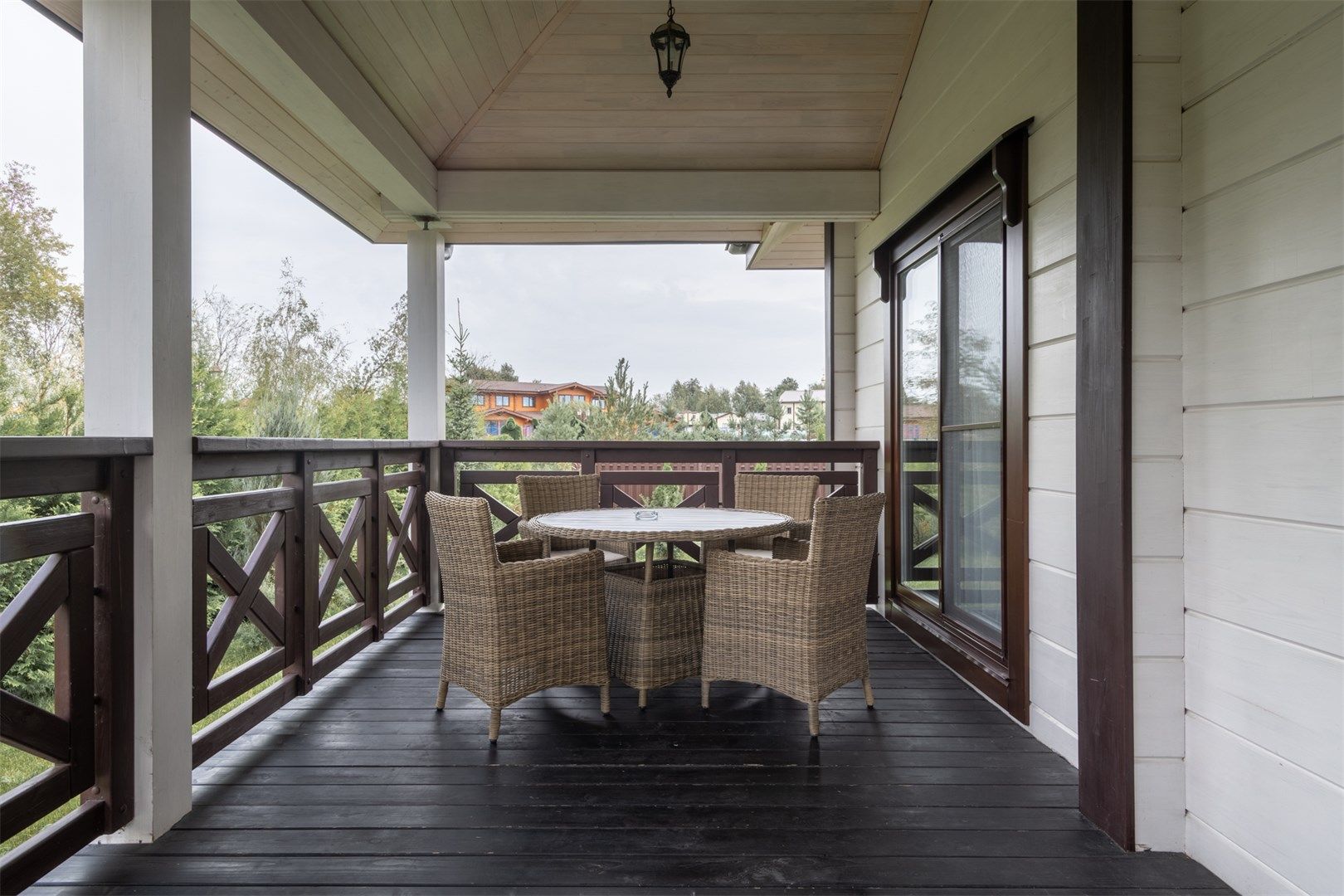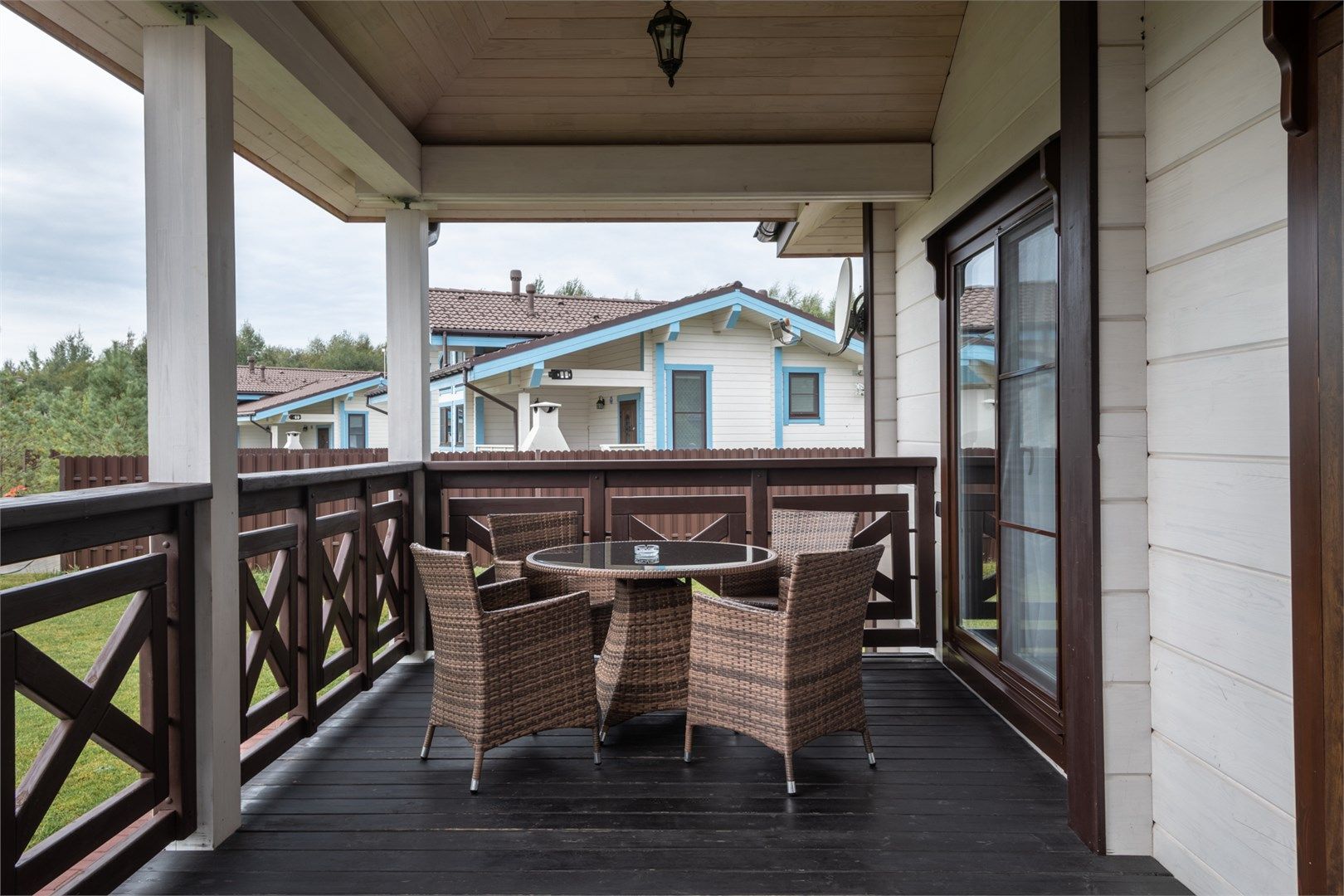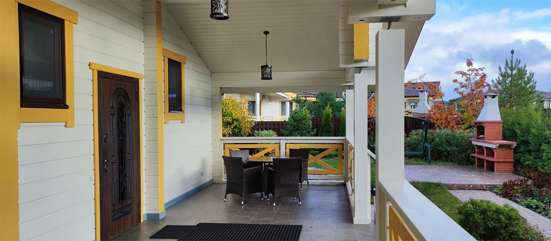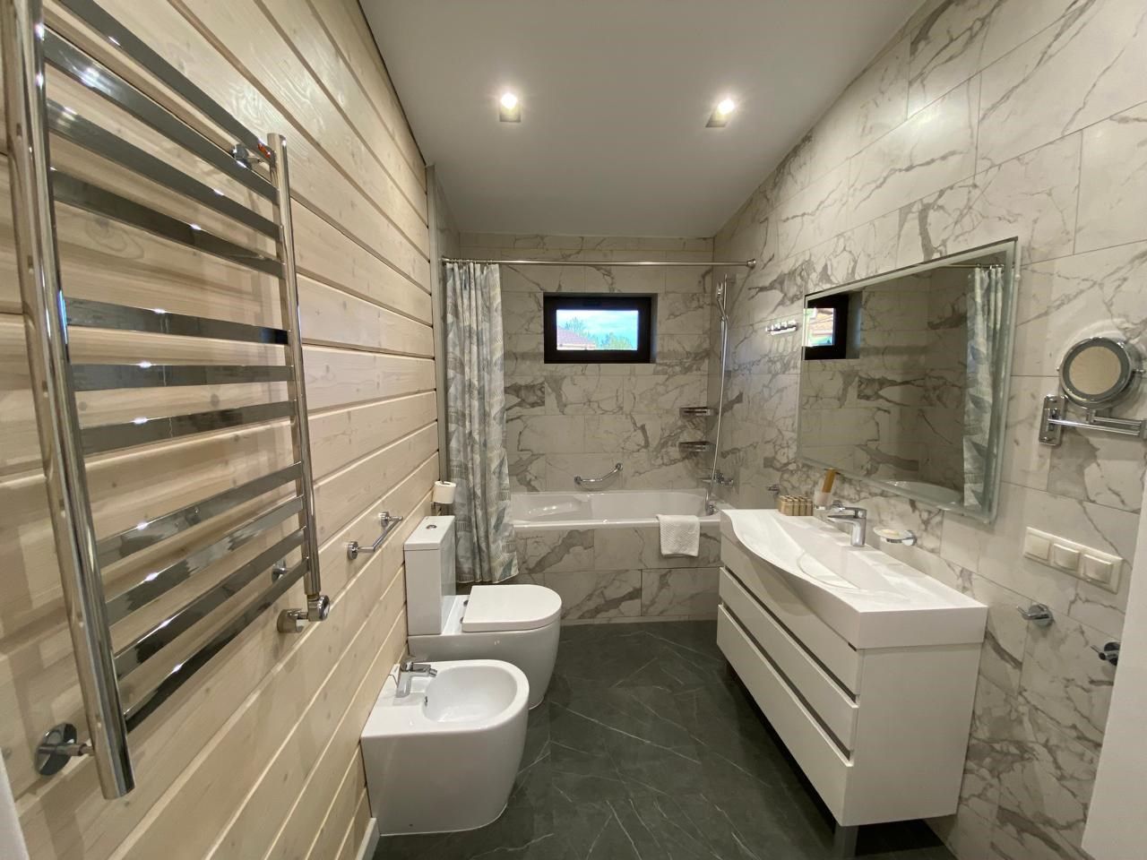 Коттедж площадью 160 кв.м с кондиционером: 3 спальни (одна из которых мастер-спальня с собственной ванной комнатой), кухня-столовая, гостиная с электрическим камином, прихожая со шкафами, два санузла, большая терраса с садовой мебелью.