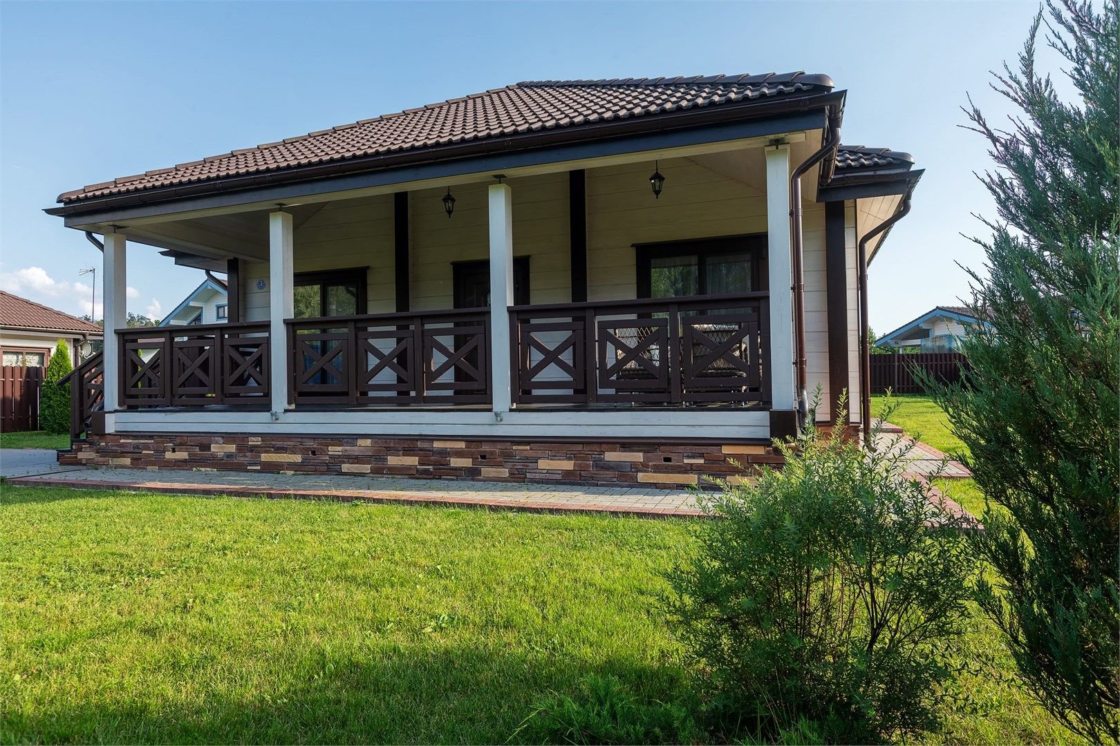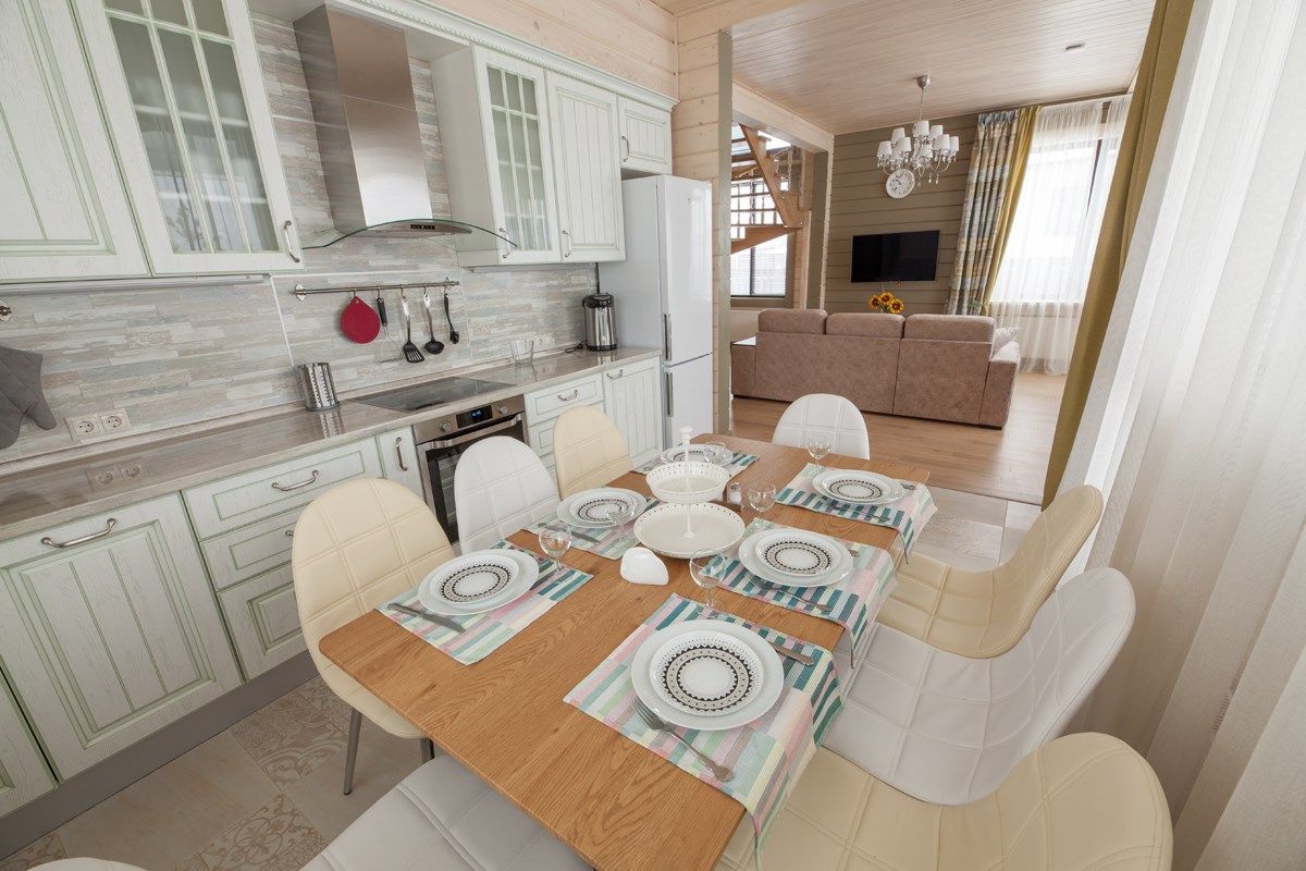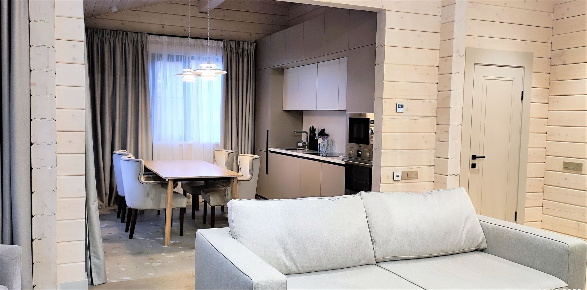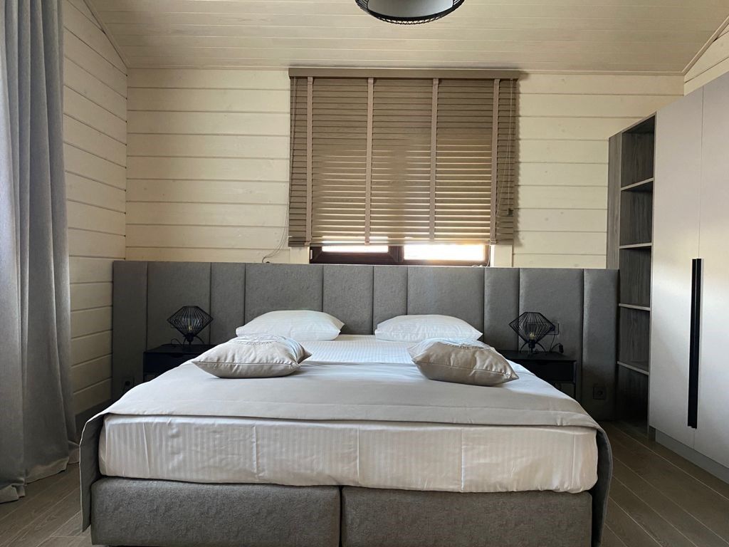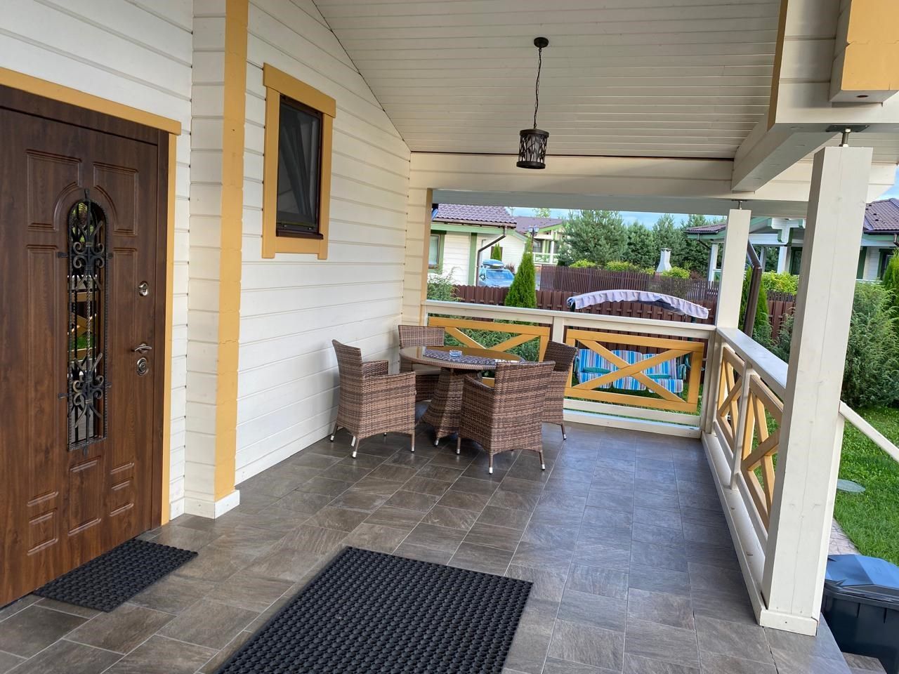 Коттедж площадью 94 м2 с мебелью в светлых тонах (2 спальни с кроватями Queen size, кухня, гостиная, прихожая, холл, санузел с душевой кабиной, туалетная комната, просторная терраса с садовой мебелью).