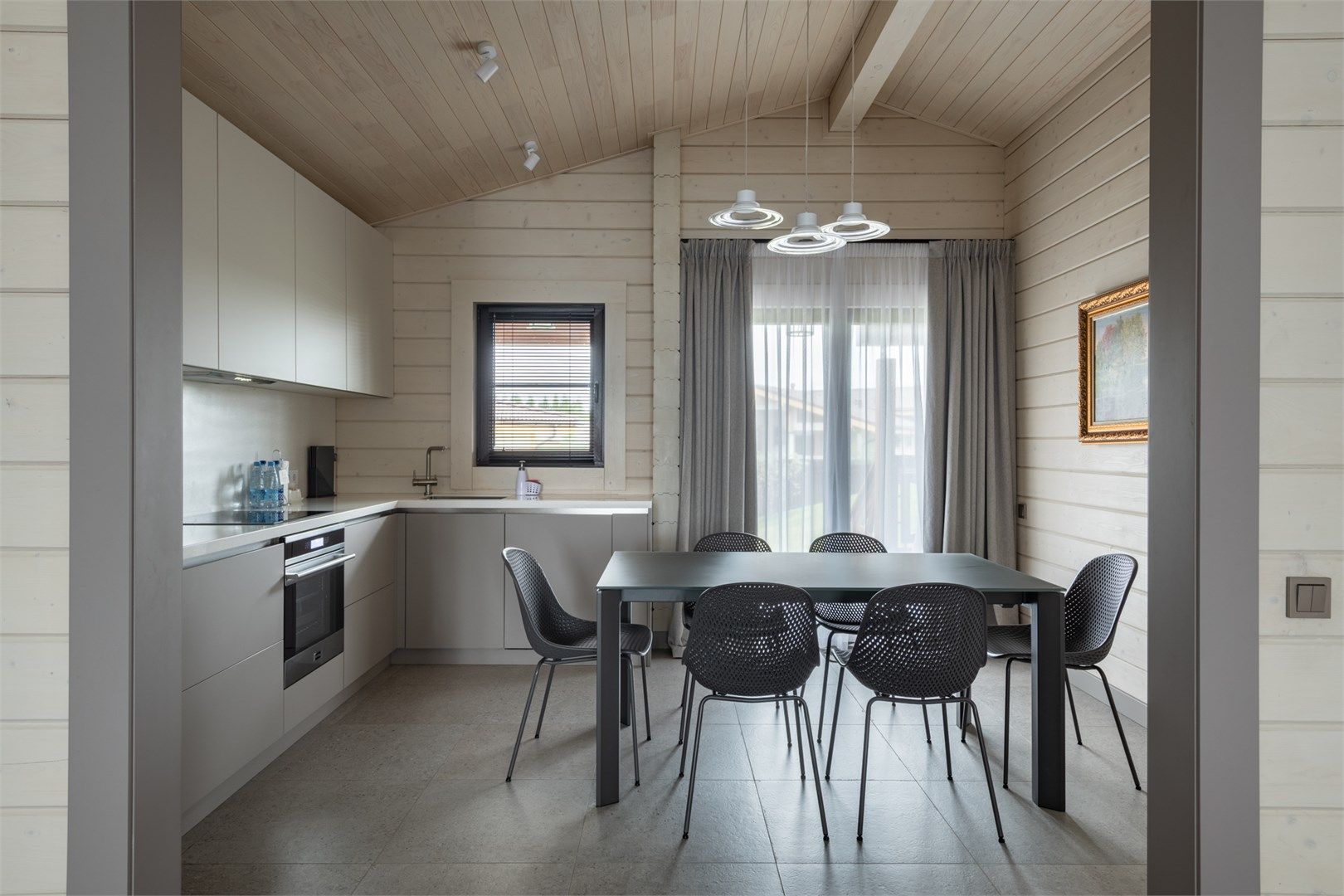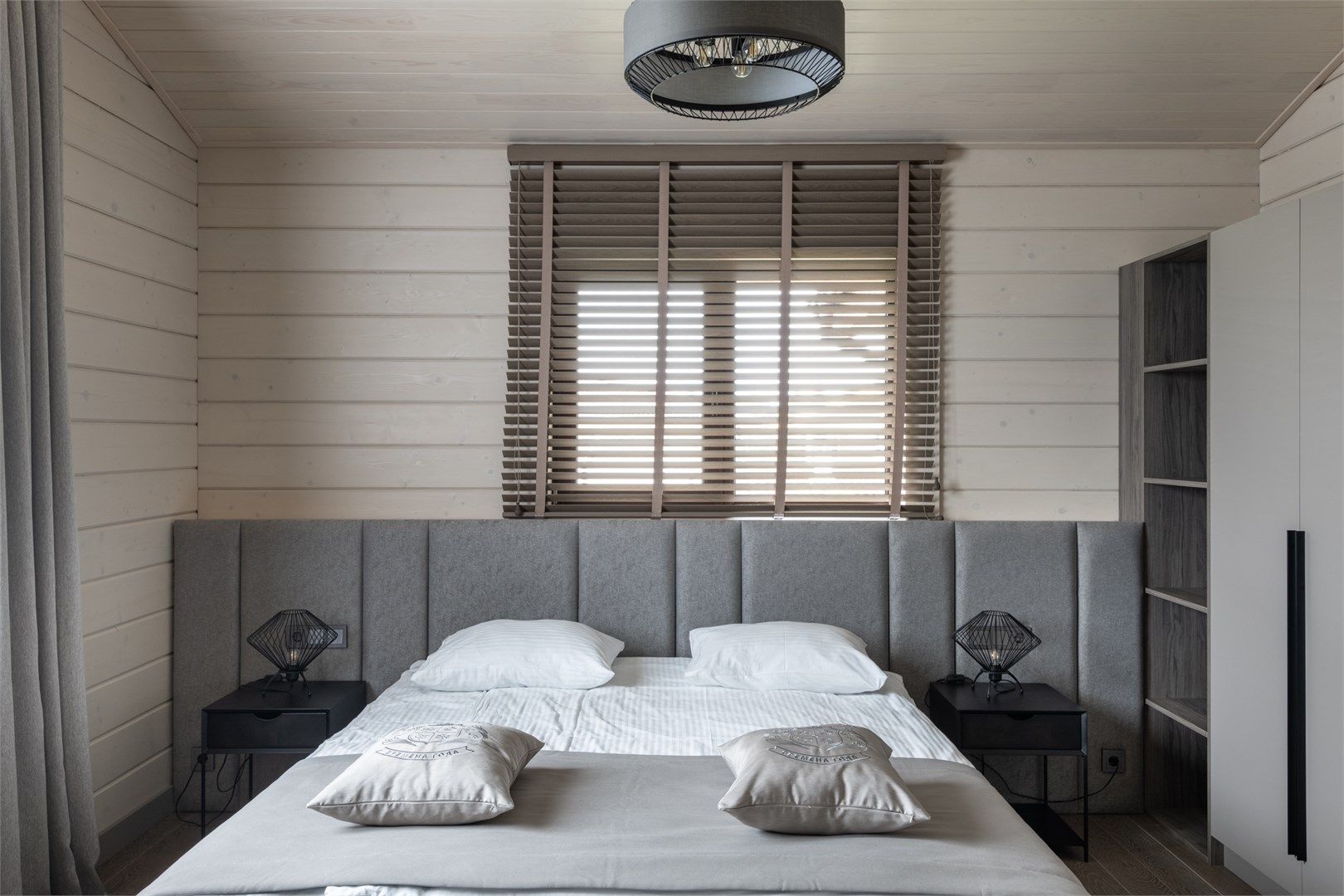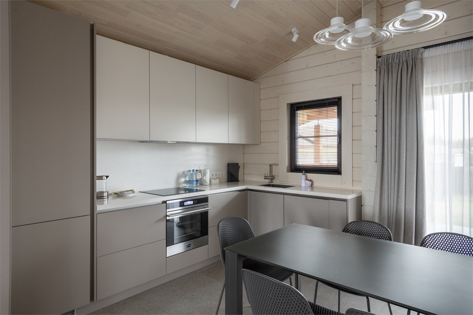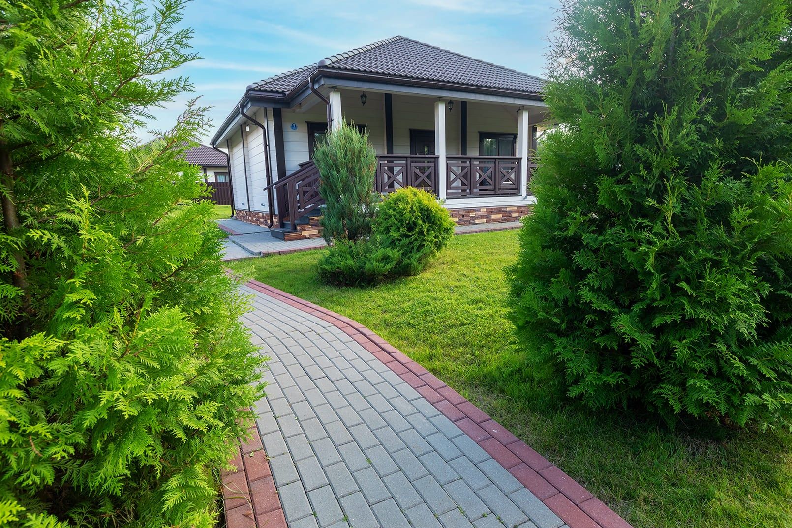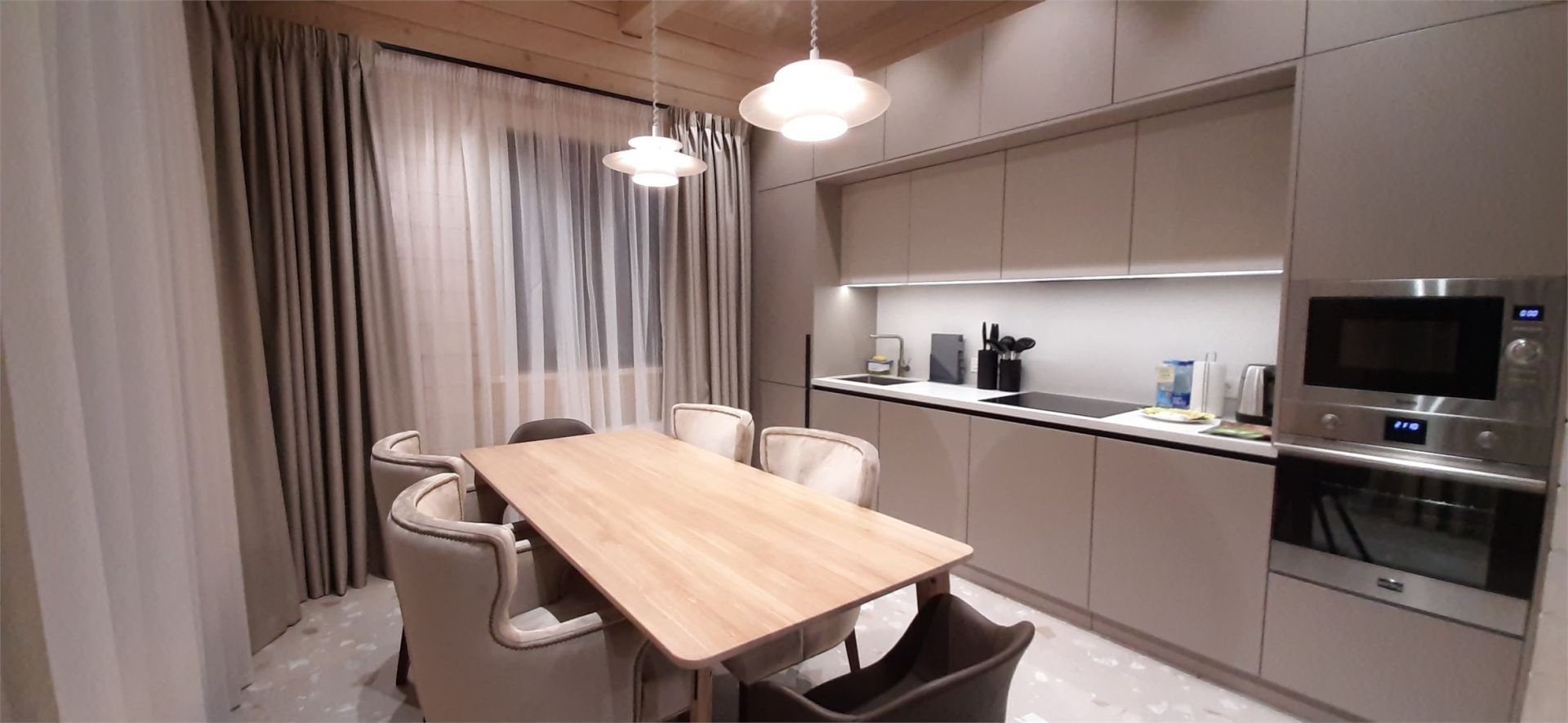 Коттедж площадью 94 м2 с мебелью в светлых тонах (2 спальни с кроватями Queen size, кухня, гостиная, прихожая, холл, санузел с душевой кабиной, туалетная комната, просторная терраса с садовой мебелью).