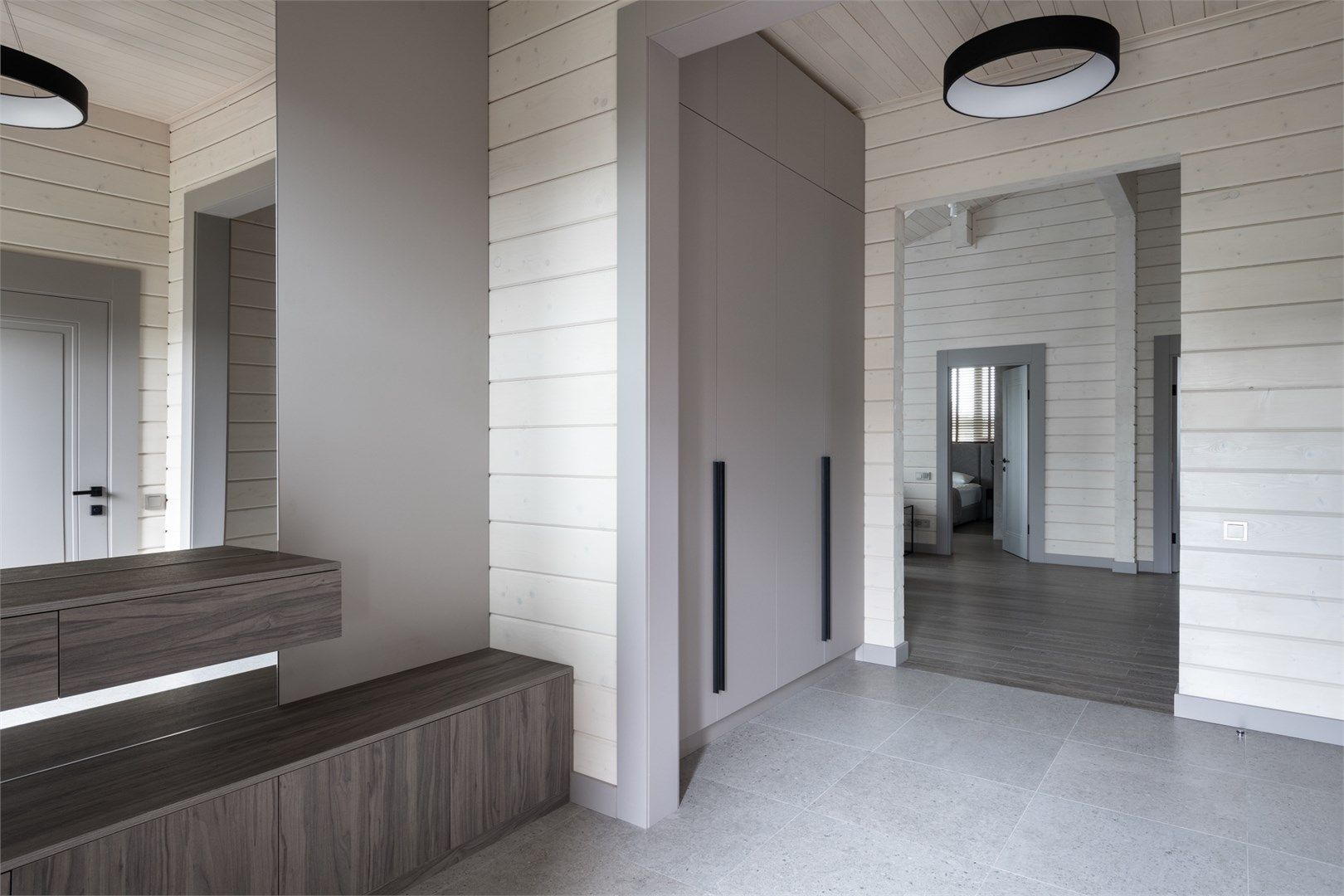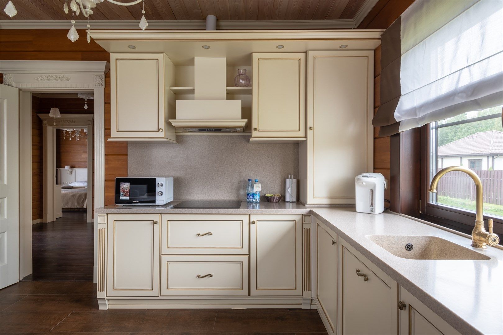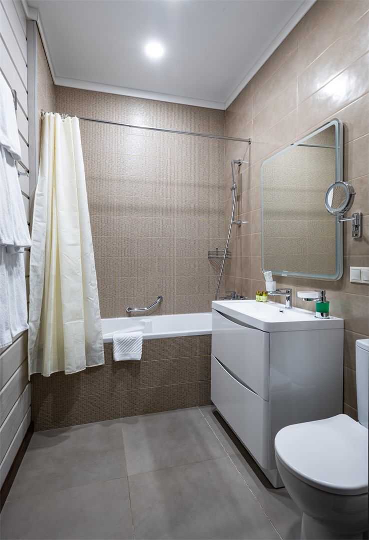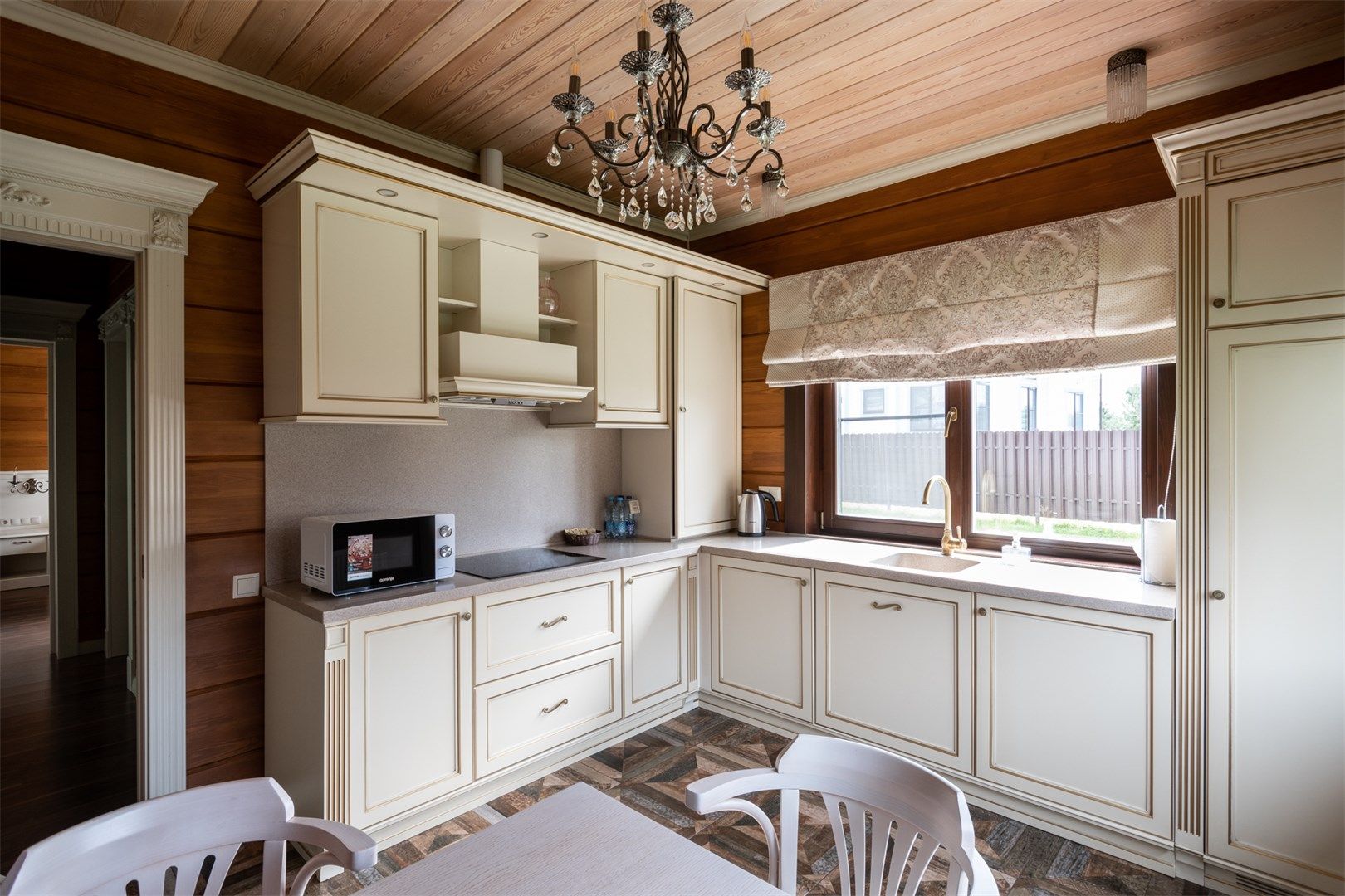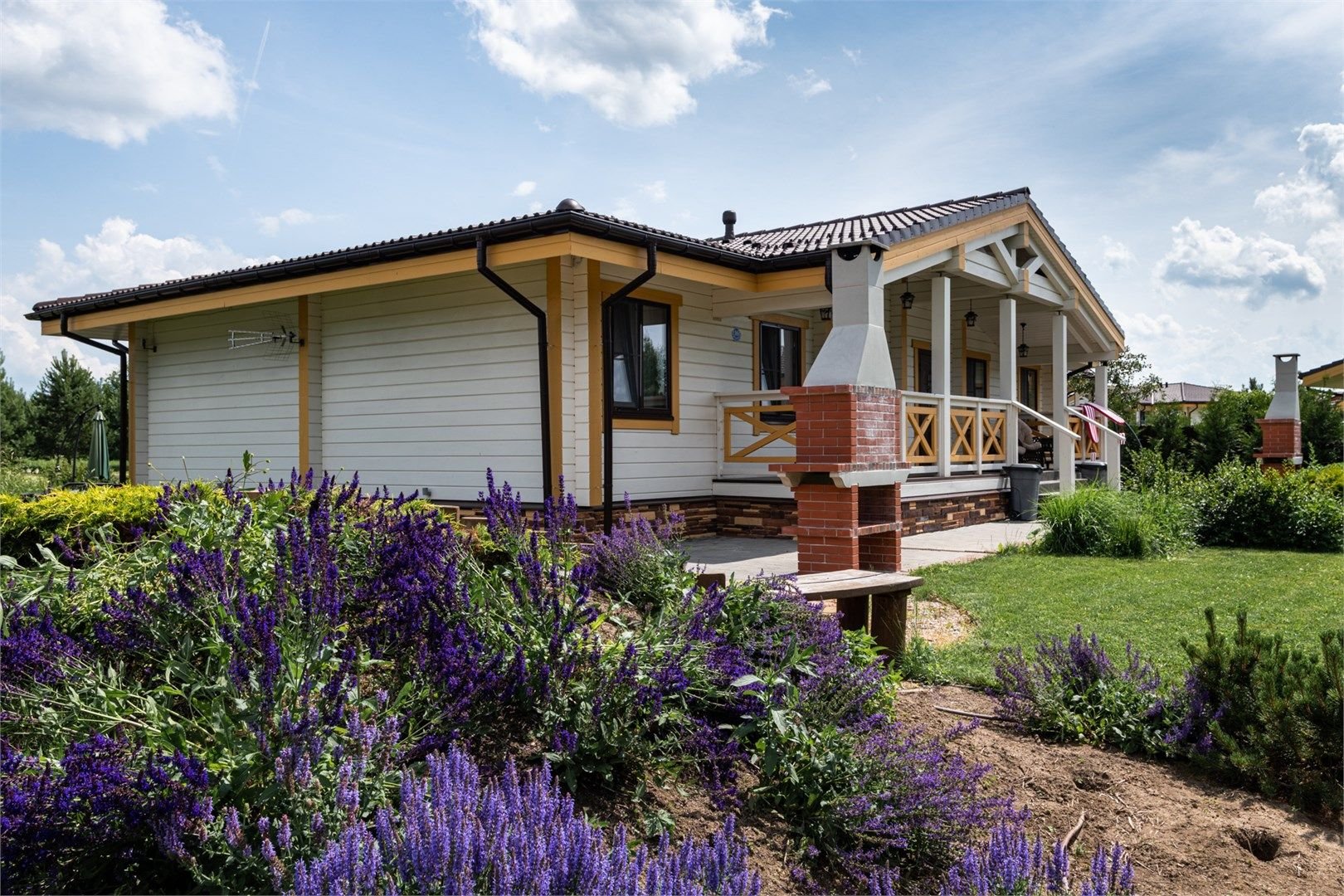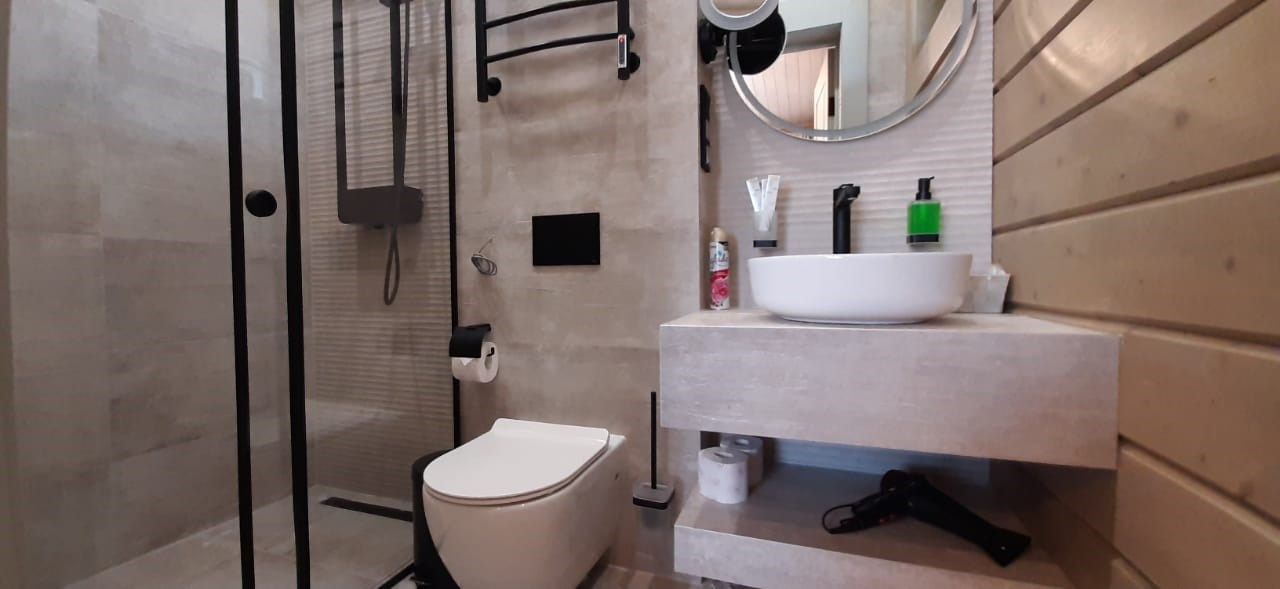 Коттедж площадью 94 м2 с мебелью в светлых тонах (2 спальни с кроватями Queen size, кухня, гостиная, прихожая, холл, санузел с душевой кабиной, туалетная комната, просторная терраса с садовой мебелью).