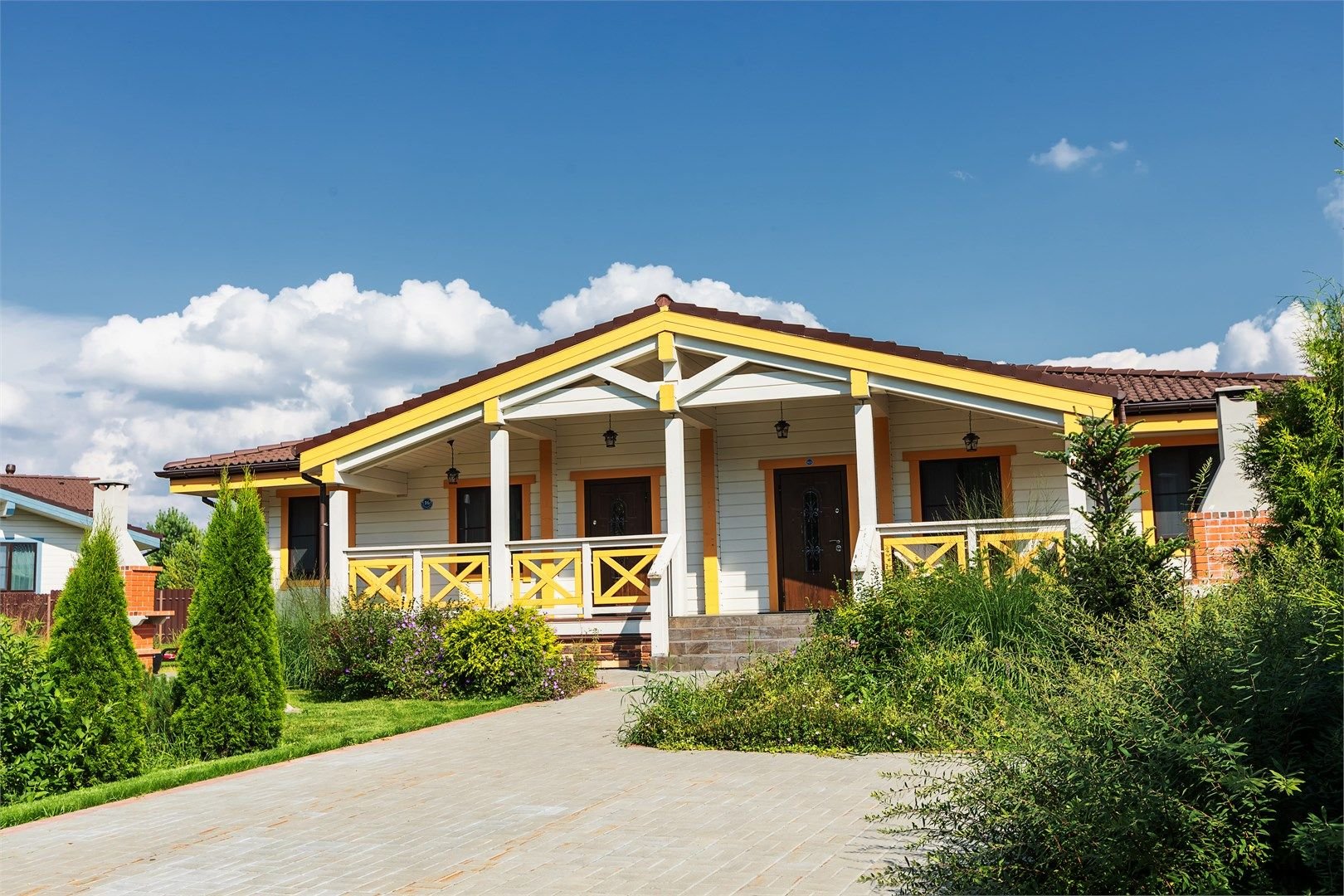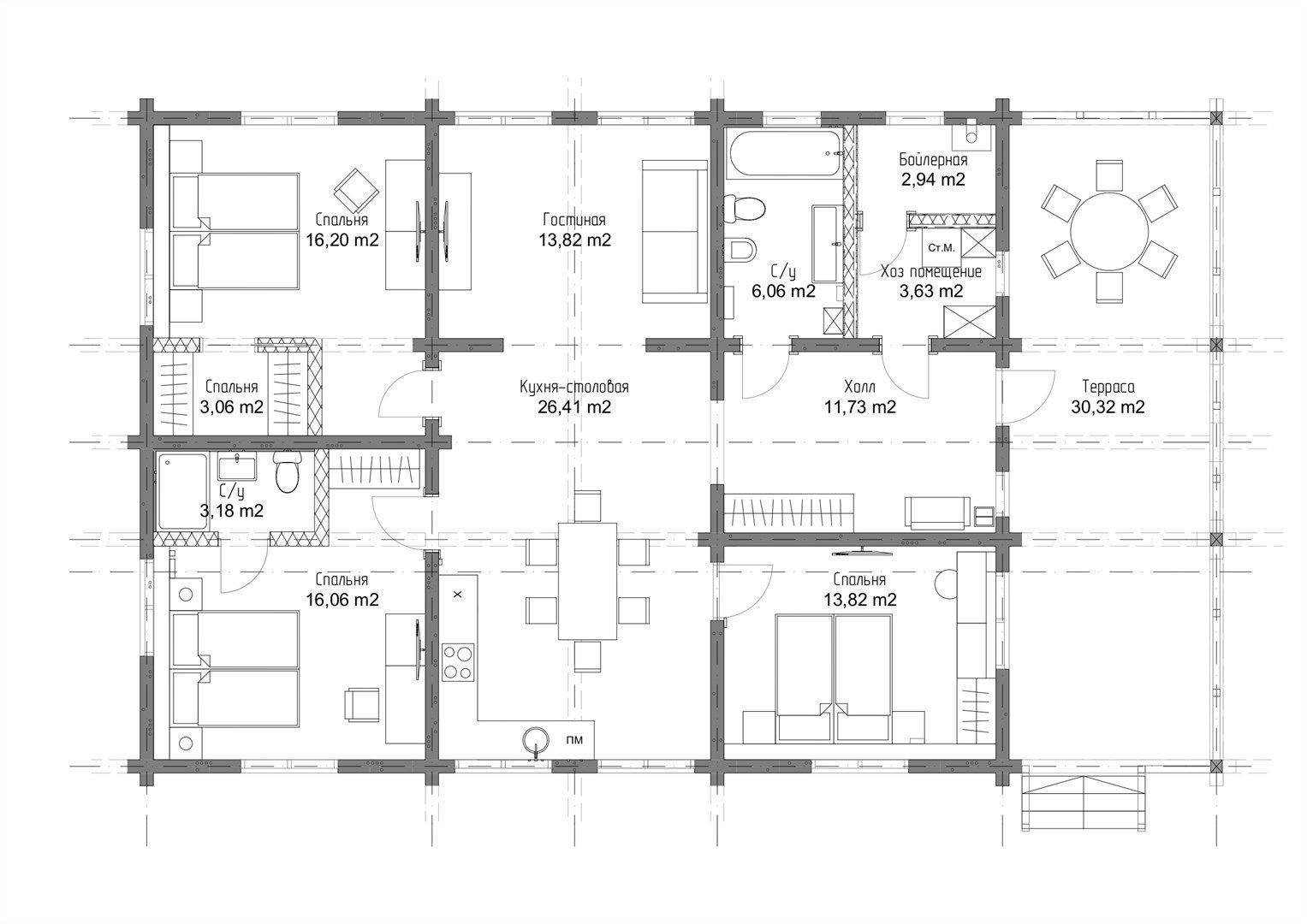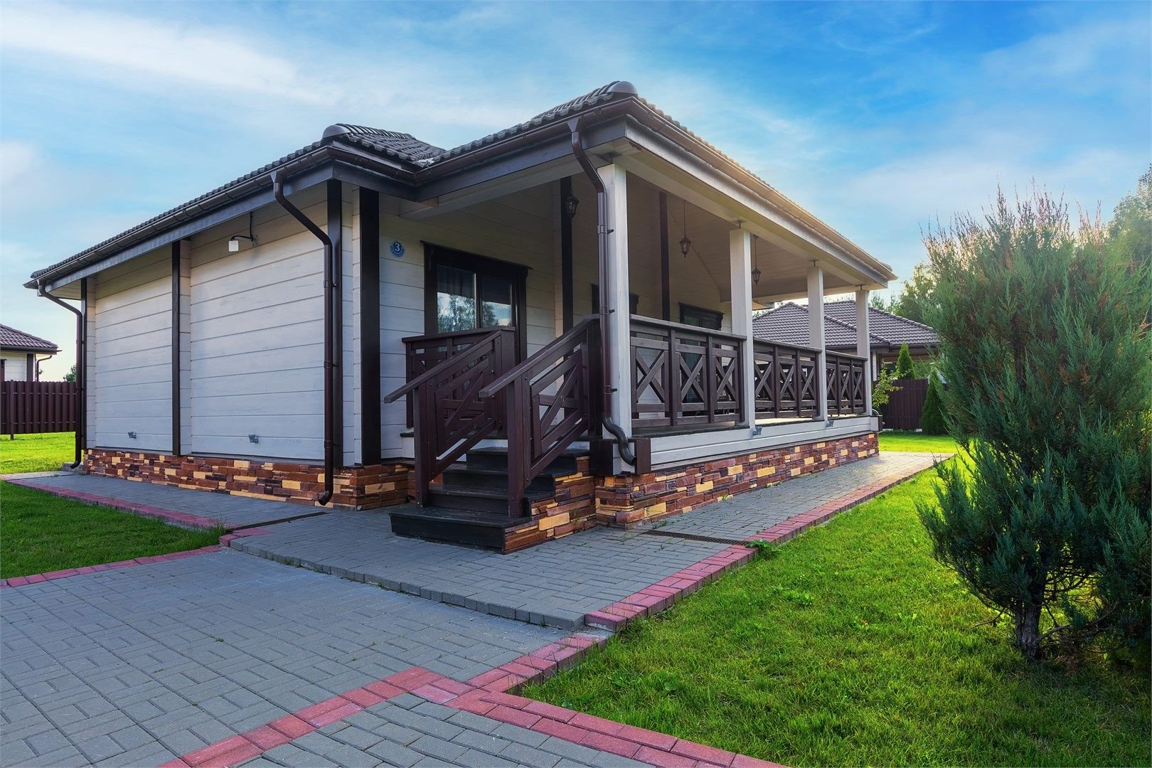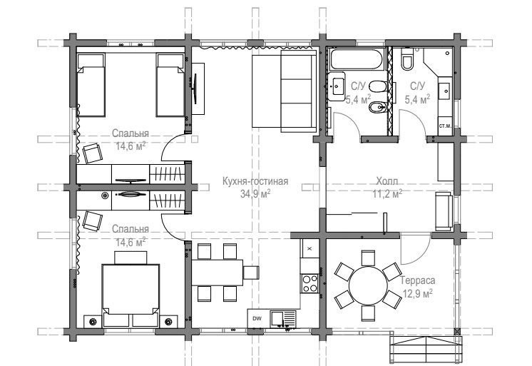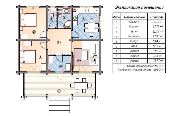 Коттедж площадью 100 кв.м с кондиционером с общим пространством кухни-столовой и гостиной, освещенной окнами "второго света" (2 спальни, кухня-столовая, гостиная, холл, санузел с ванной, туалетная комната, терраса с садовой мебелью).