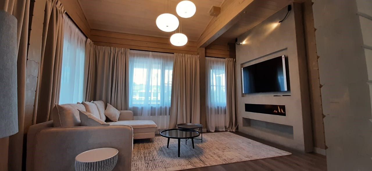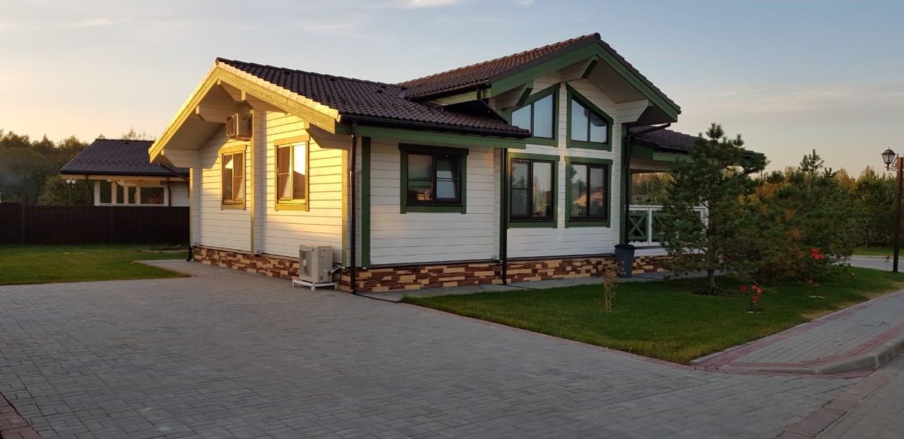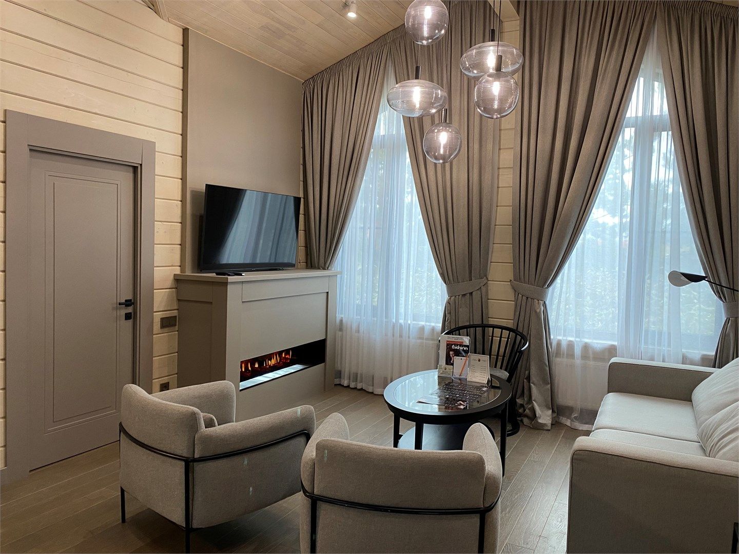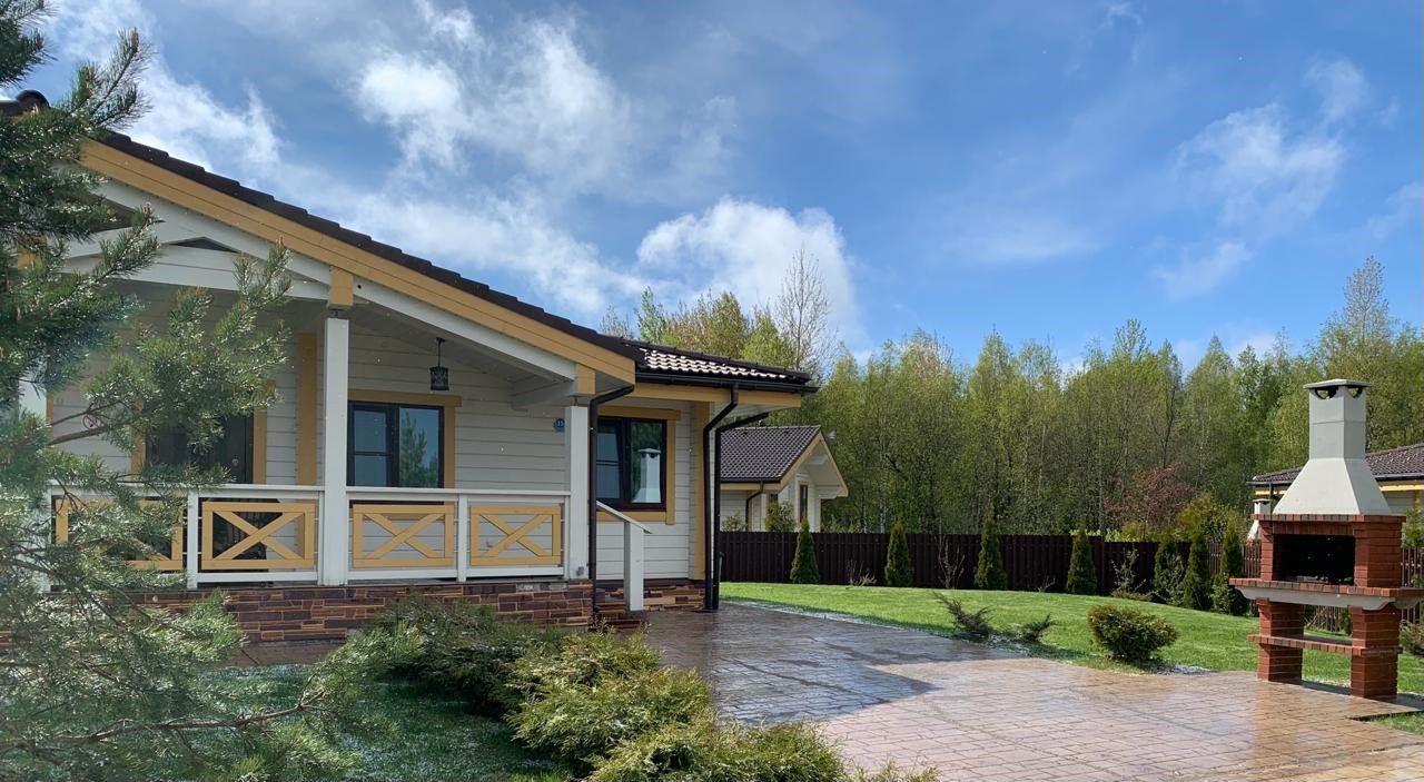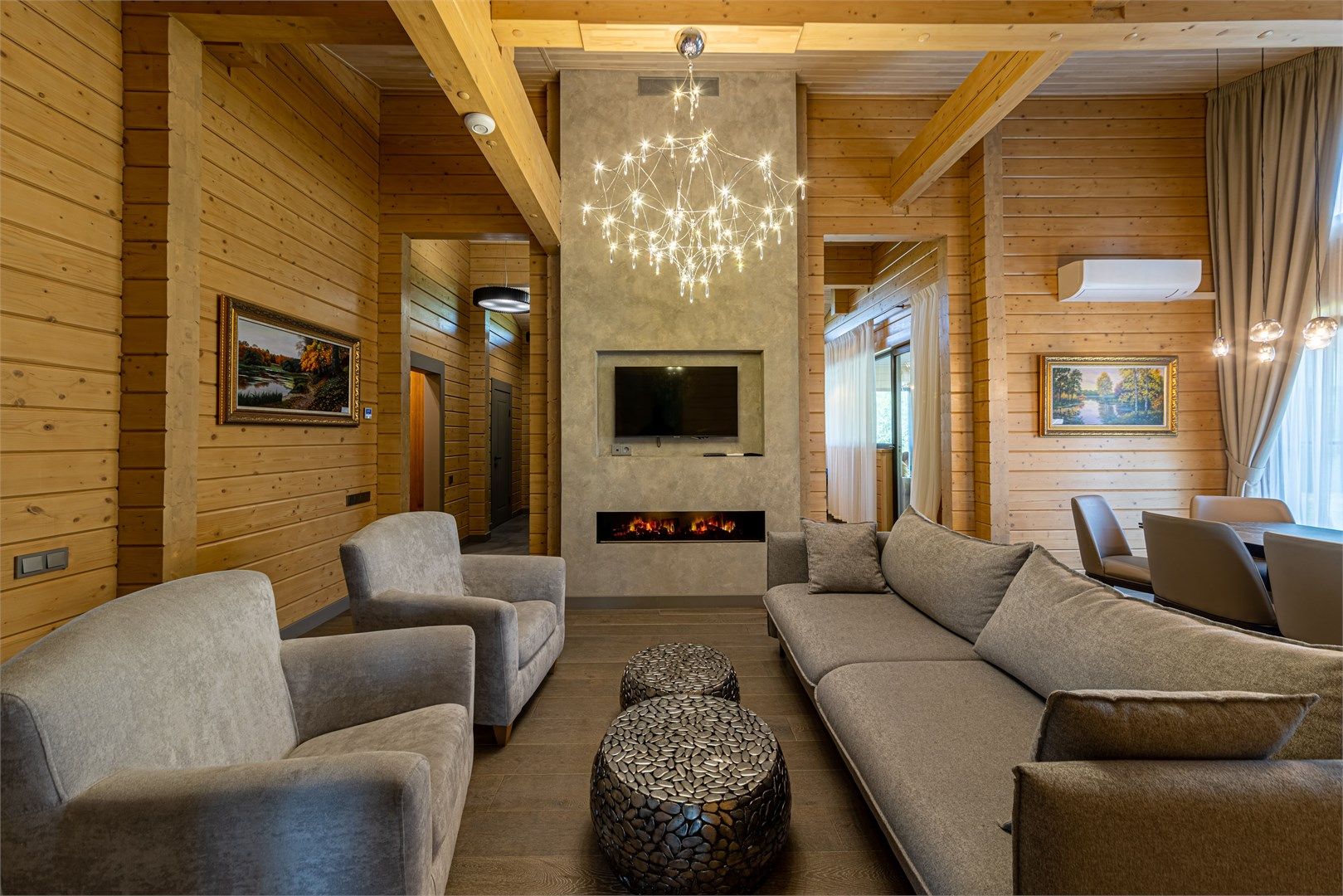 VIP коттедж с дизайнерским решением обустройства интерьера площадью 100 кв.м с кондиционером в гостиной с электрическим камином и кухней-столовой (2 спальни, кухня-столовая, гостиная, прихожая со встроенными шкафами, два санузла, большая терраса с садовой мебелью).