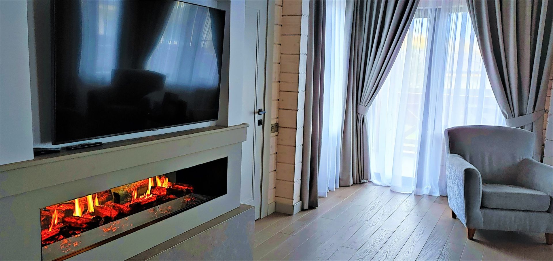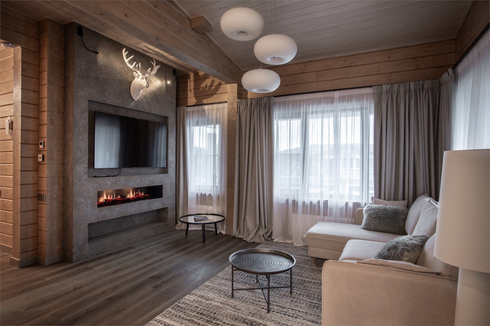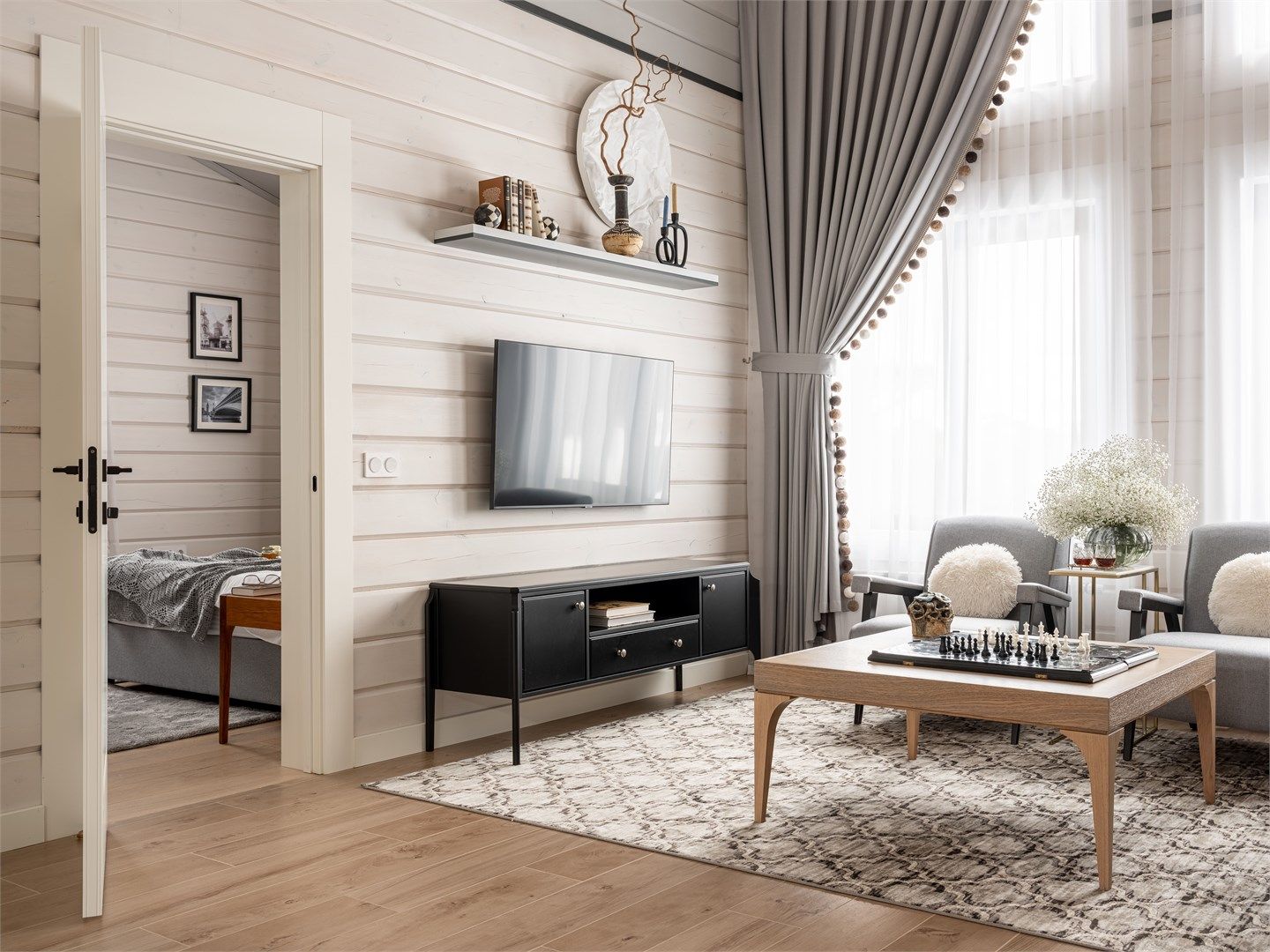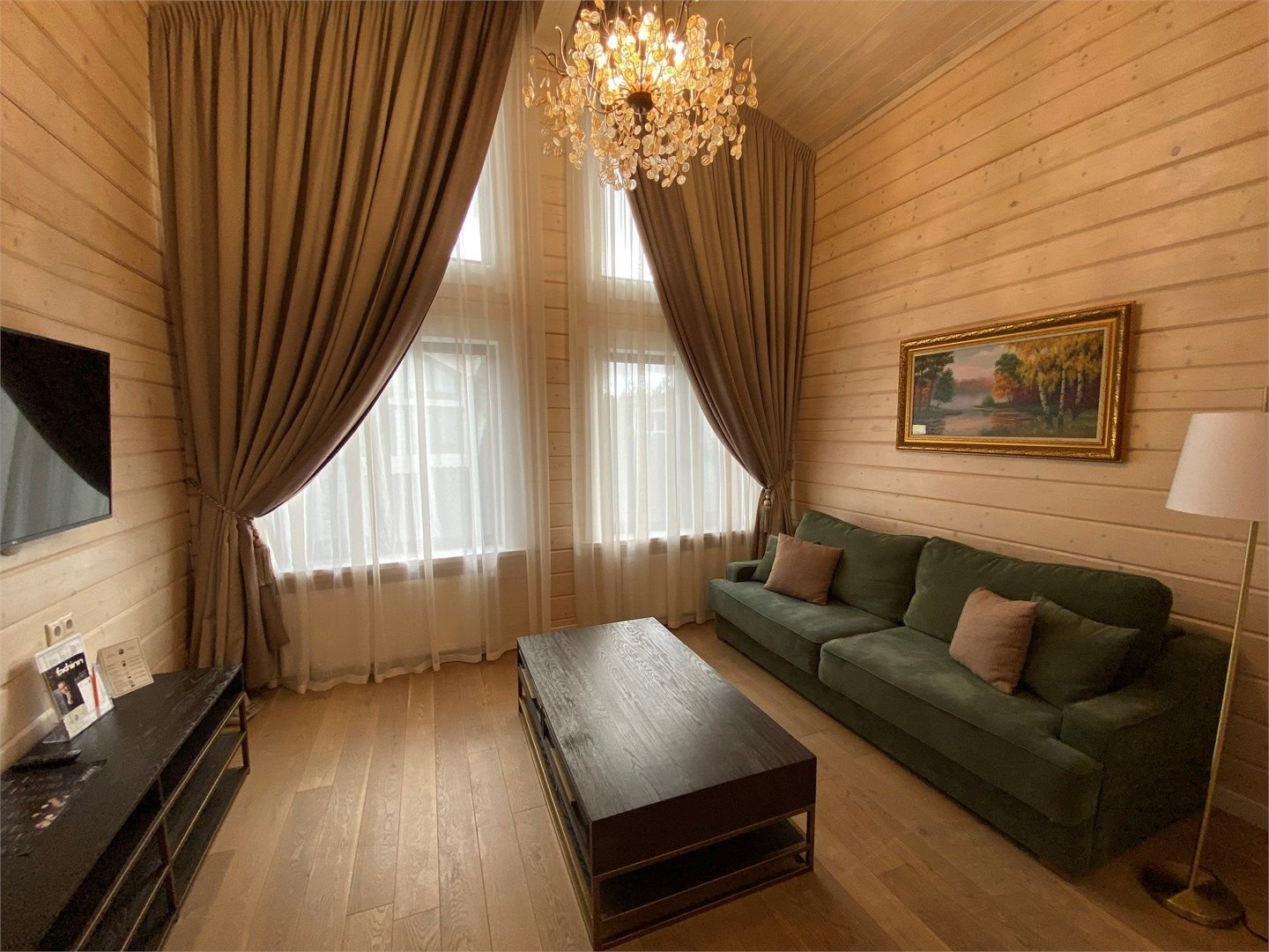 VIP коттедж с дизайнерским решением обустройства интерьера площадью 100 кв.м с кондиционером в гостиной с электрическим камином и кухней-столовой (2 спальни, кухня-столовая, гостиная, прихожая со встроенными шкафами, два санузла, большая терраса с садовой мебелью).