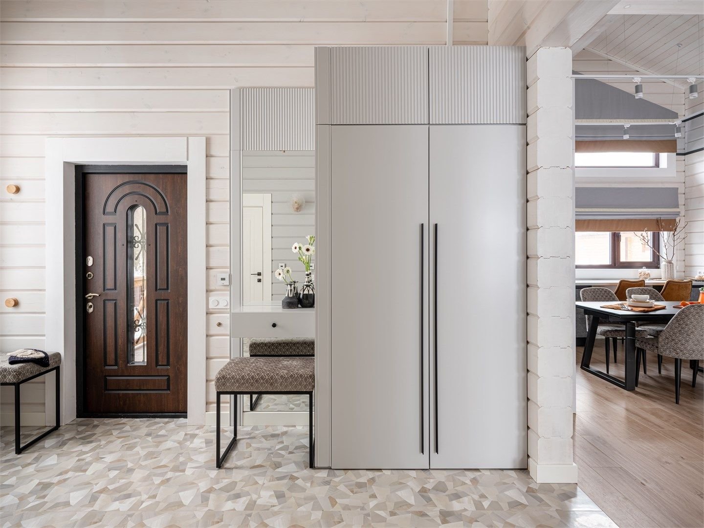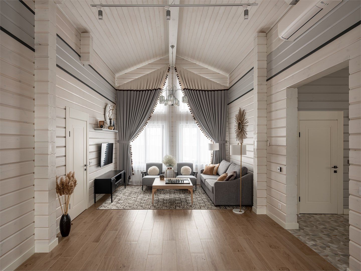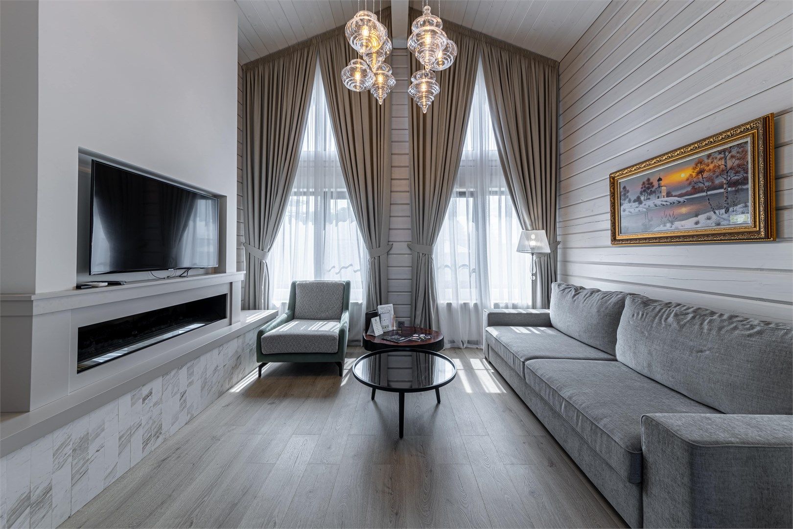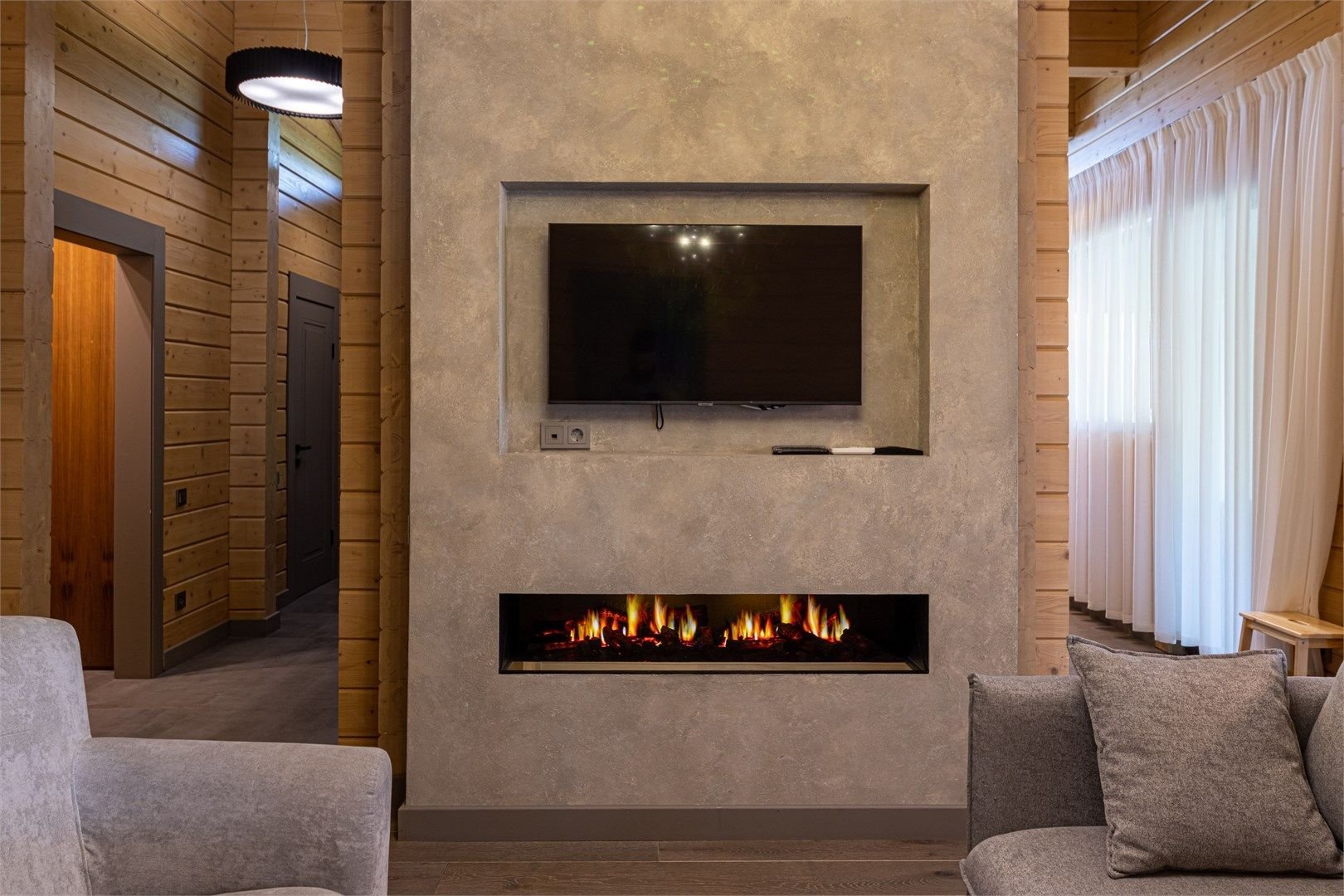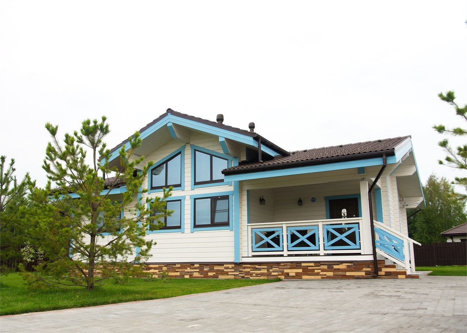 VIP коттедж с дизайнерским решением обустройства интерьера площадью 100 кв.м с кондиционером в гостиной с электрическим камином и кухней-столовой (2 спальни, кухня-столовая, гостиная, прихожая со встроенными шкафами, два санузла, большая терраса с садовой мебелью).