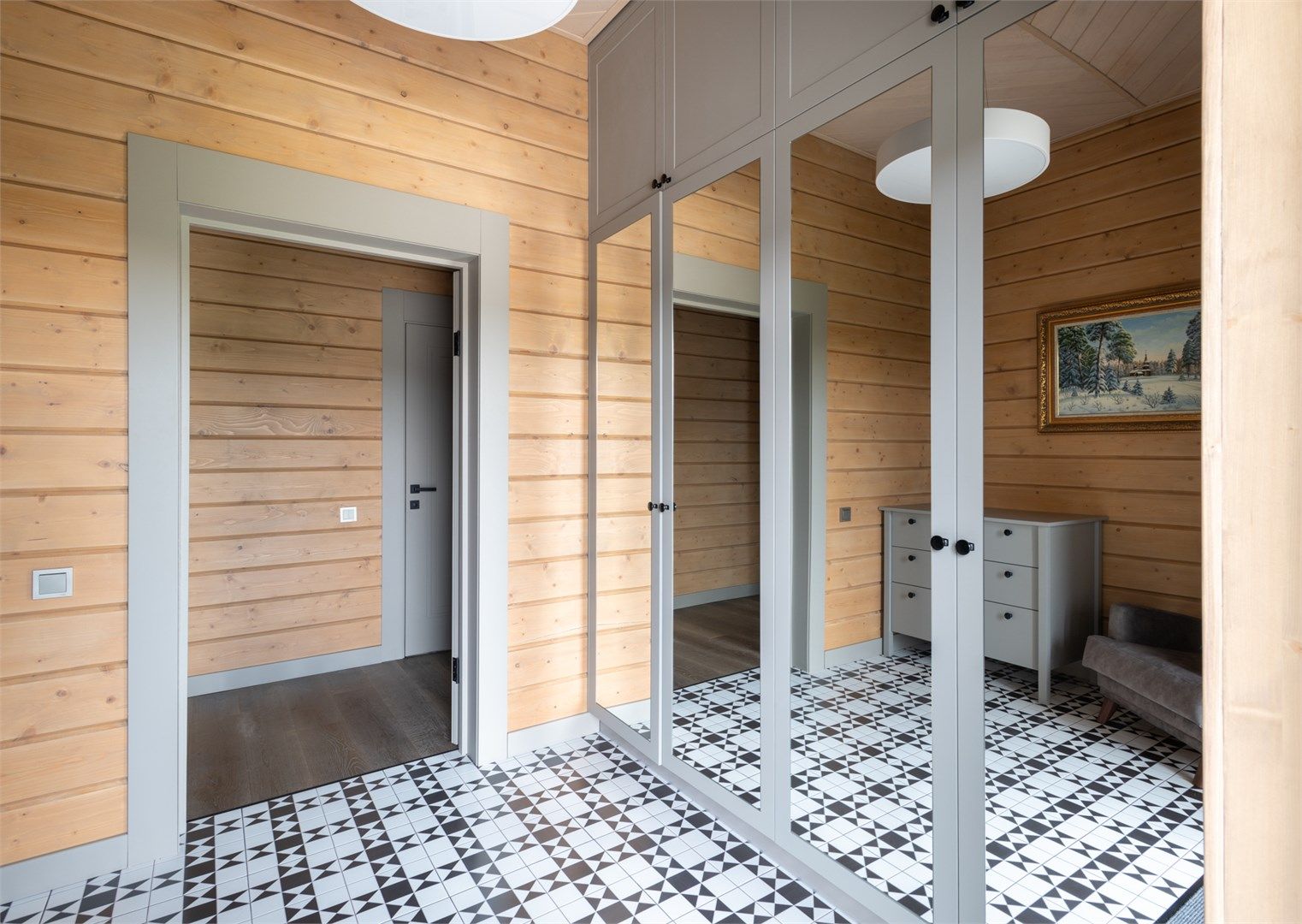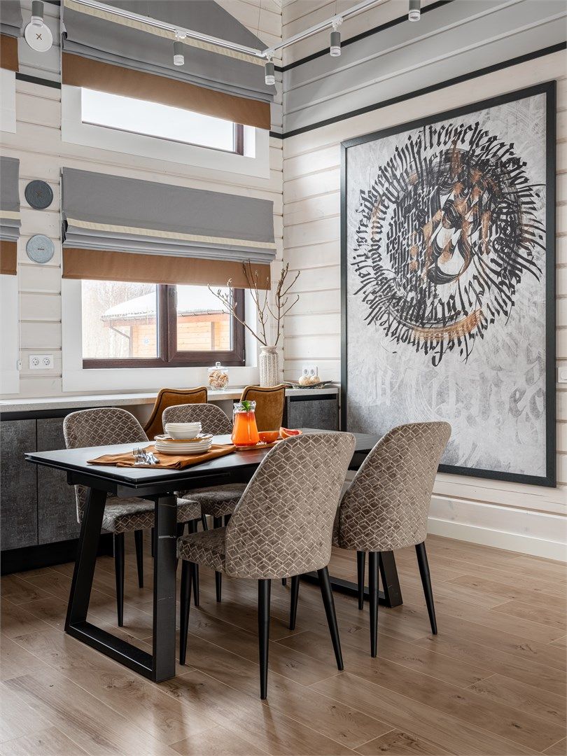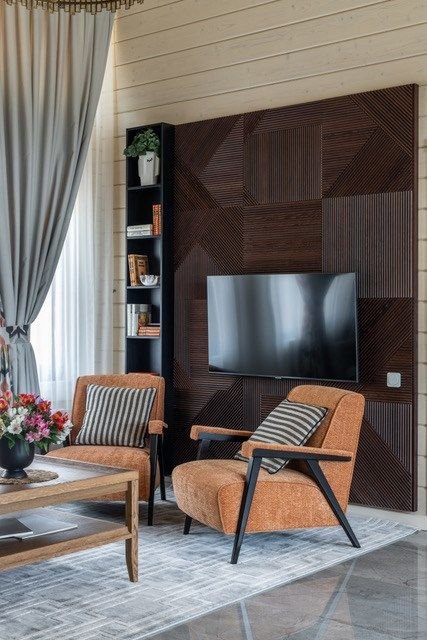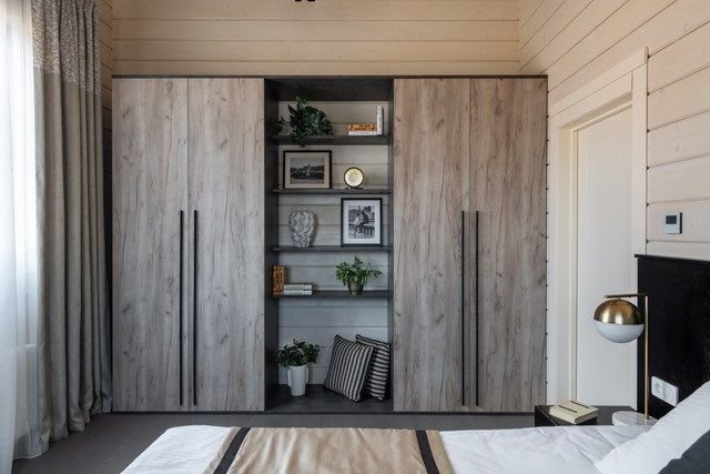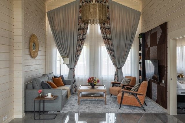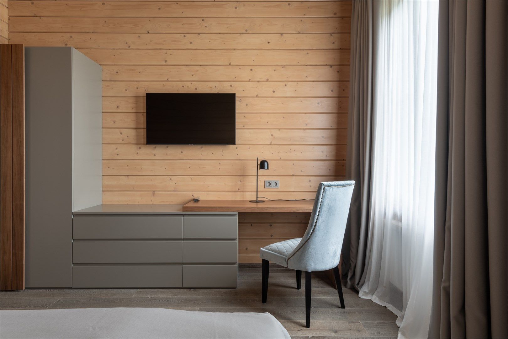 VIP коттедж с дизайнерским решением обустройства интерьера площадью 100 кв.м с кондиционером в гостиной с электрическим камином и кухней-столовой (2 спальни, кухня-столовая, гостиная, прихожая со встроенными шкафами, два санузла, большая терраса с садовой мебелью).