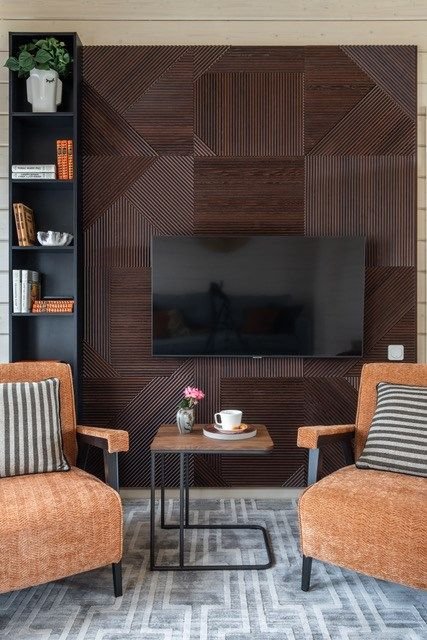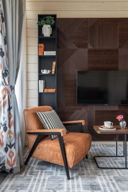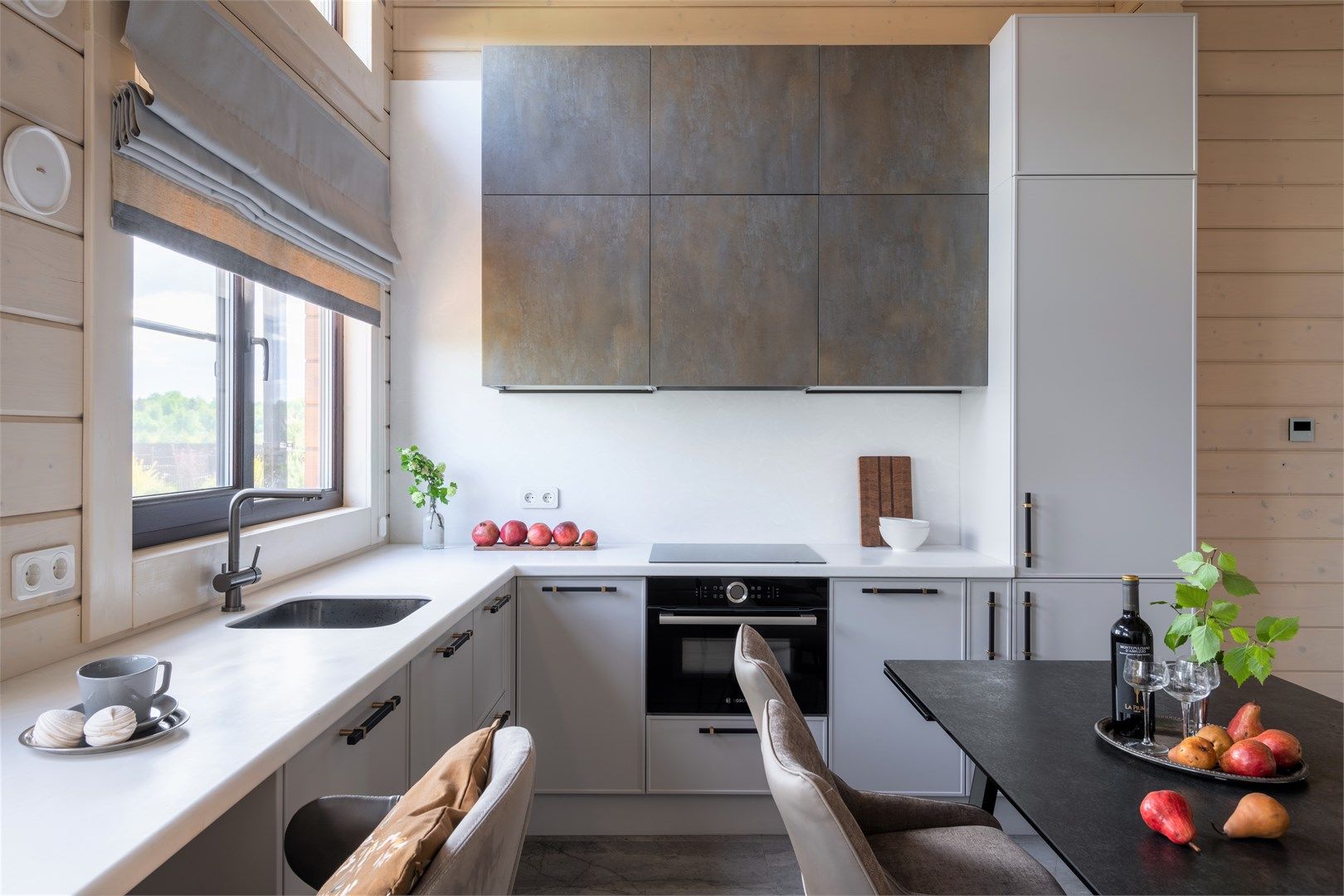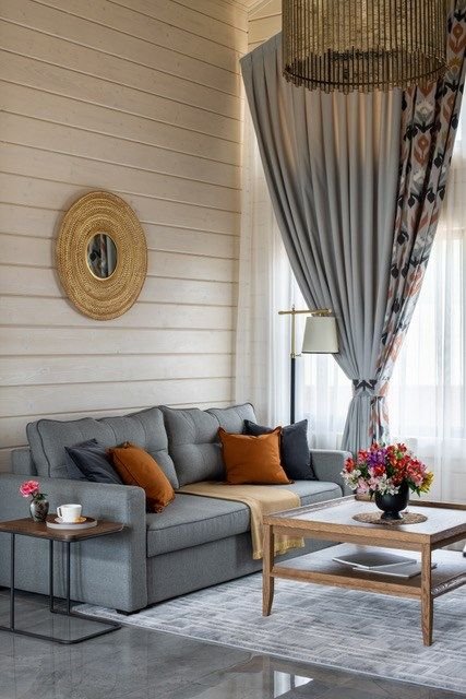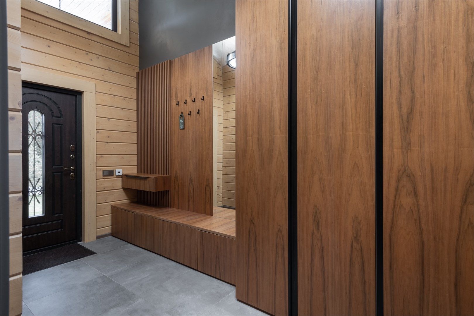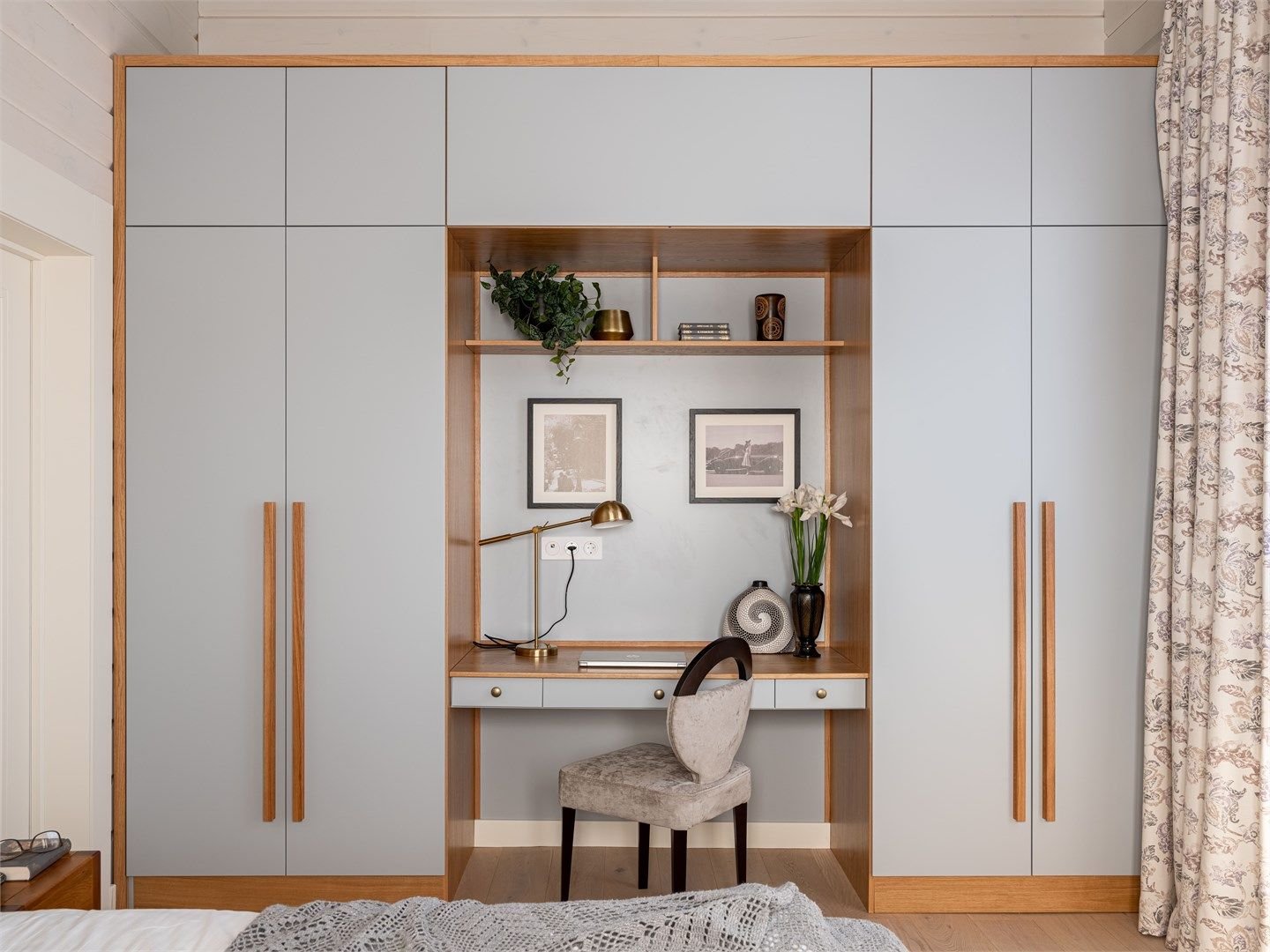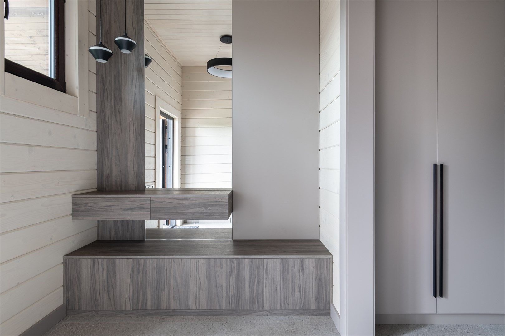 VIP коттедж с дизайнерским решением обустройства интерьера площадью 100 кв.м с кондиционером в гостиной с электрическим камином и кухней-столовой (2 спальни, кухня-столовая, гостиная, прихожая со встроенными шкафами, два санузла, большая терраса с садовой мебелью).