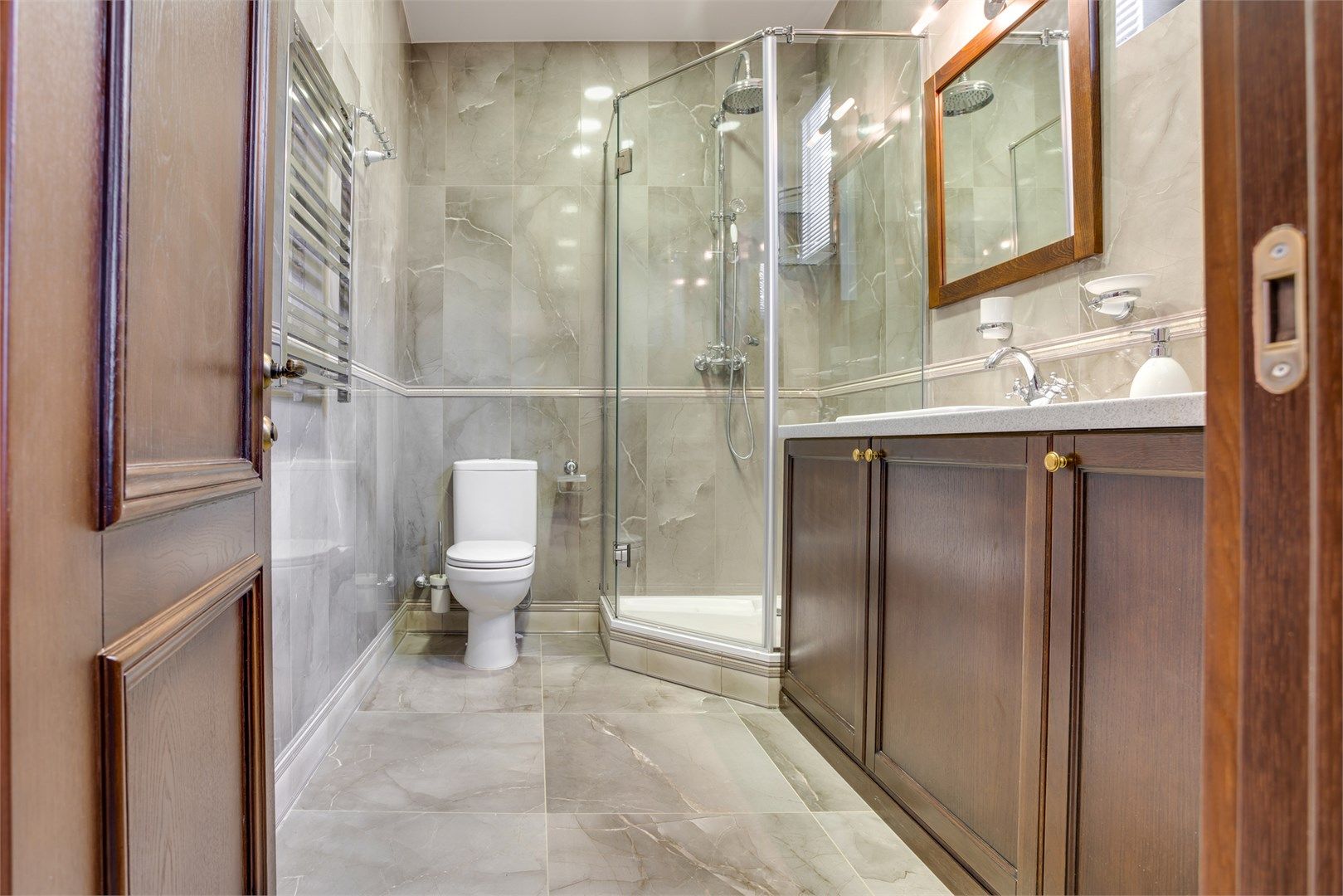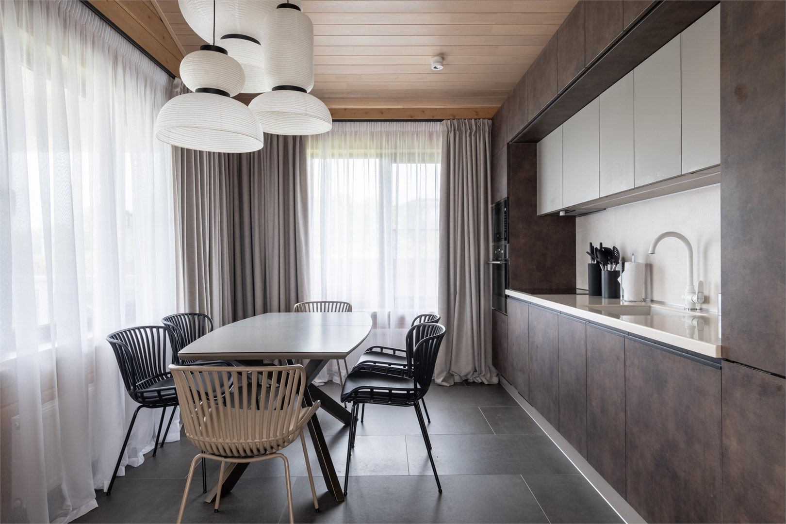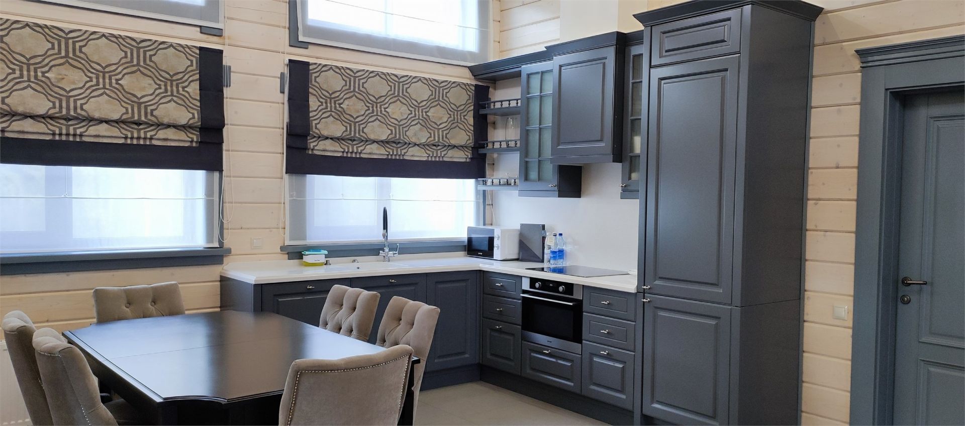 Коттедж площадью 94 кв.м с мебелью в темных тонах (2 спальни с двуспальными кроватями, кухня, гостиная, прихожая, холл, санузел с душевой кабиной, туалетная комната, просторная терраса с садовой мебелью).