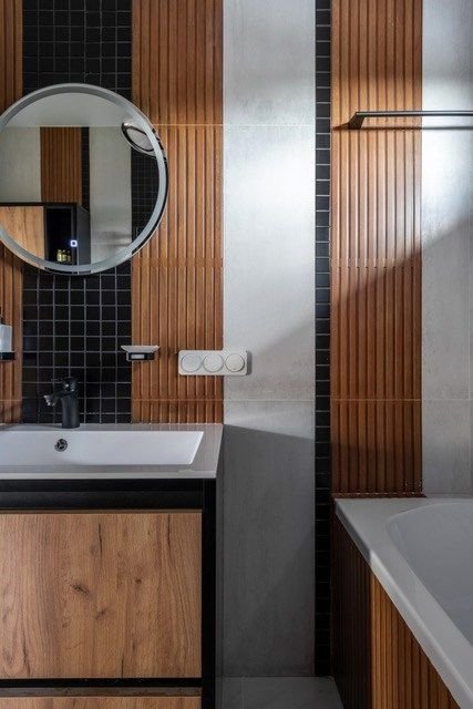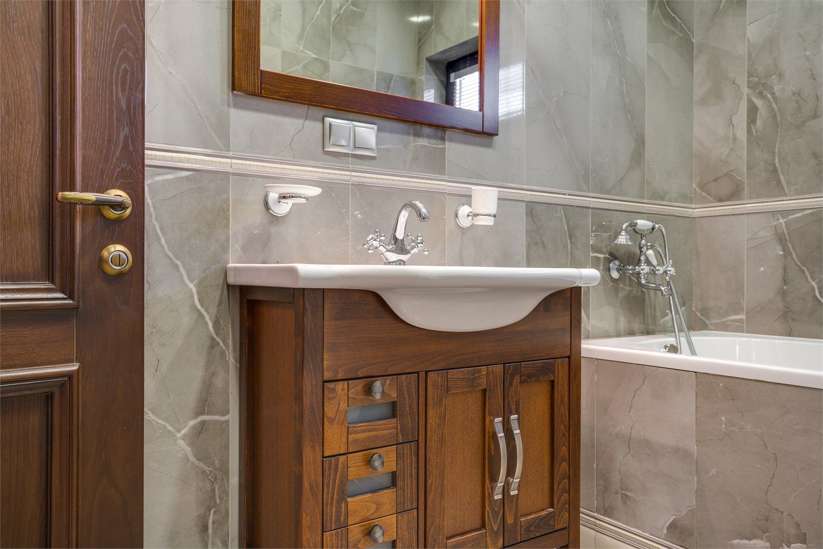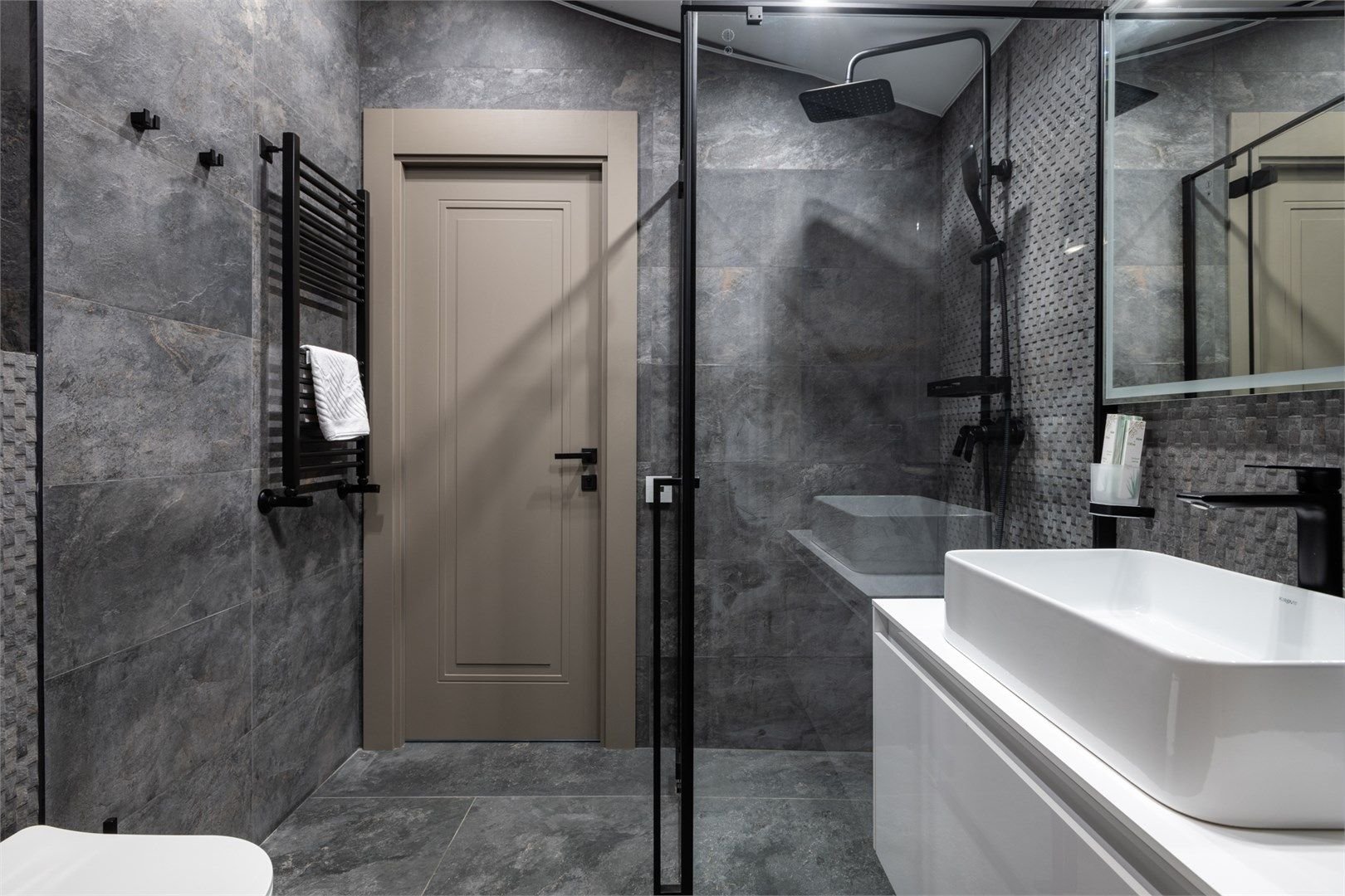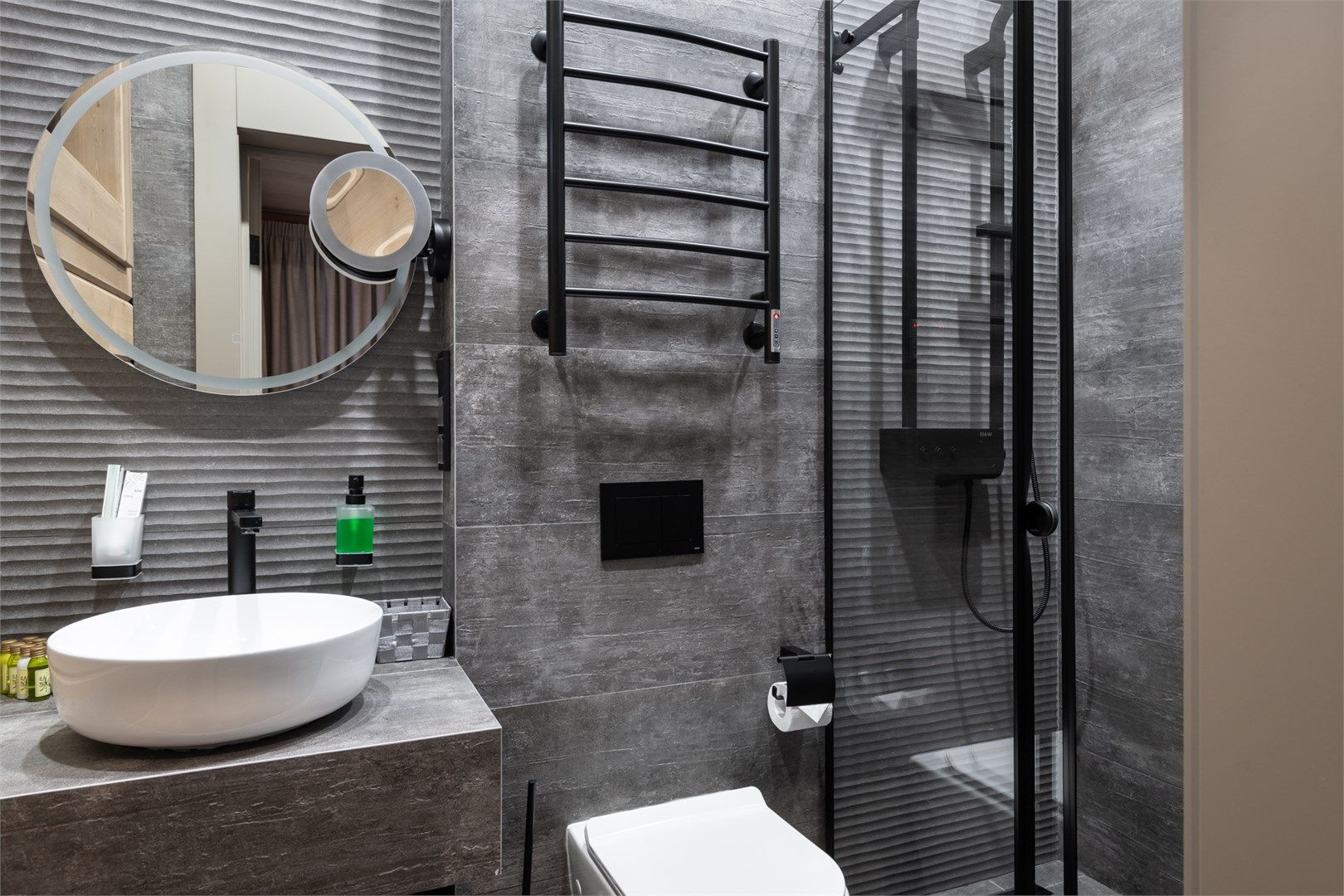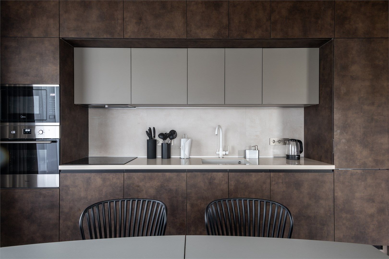 Коттедж площадью 94 кв.м с мебелью в темных тонах (2 спальни с кроватями Queen size, кухня, гостиная, прихожая, холл, санузел с душевой кабиной, туалетная комната, просторная терраса с садовой мебелью).