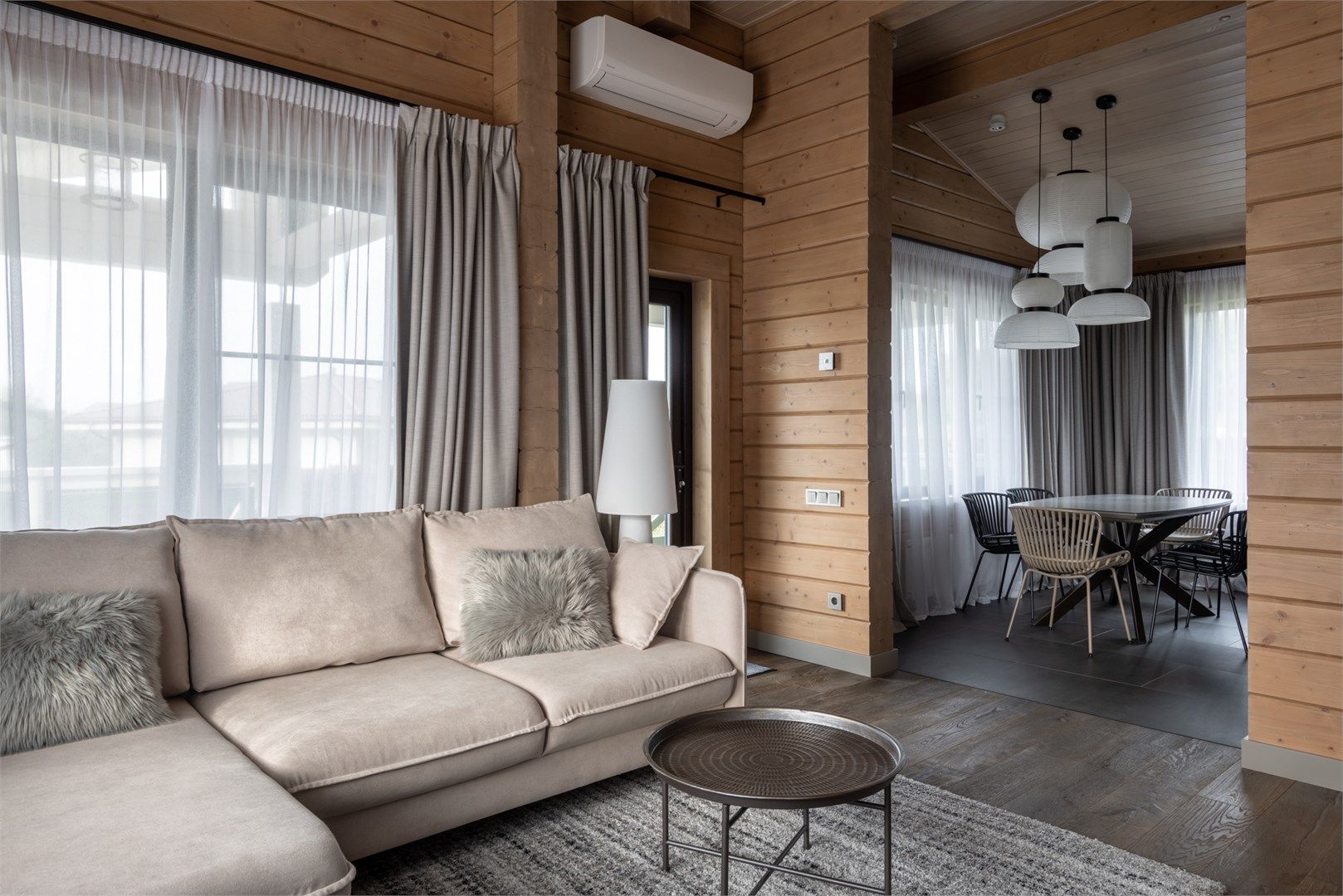 VIP коттедж с дизайнерским решением обустройства интерьера площадью 100 кв.м с кондиционером с общим пространством кухни-столовой и гостиной, освещенной окнами "второго света" (2 спальни, кухня-столовая, гостиная, холл, два санузла, терраса с садовой мебелью).
